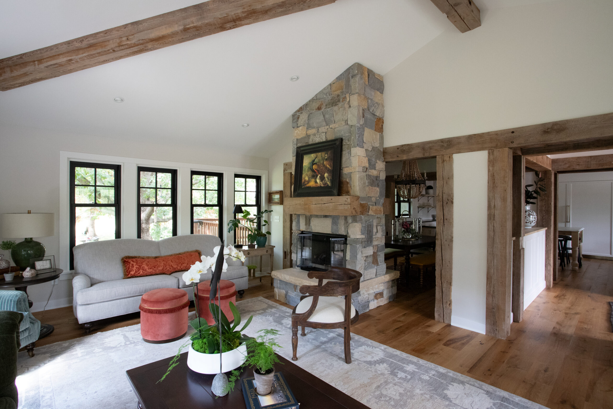 Inspired by the European French countryside and Scandinavian influences, the design embraced natural light while creating a seamless connection to the outdoors. The original layout of the home lacked defined spaces and featured outdated finishes. Instead of further opening the space, the team opted to create a cozier, more intimate atmosphere using reclaimed beams from centuries-old structures, adding both character and history to the home.