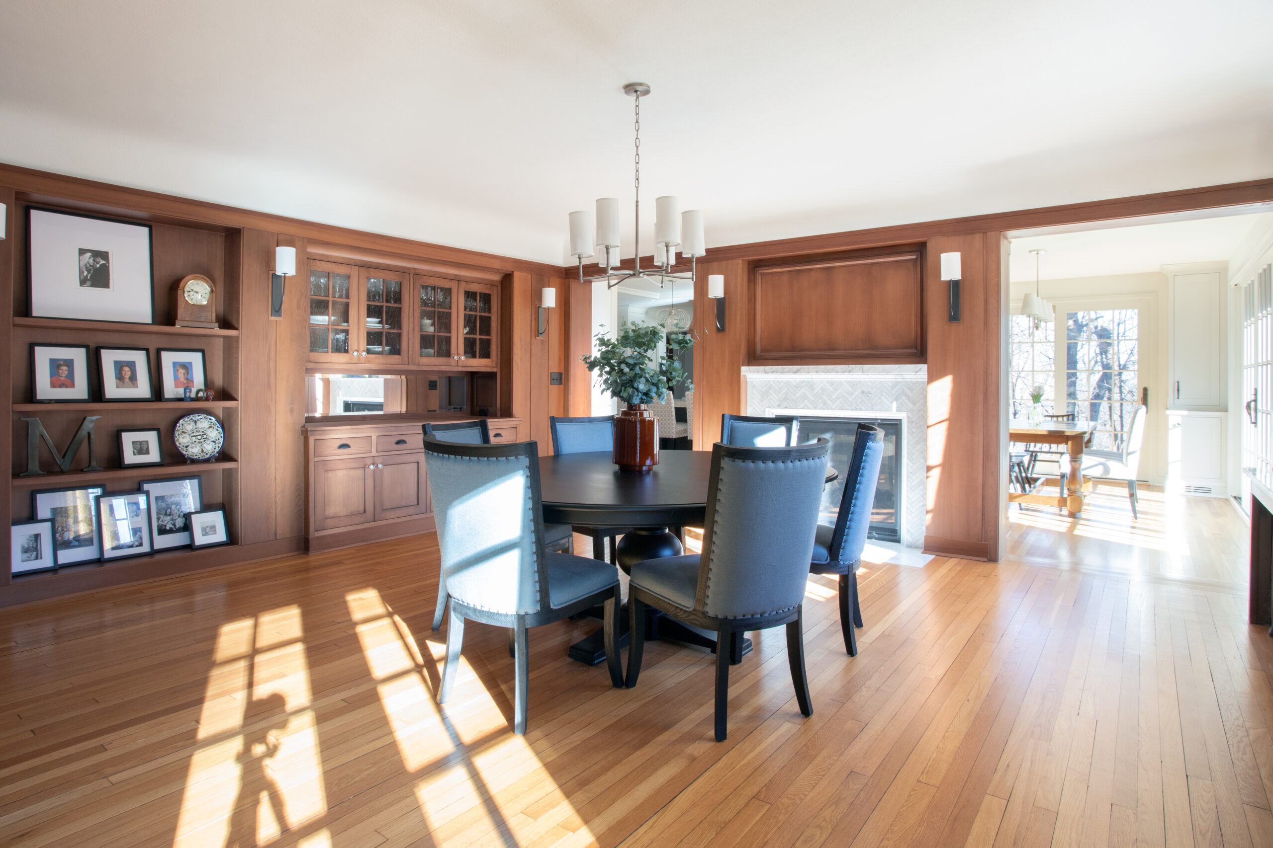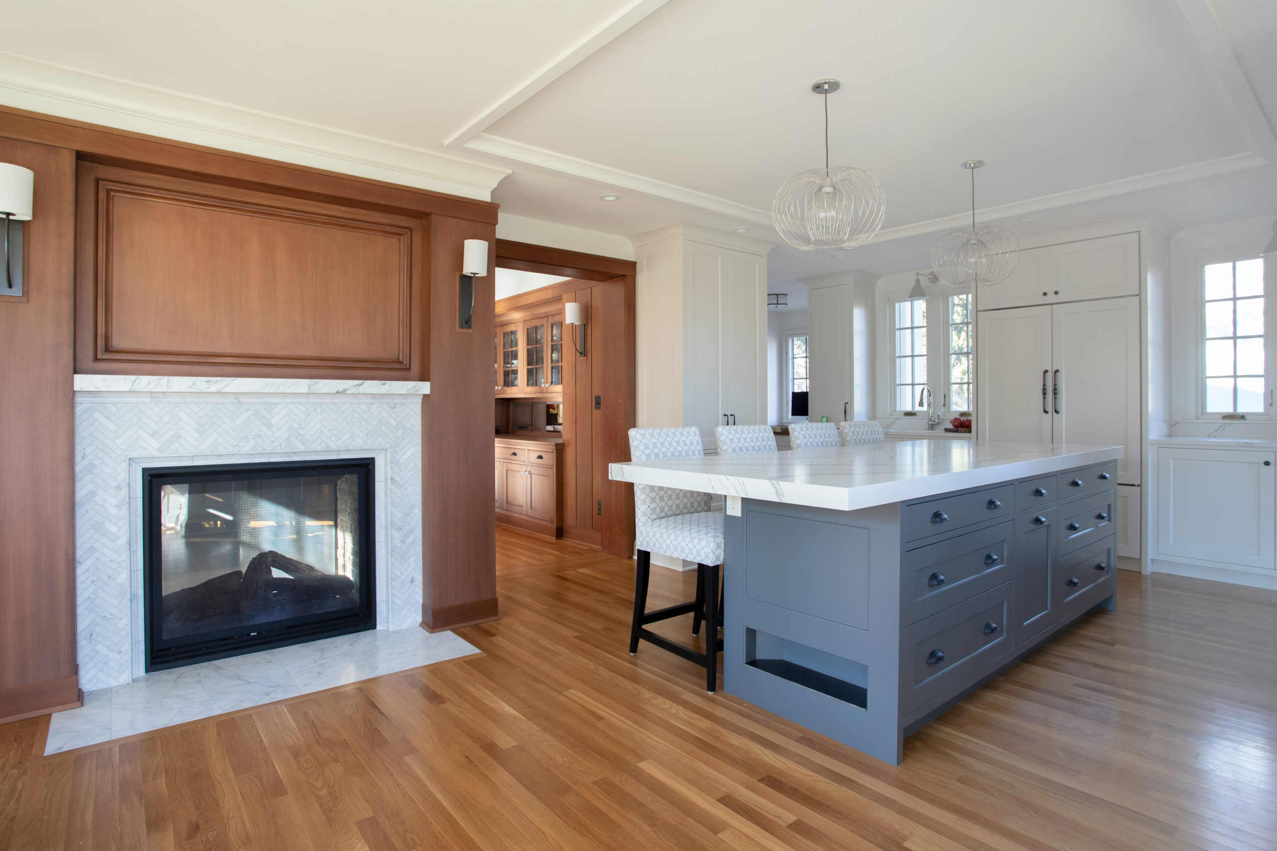 This beautiful 1923 English Cottage’s new design optimizes the home’s layout and functionality while preserving its original character. A botanical marble mosaic backsplash and stained fir hood bring natural elements to the kitchen and complement the home’s nature-inspired color palette. Brittanica Cambria counters and a built-in footrest on the kitchen island create an elevated personalized experience for the homeowners. Outside of the kitchen, the home’s original wood paneling was carefully restored back its original luster to seamlessly blend with new custom cabinetry. A large sliding French door and canopy creates a stronger connection between the kitchen and adjacent living room and the sweeping views of the St. Paul buffs.