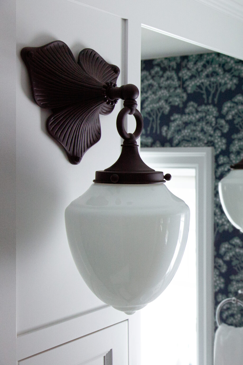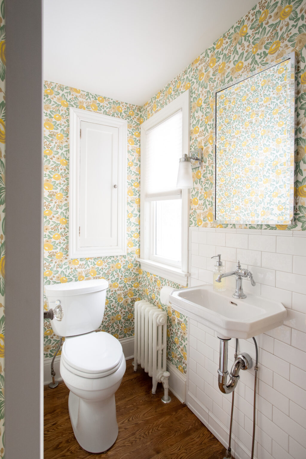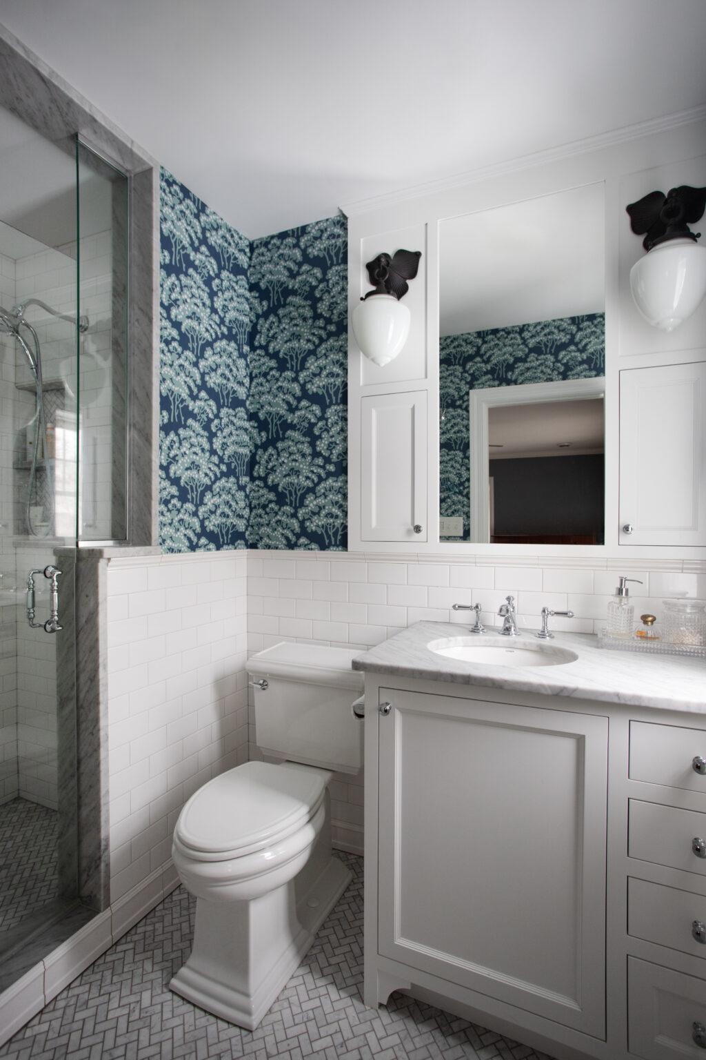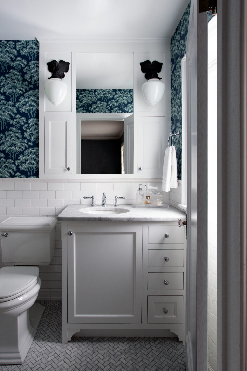 These Cedar Lake bathrooms are all about the details; an eye-catching patterned wallpaper, unique mounted sconces, and chevron marble floor tiles create a space full of subtle visual interest in the primary bathroom, while sunny yellow wallpaper and warm wood floors create a contrasting, yet complementary, powder room.