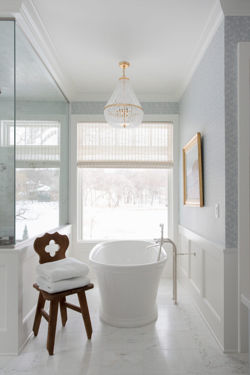 This traditional colonial-style primary bath features light, aquatic colors for a cool & clean feel. Gold and polished nickel accents blend seamlessly with subtly intricate patterns and tile details, including a breathtaking Walker Zanger Tangent Ipanema Mosaic shower accent tile, in this sophisticated primary bathroom.