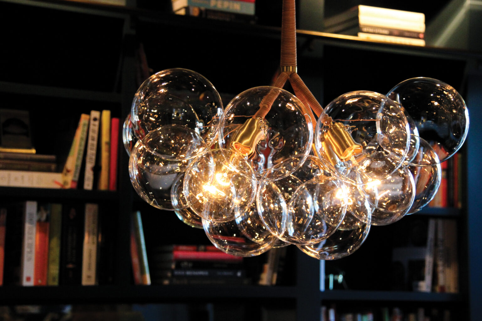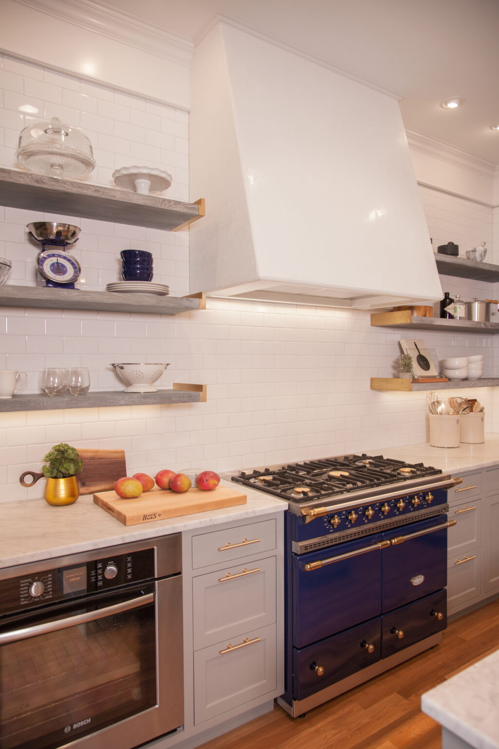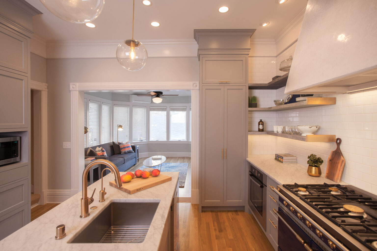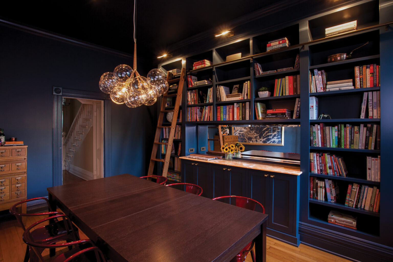 This kitchen and dining room blend modern style with historic character. Open cerused oak shelving and white subway tile give the kitchen an airy feel, while a handmade Venetian plaster hood and custom brass shelf ends add an old-world touch. In the dining room, deep blue walls, a laddered bookshelf, and a handmade chandelier carry the same refined, timeless spirit.