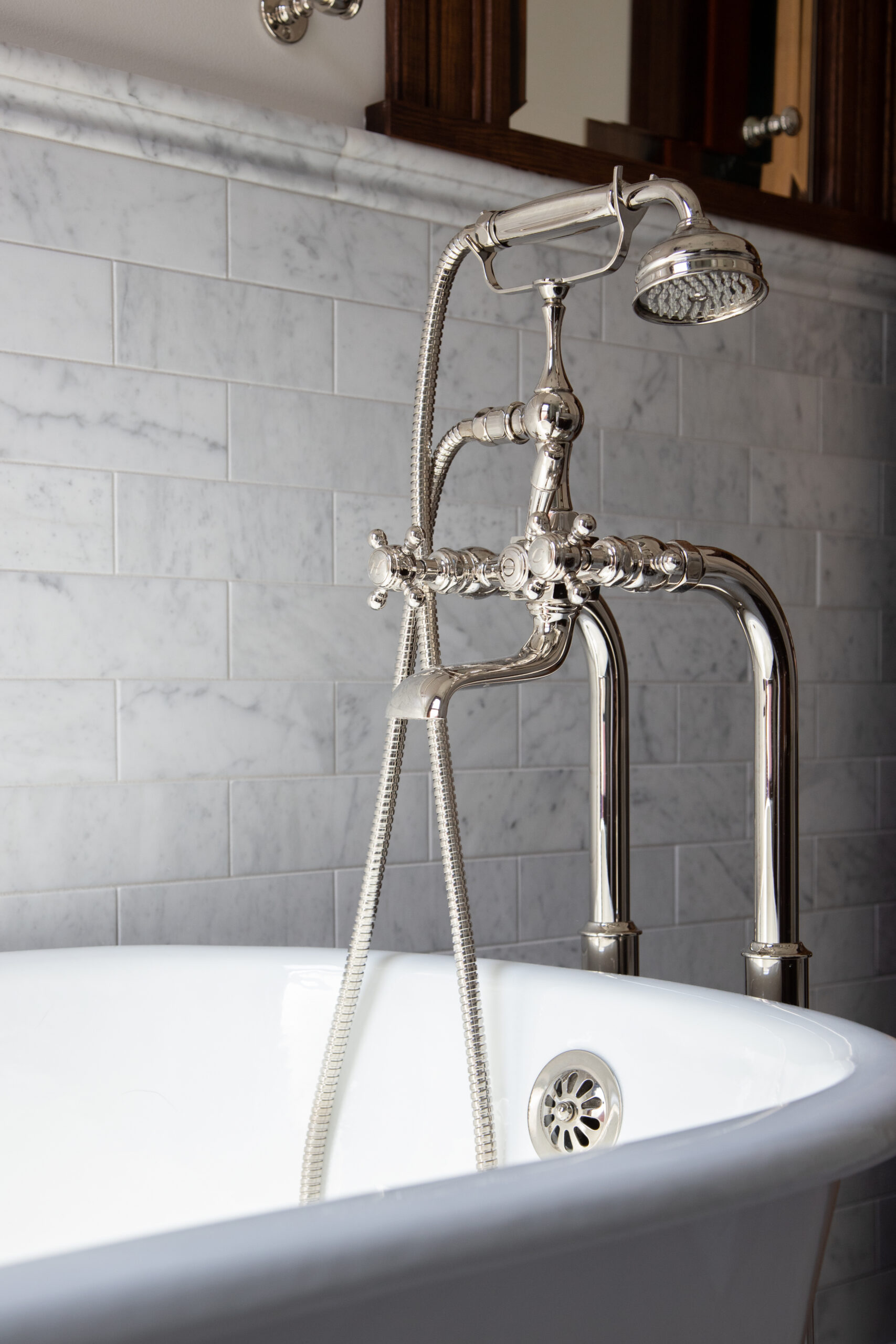 The Traditional Bathroom Revival creates modern updates in this space while preserving its charming historic feel. White Carrera marble countertops and tile accent rich, dark cabinetry for a fresh, bright feel. Traditional plumbing fixtures highlight the historic features of this bathroom.