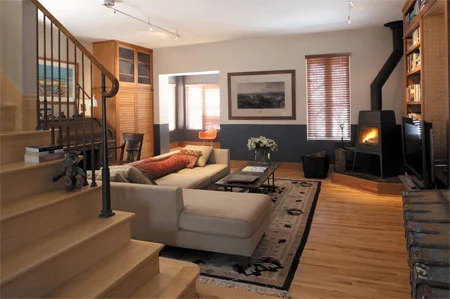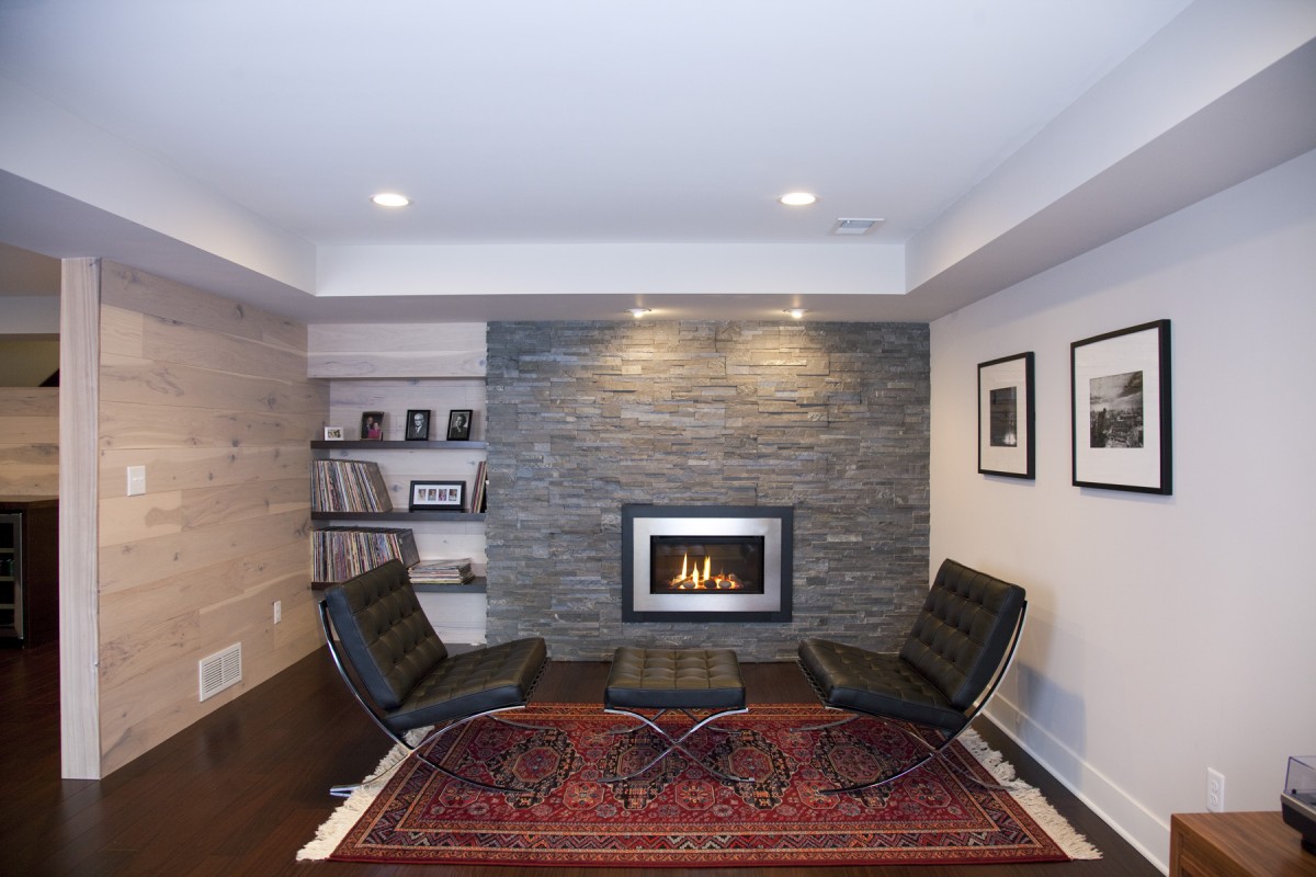 The owners of this home desired to update their 1970s-style basement to fit continuously with the midcentury modern aesthetic of the rest of their home. The popcorn ceiling and old carpet were removed, and restructured duct work created an intentional design for the ceiling. New Peruvian walnut flooring and a new fireplace insert with surrounding stone create a simple, modern look in keeping with the tastes of the homeowners and style of the home. Details like the bar area and hickory wall paneling (actually flooring put on the wall) provide them with a customized space that is uniquely their own.
