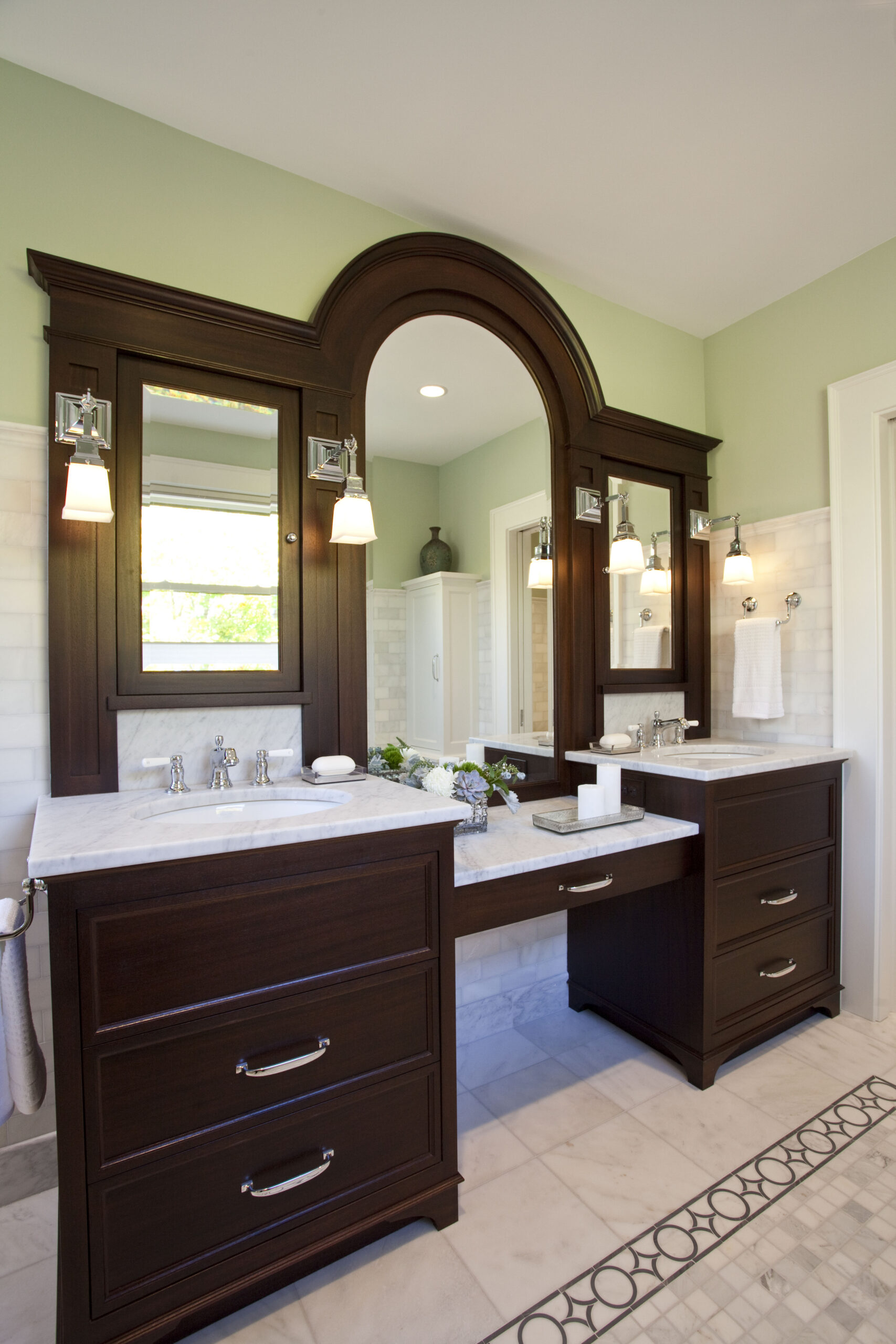 The owners of this eclectic home desired a bright, modern master bathroom that tied into the unique character of their home. Our designers answered the call by creating curved walls and vanities to match the home’s curved exterior walls, and by using rich textures like burled walnut and painted sinks to match the home’s faux-painted interior. The result is a strikingly unique bathroom with a flavor that jives with the rest of their funky and eclectic home.