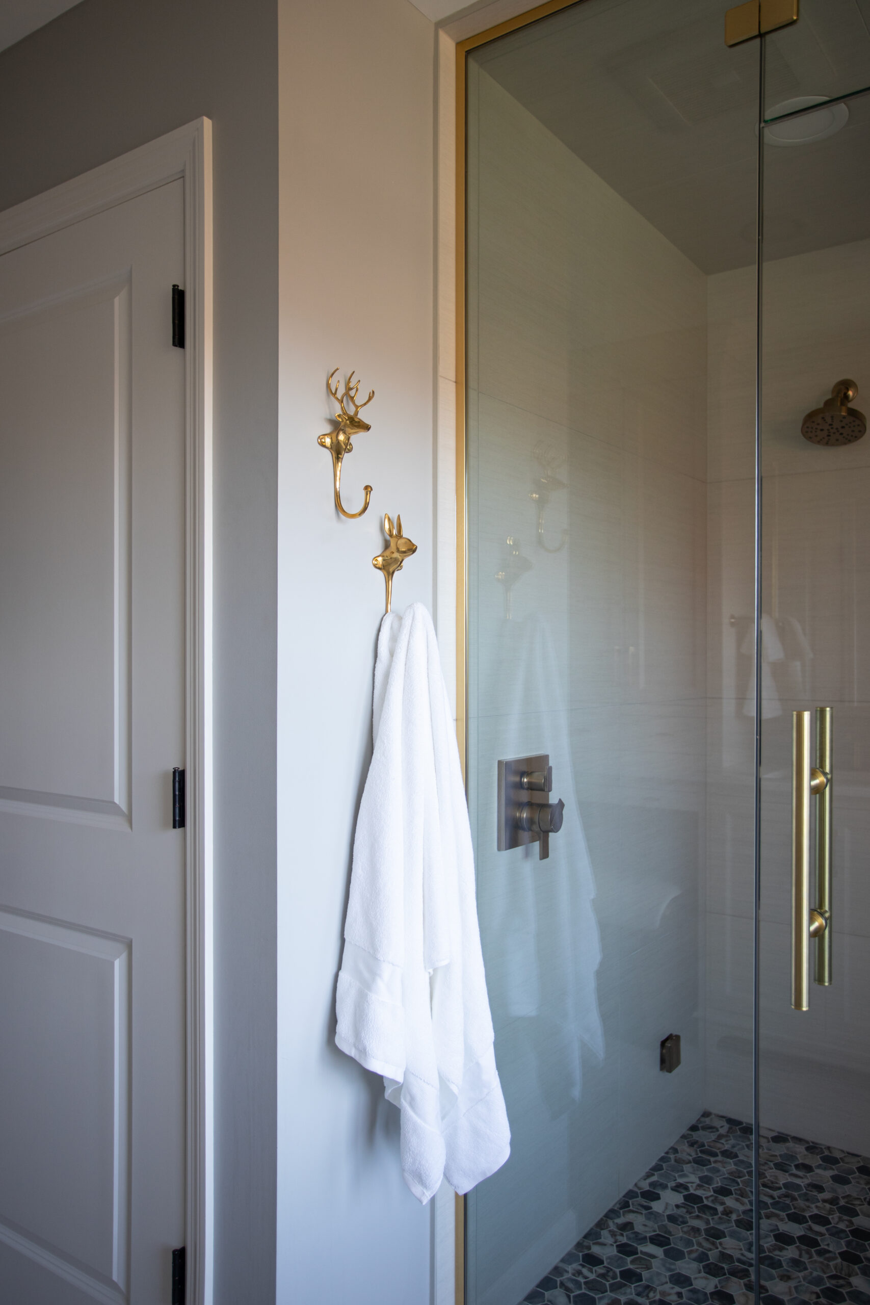 To make the Maple Grove Mosaic Bath feel intentionally customized for the homeowners, Laura asked what wasn’t working in the old space. “Storage was a big issue,” she says, “so we focused on ways to maximize storage to their needs in their new space.” Both sides of the vanity include laundry hampers, with the center cabinets including a custom-built hidden hot tool pull-out, a folding mirror, and a make-up drawer. Laura enjoys balancing practical design solutions with moments of personality, so when the homeowners asked her about incorporating gold animal-themed wall hooks in the space, her answer was an immediate “yes!”