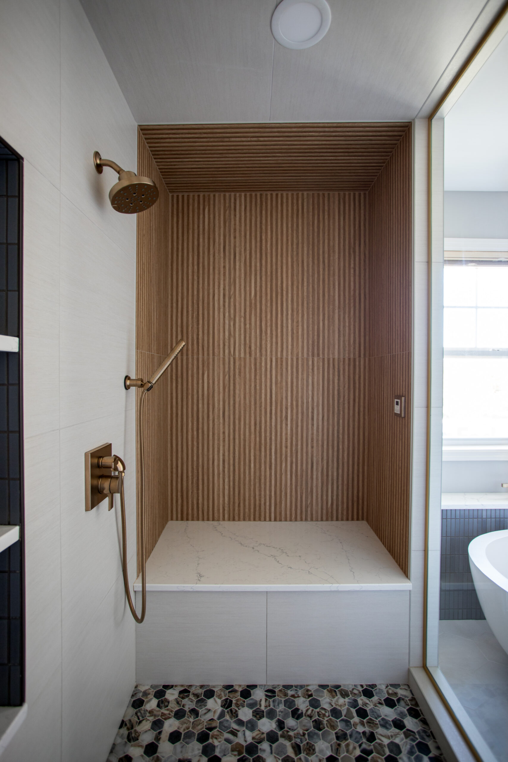 One of Laura’s recent projects, the Maple Grove Mosaic Bath, stands out as an especially exciting collaboration between Laura and the homeowner. This stunning primary suite remodel features a soothing, muted color palette and bold finishes for homeowners who want timeless functionality in their space without losing the fun of great design. “We knew that pattern would play a big role in the design, but did not want it to feel overwhelming for the space,” says Laura. She explains that they decided on “incorporating geometric shapes throughout the space, like the hexagonal floor tiling and blue kite-shaped tile backsplash above the double vanity.” A defining feature of the suite is the slat tile in the shower alcove. “Being a steam shower, we wanted to accentuate this area and create a spa-like experience,” explains Laura.