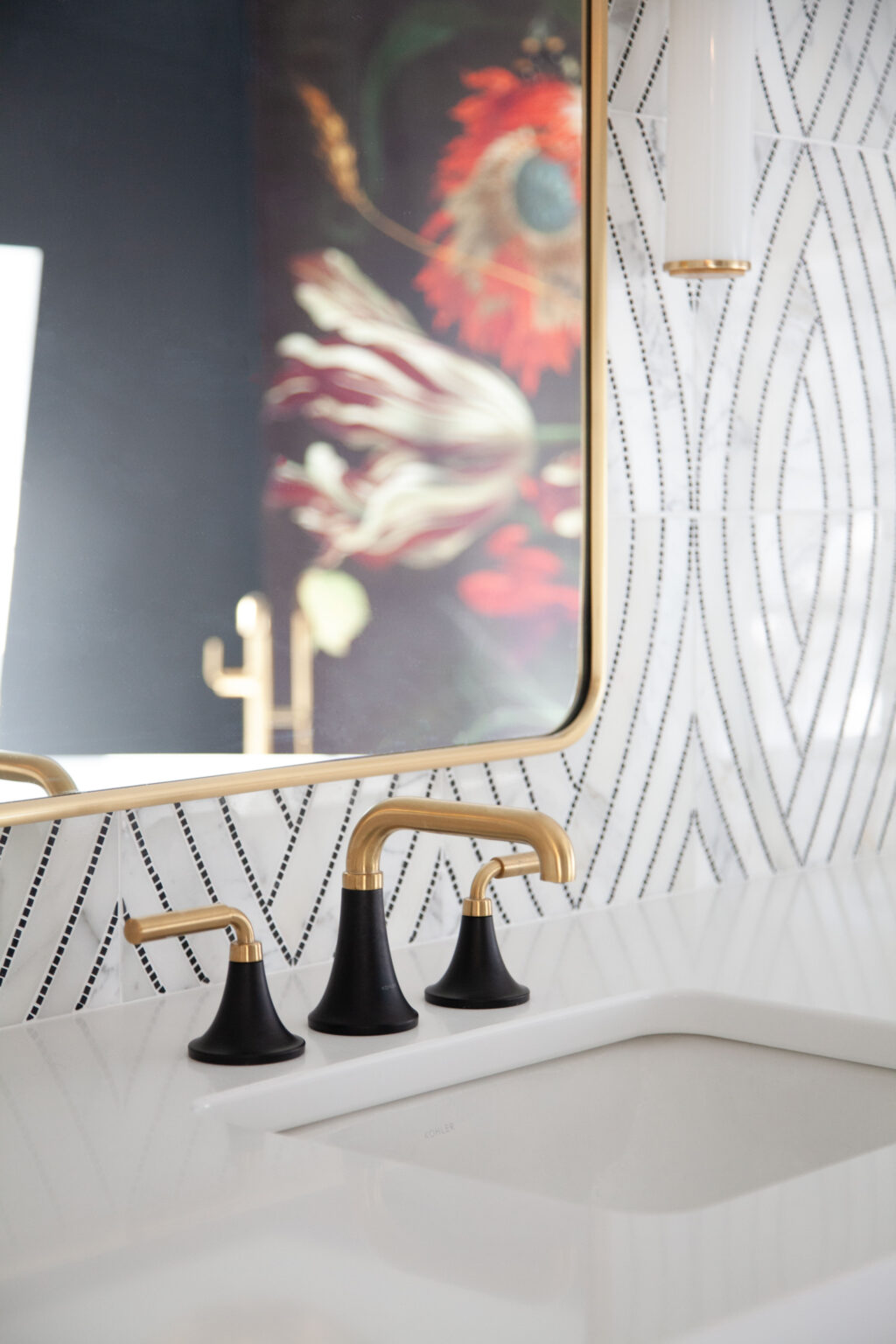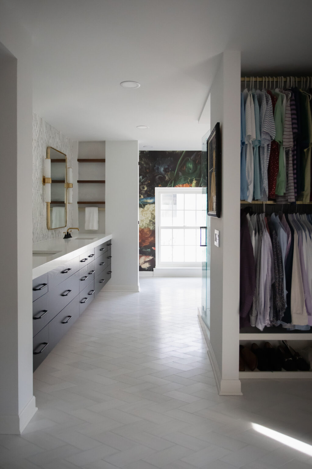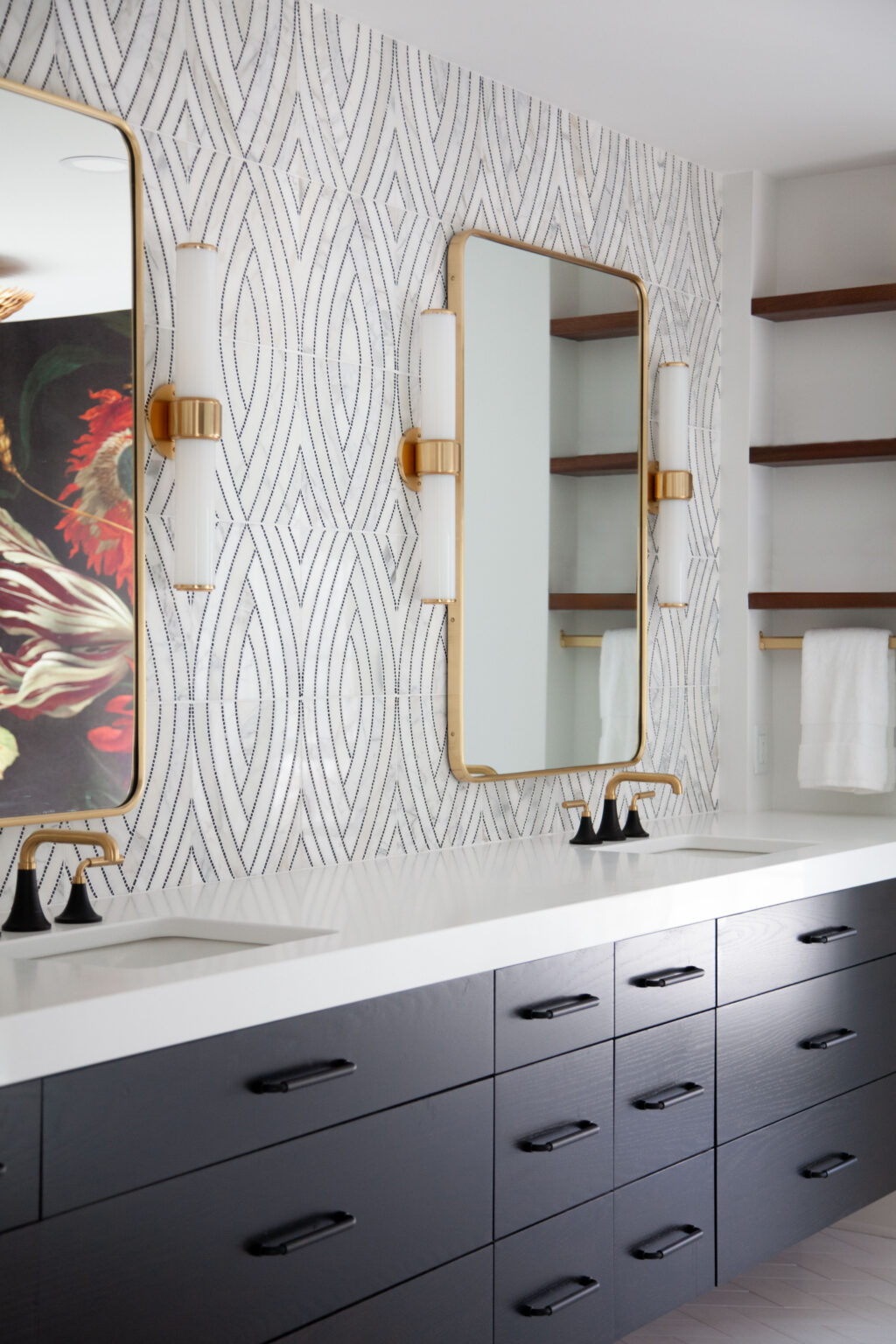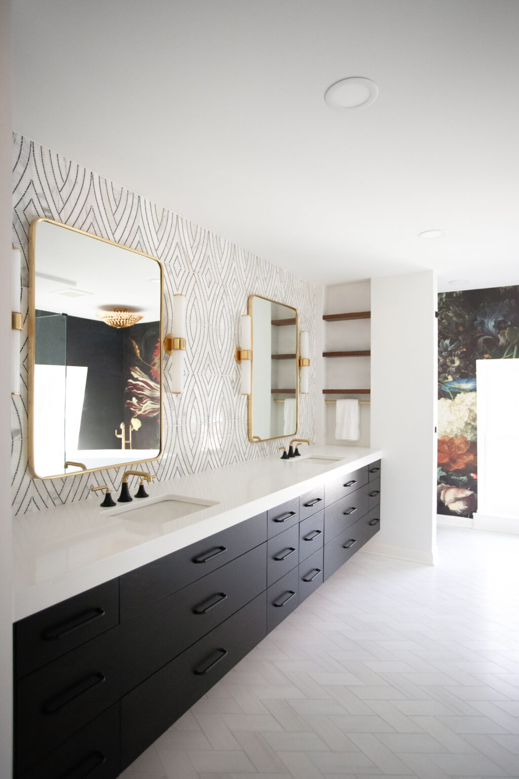This primary suite remodel in Minneapolis’s vibrant Cedar-Isles-Dean neighborhood embraces bold, artistic designs, featuring a wallpaper mural of Jan Davidsz de Heem’s painting Vase of Flowers, aged brass accents, and polished marble mosaic tiling. Contrasting light and dark colors complement a mix of organic and angular designs, giving this space a glamorous, contemporary feel.