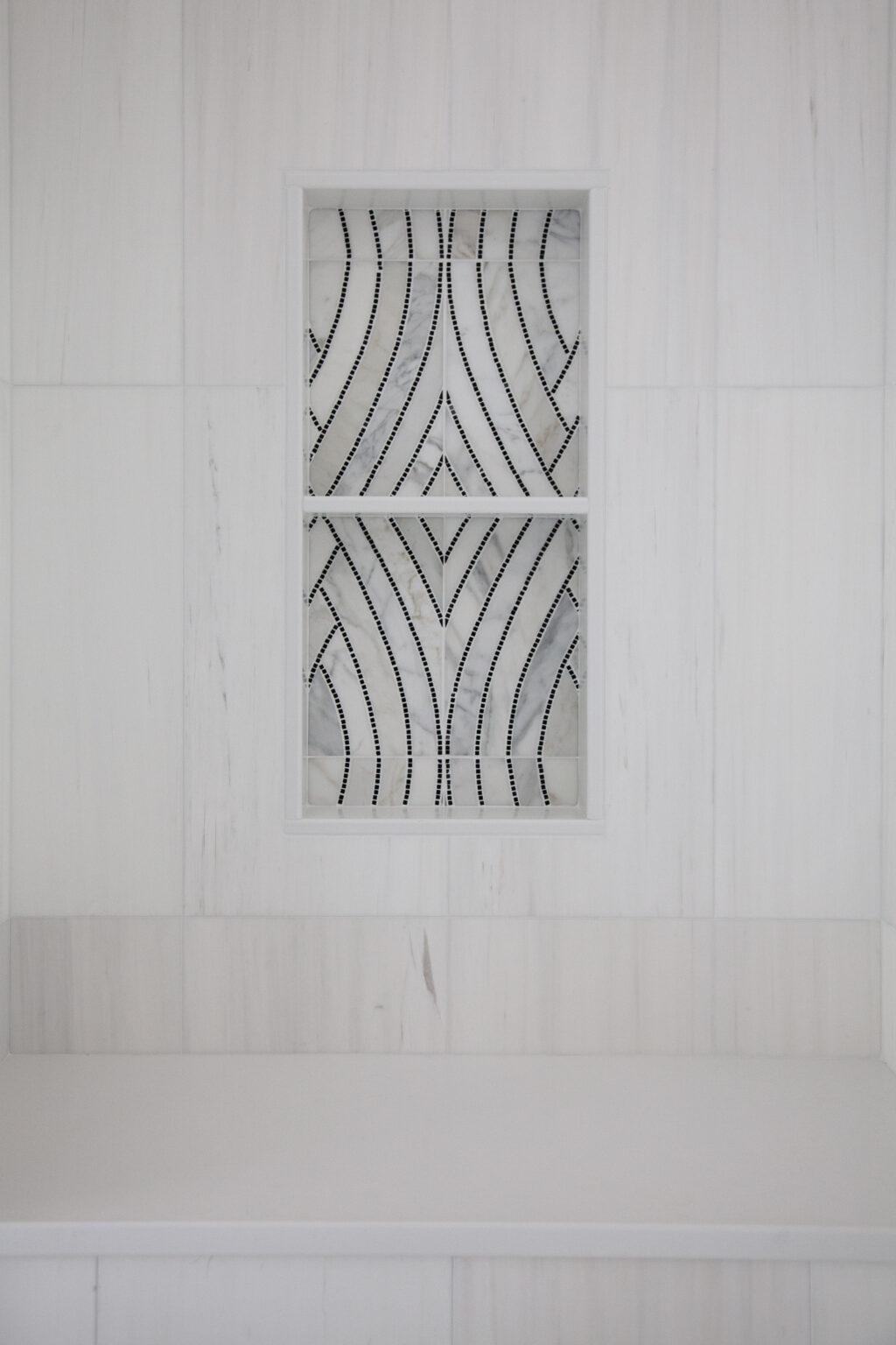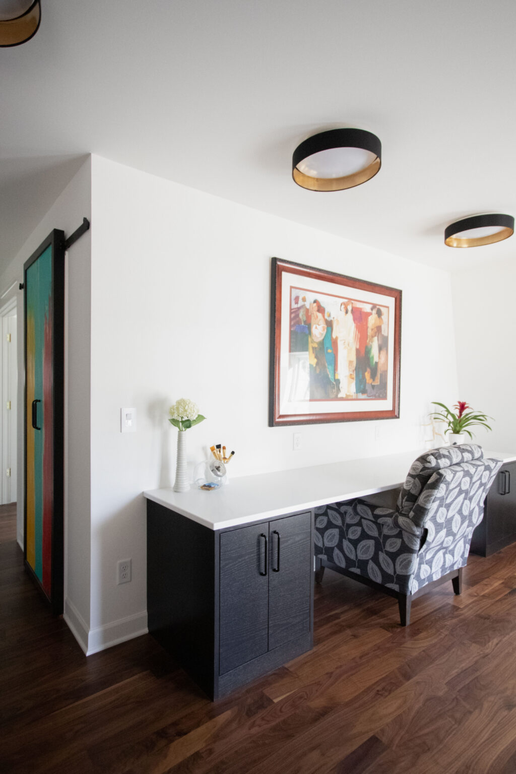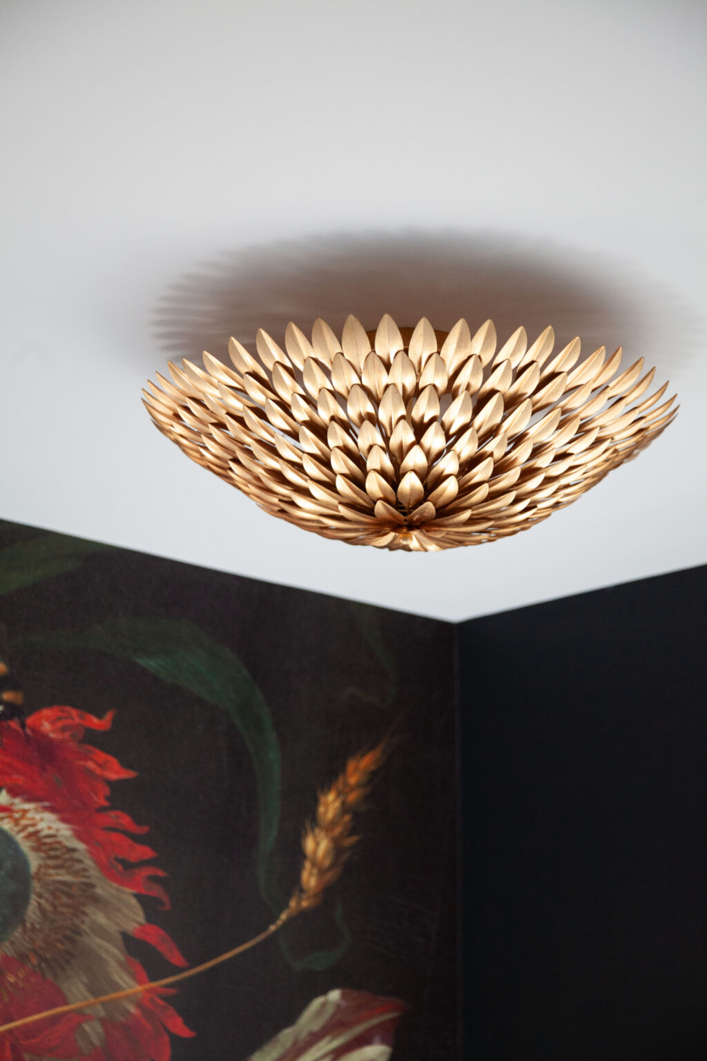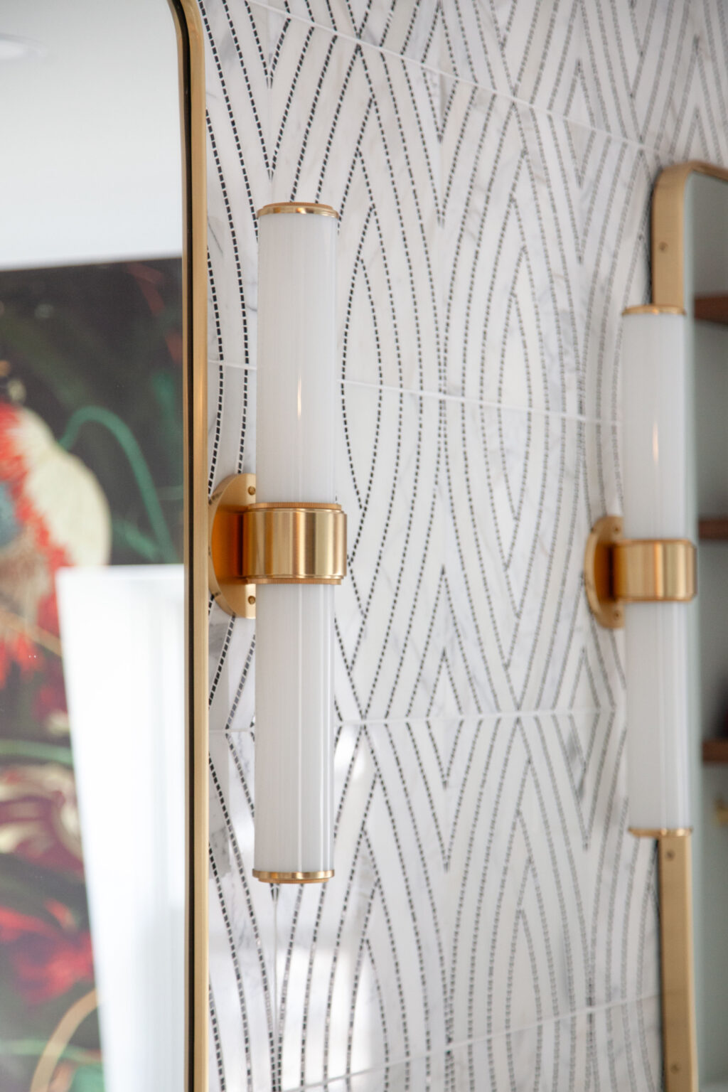 This primary suite remodel in Minneapolis’s vibrant Cedar-Isles-Dean neighborhood embraces bold, artistic designs, featuring a wallpaper mural of Jan Davidsz de Heem’s painting Vase of Flowers, aged brass accents, and polished marble mosaic tiling. Contrasting light and dark colors complement a mix of organic and angular designs, giving this space a glamorous, contemporary feel.