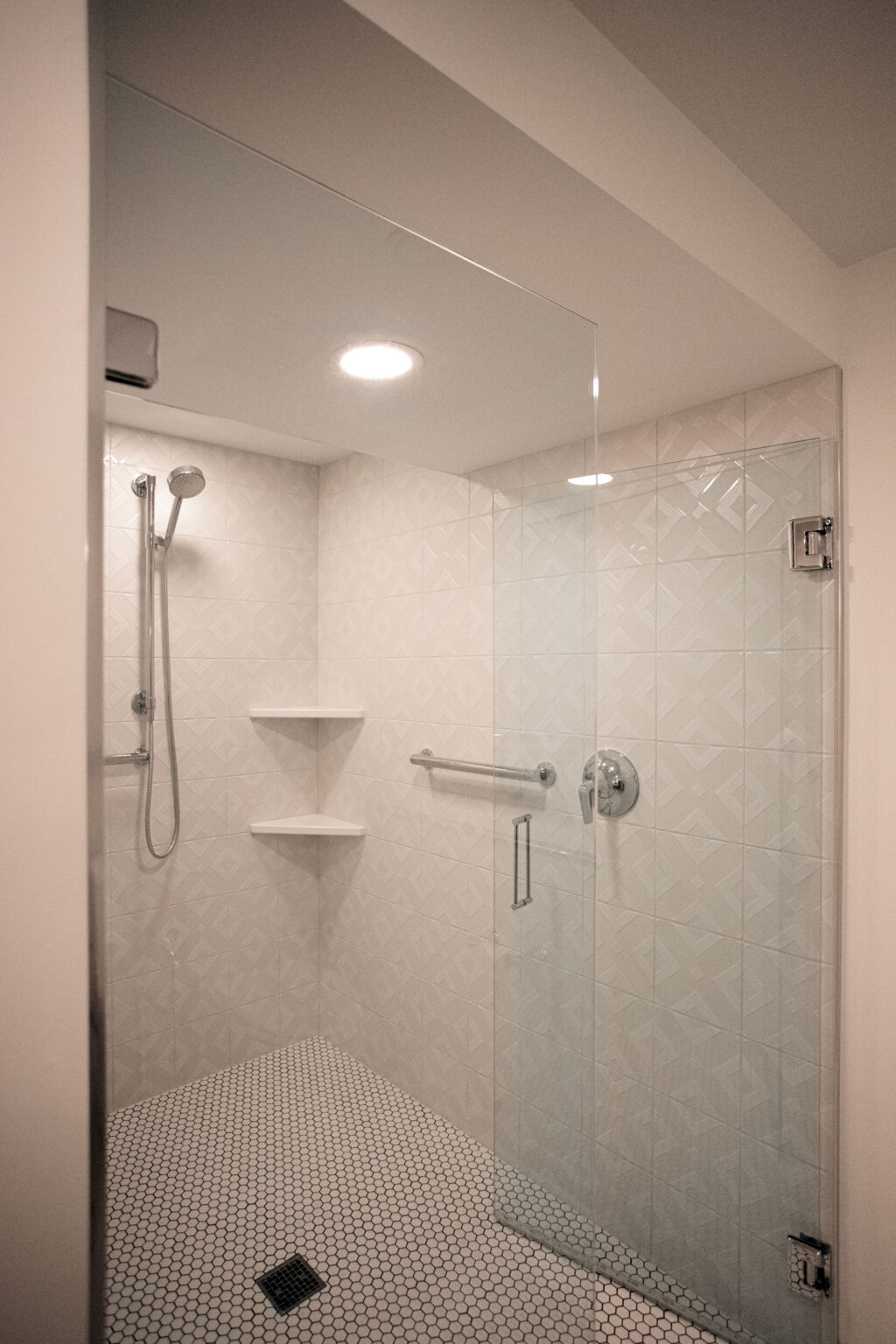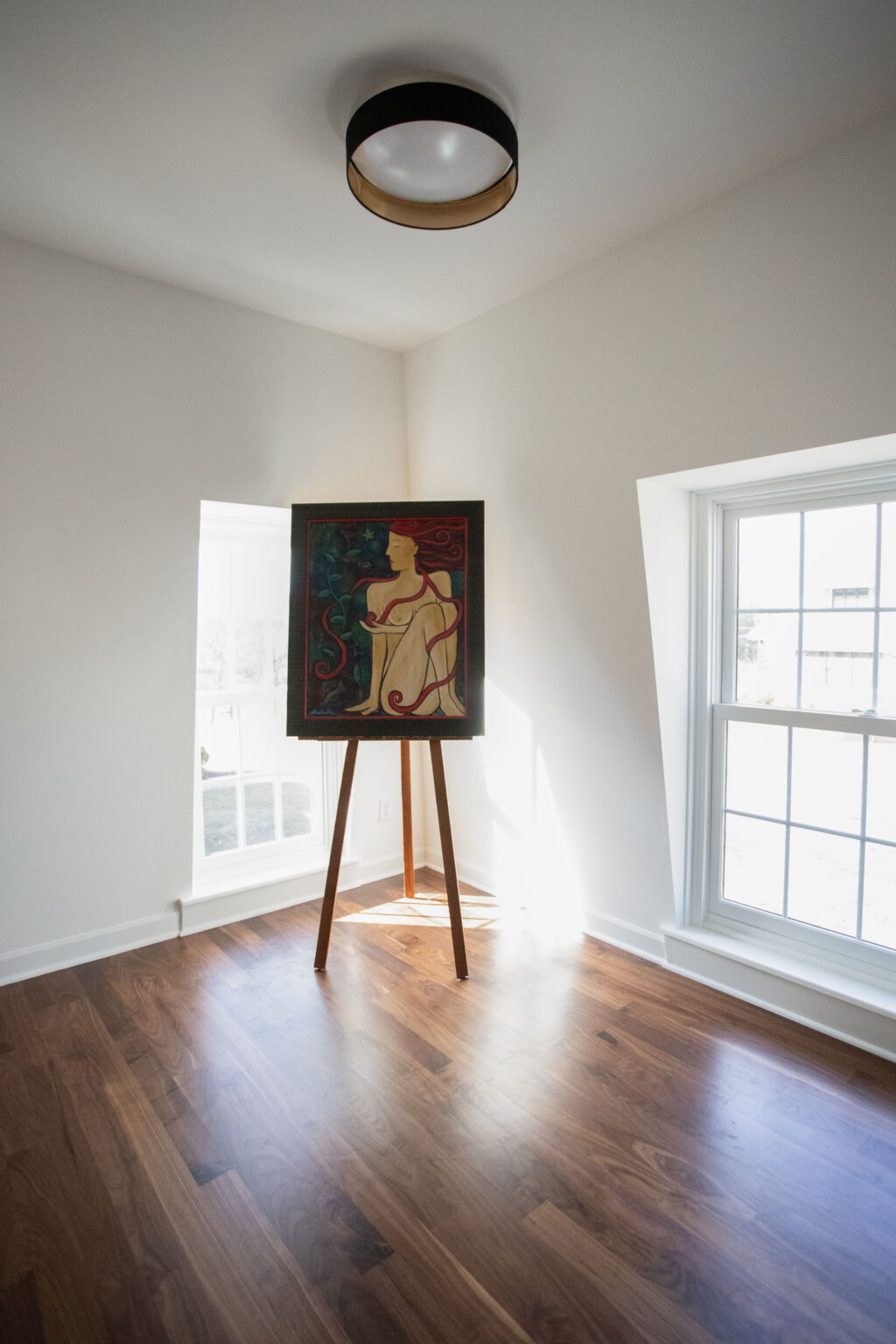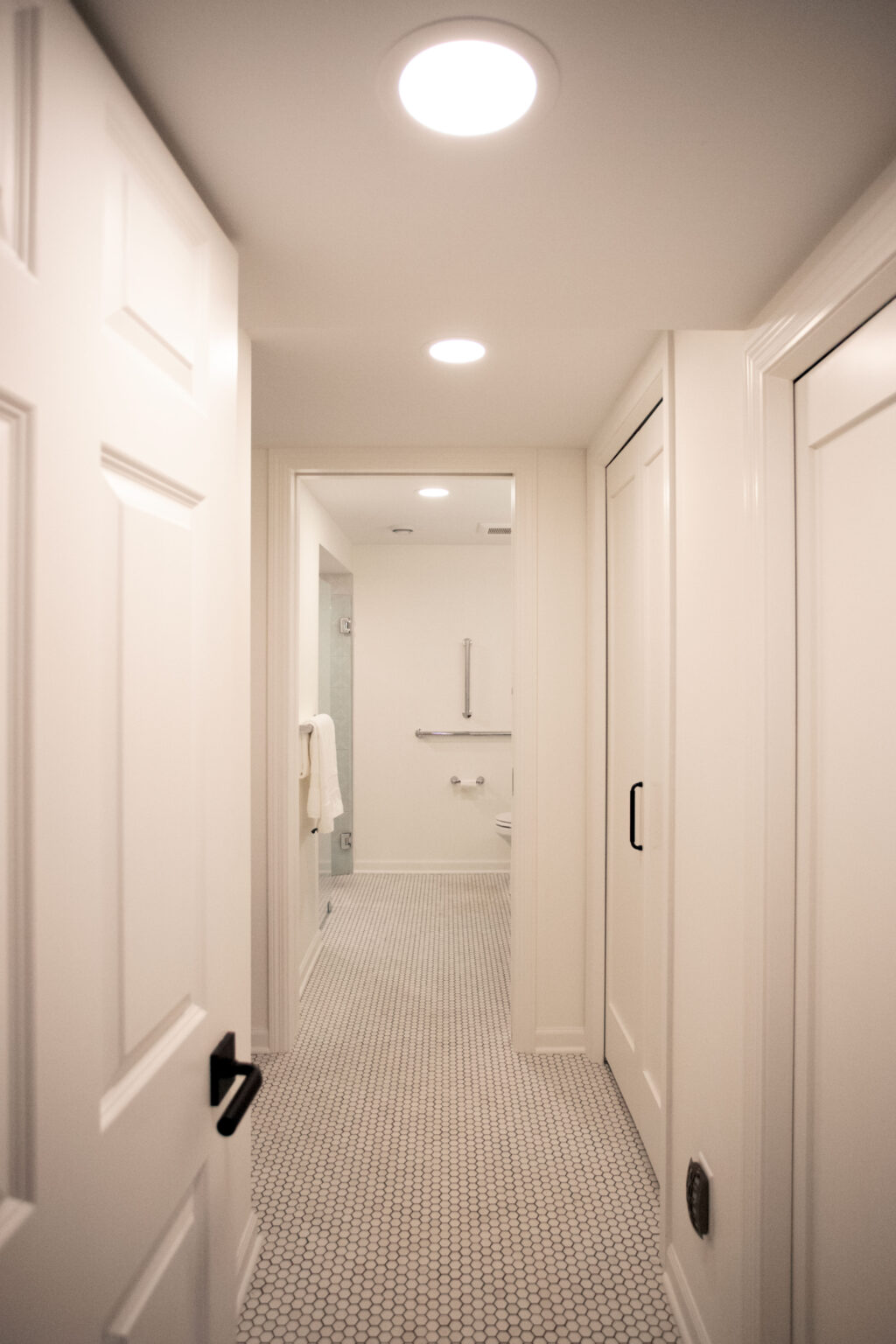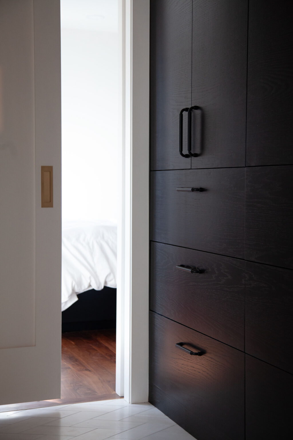 This primary suite remodel in Minneapolis’s vibrant Cedar-Isles-Dean neighborhood embraces bold, artistic designs, featuring a wallpaper mural of Jan Davidsz de Heem’s painting Vase of Flowers, aged brass accents, and polished marble mosaic tiling. Contrasting light and dark colors complement a mix of organic and angular designs, giving this space a glamorous, contemporary feel.