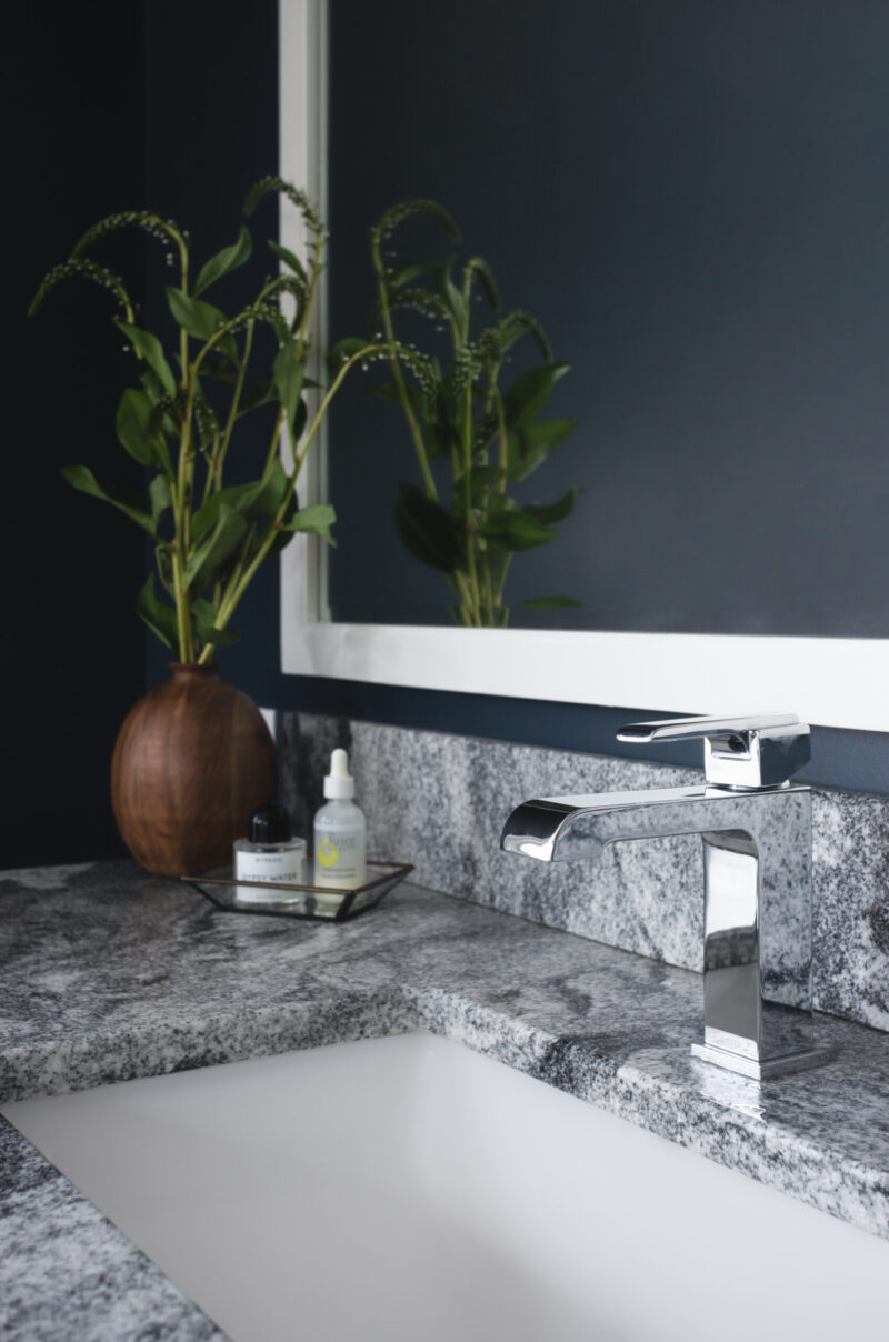 This primary suite combines a former office and cramped bath into a spacious, light-filled retreat. Natural light streams from a window above the soaking tub, while a frameless walk-in shower enhances openness. Navy walls, white tiles, black hex flooring, and exposed brick add contrast, texture, and warmth, blending traditional and modern details.