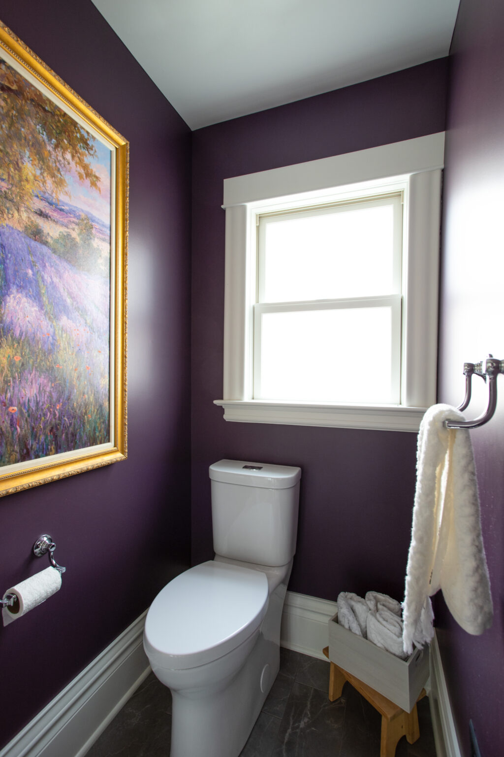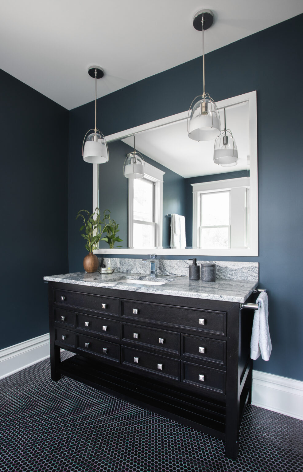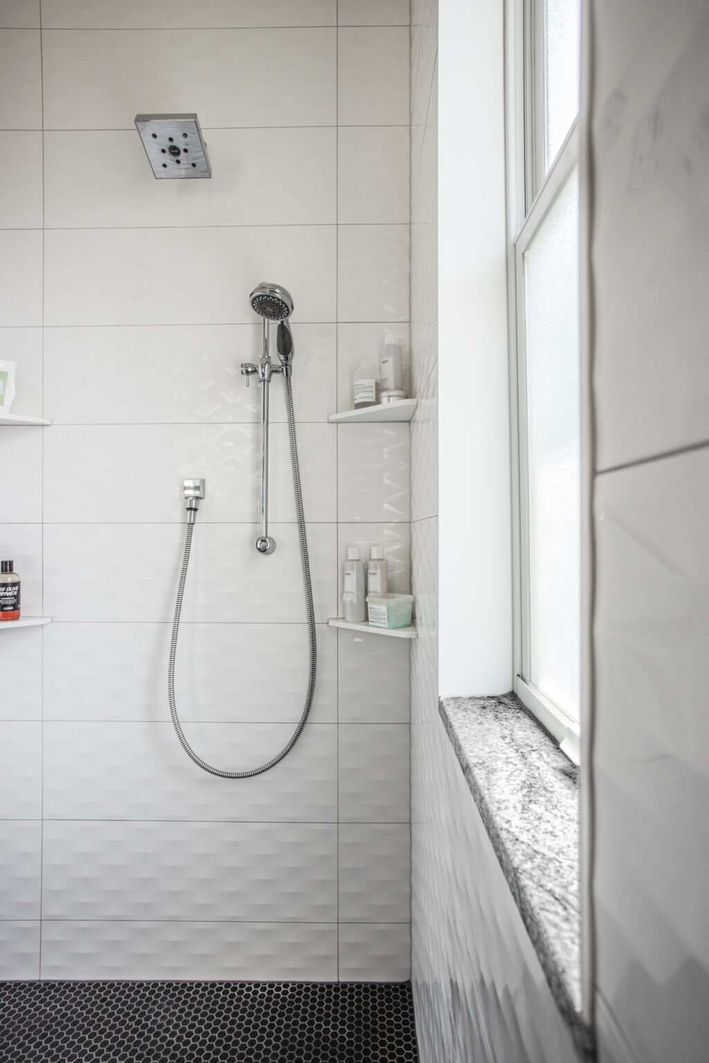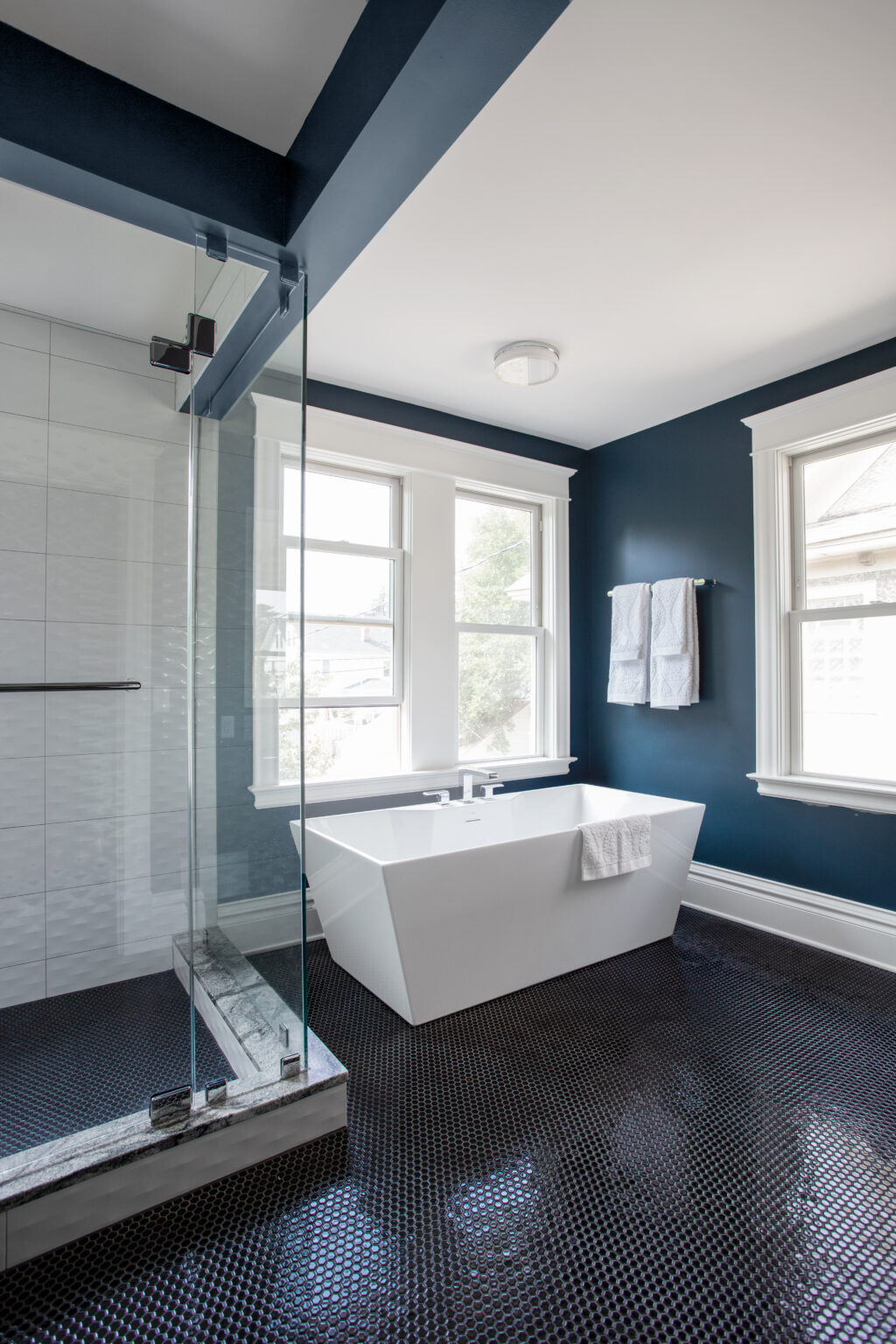 This primary suite combines a former office and cramped bath into a spacious, light-filled retreat. Natural light streams from a window above the soaking tub, while a frameless walk-in shower enhances openness. Navy walls, white tiles, black hex flooring, and exposed brick add contrast, texture, and warmth, blending traditional and modern details.