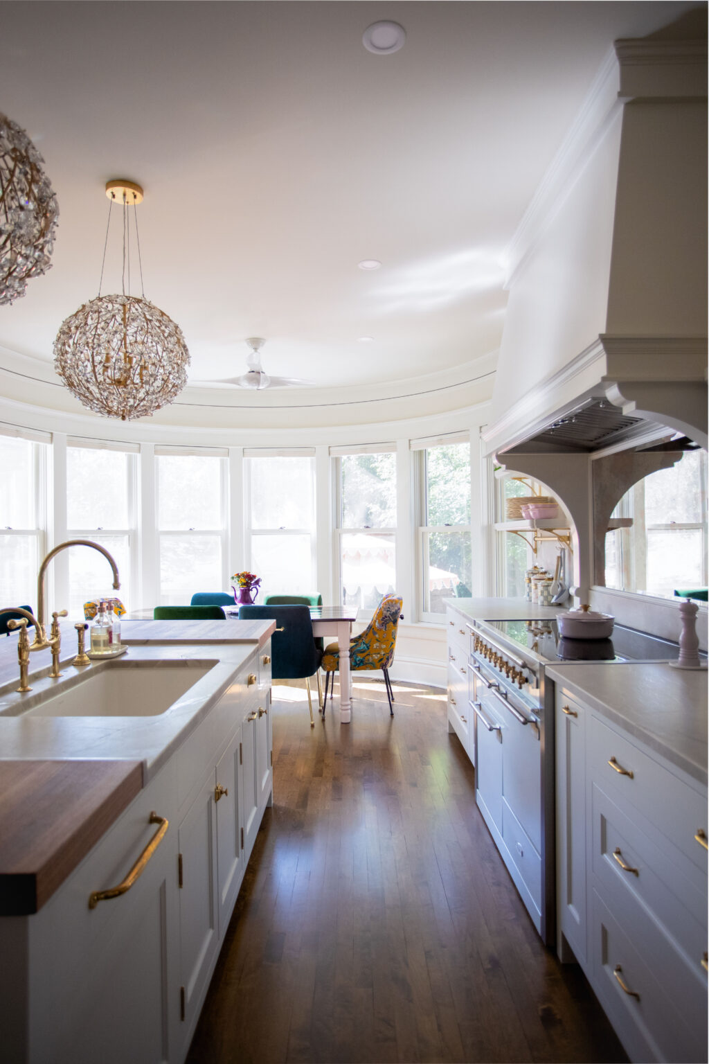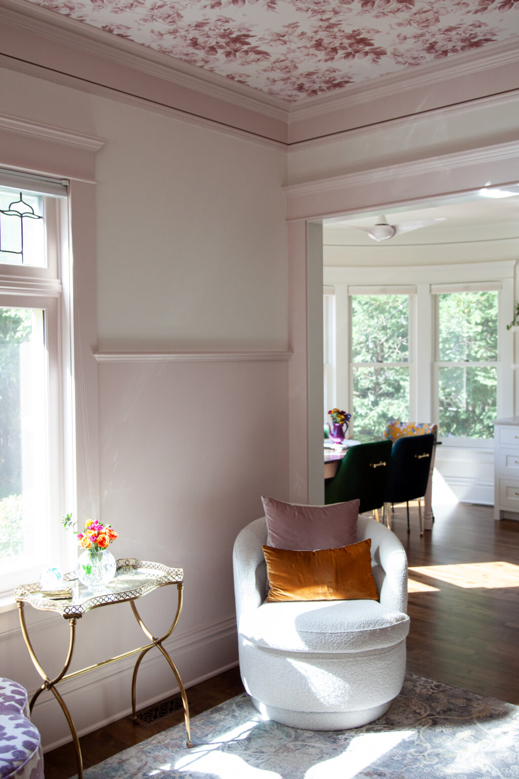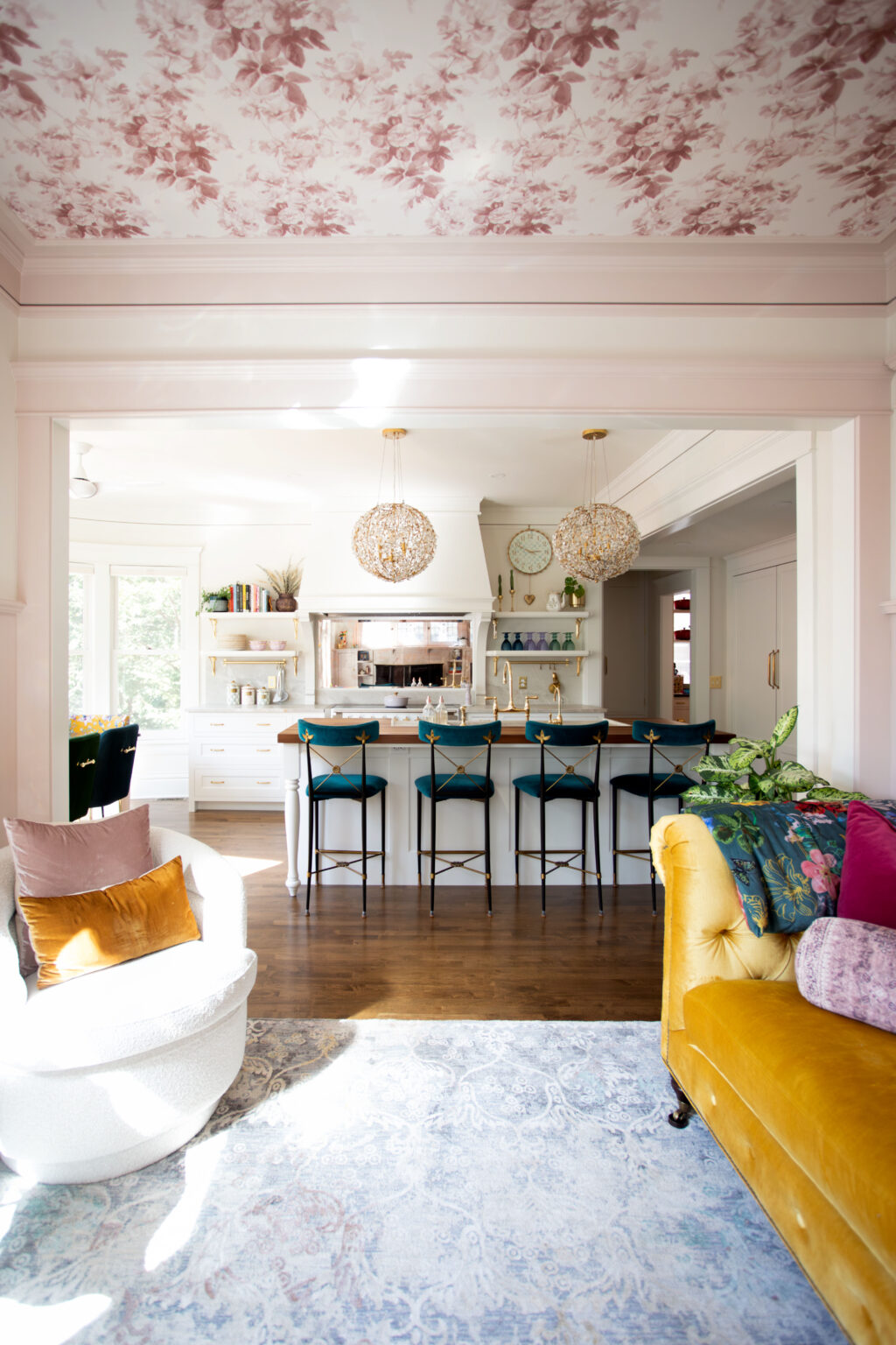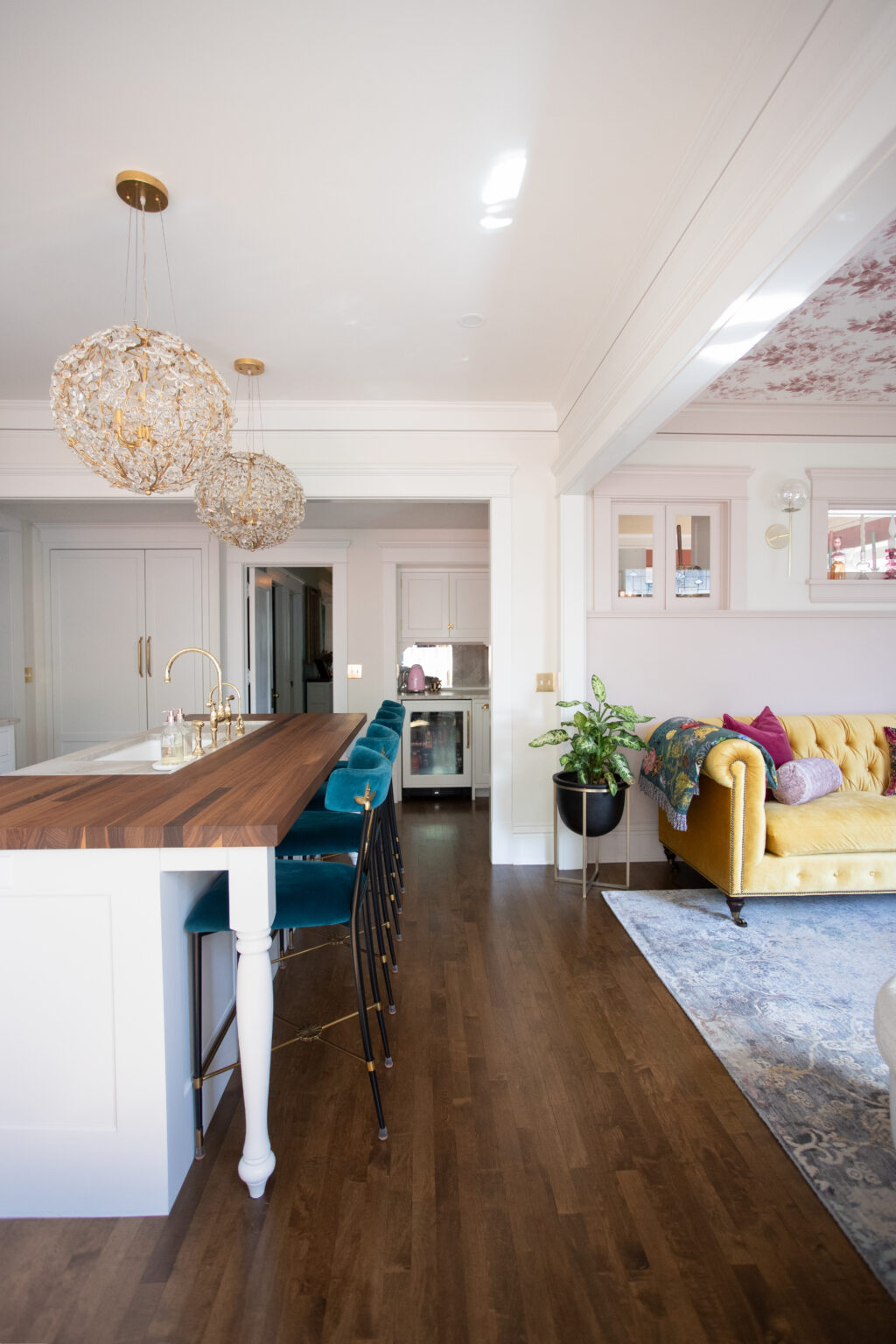 This remodel brings a bright, sweet feel to this Minneapolis home with blush pink wainscoting and ceiling wallpaper, white gem quartzite countertop, a butcher block island, and brass hardware finishes. Dreamy colorful accents in the kitchen, living room, and powder room give each space a distinct feel in a cohesive theme.