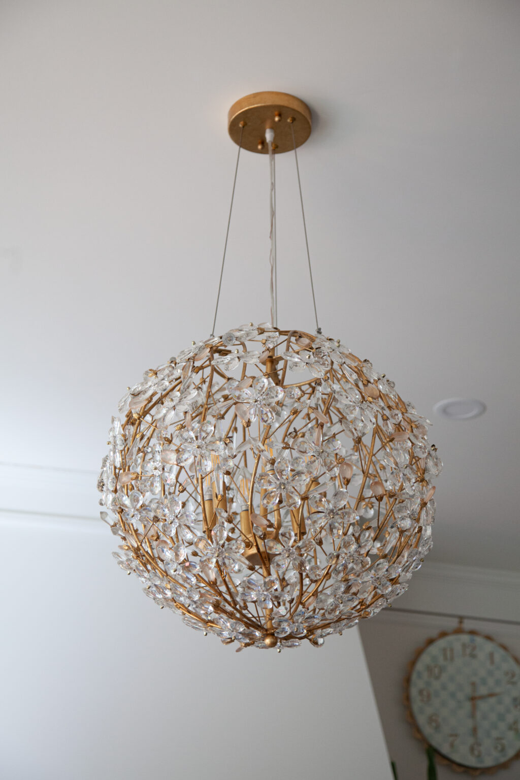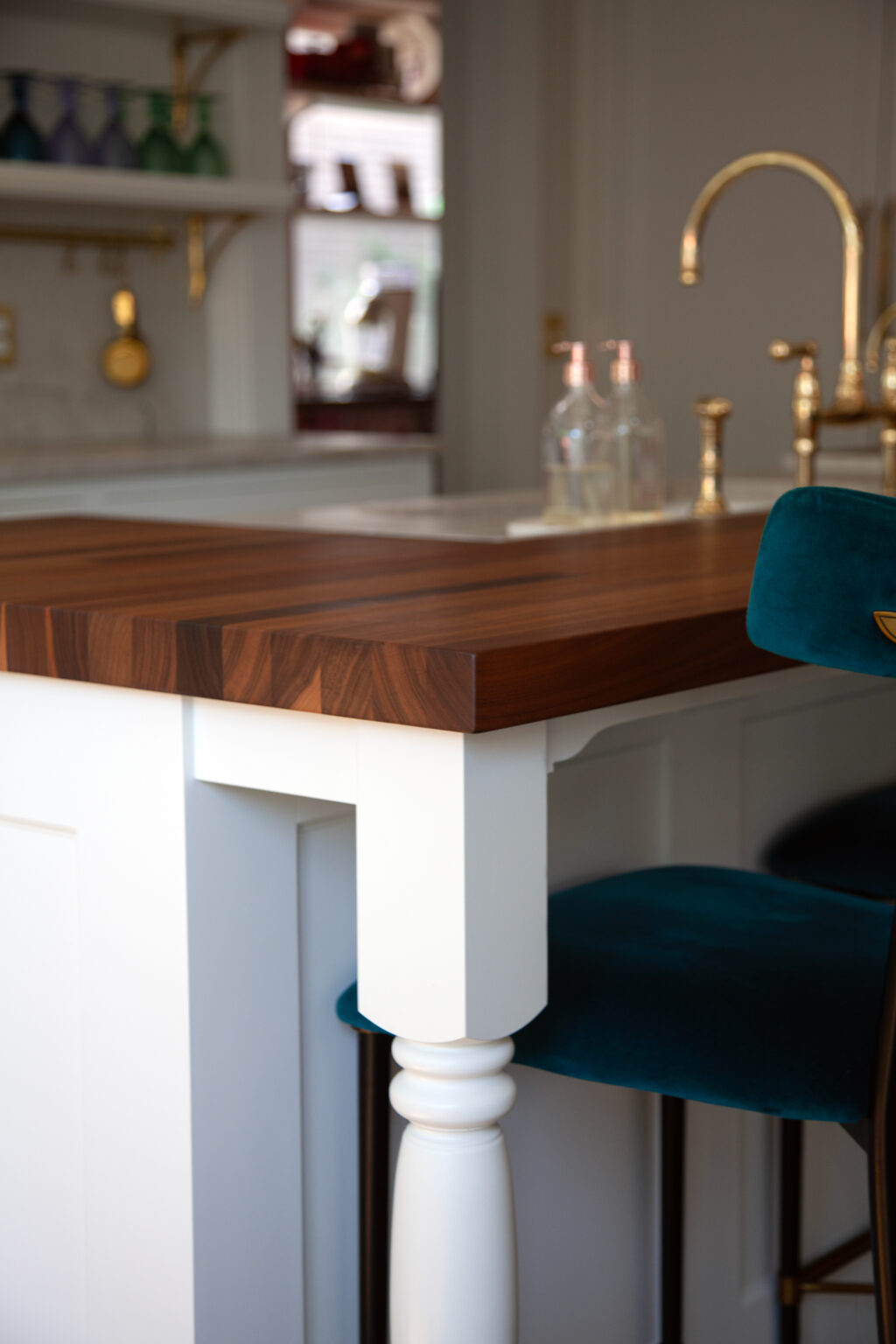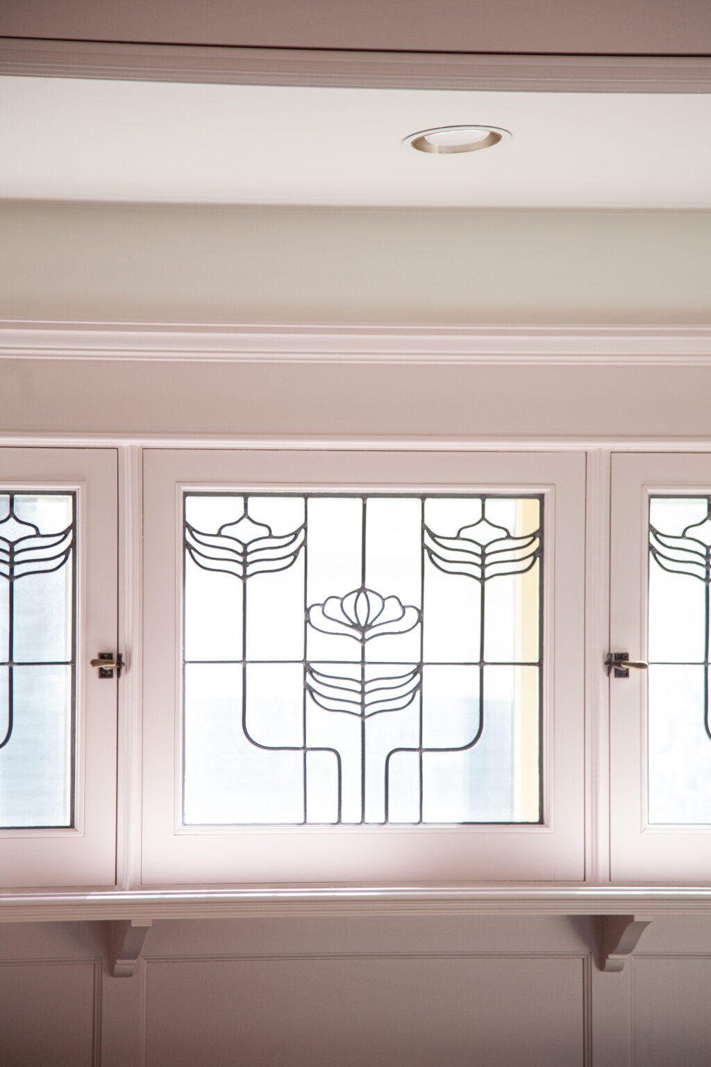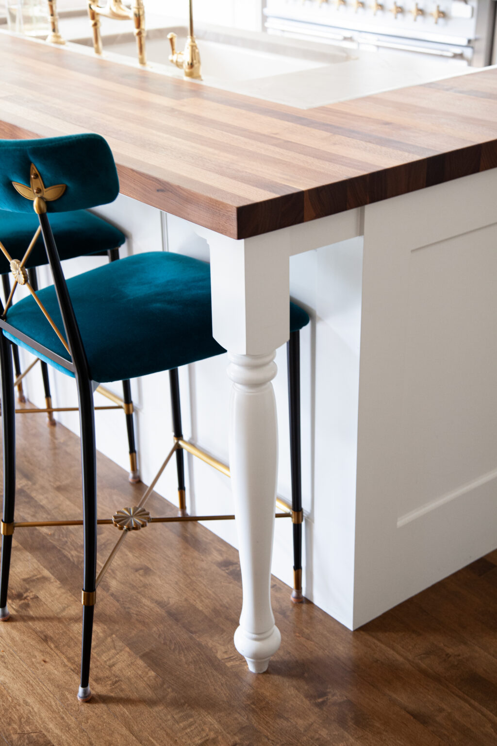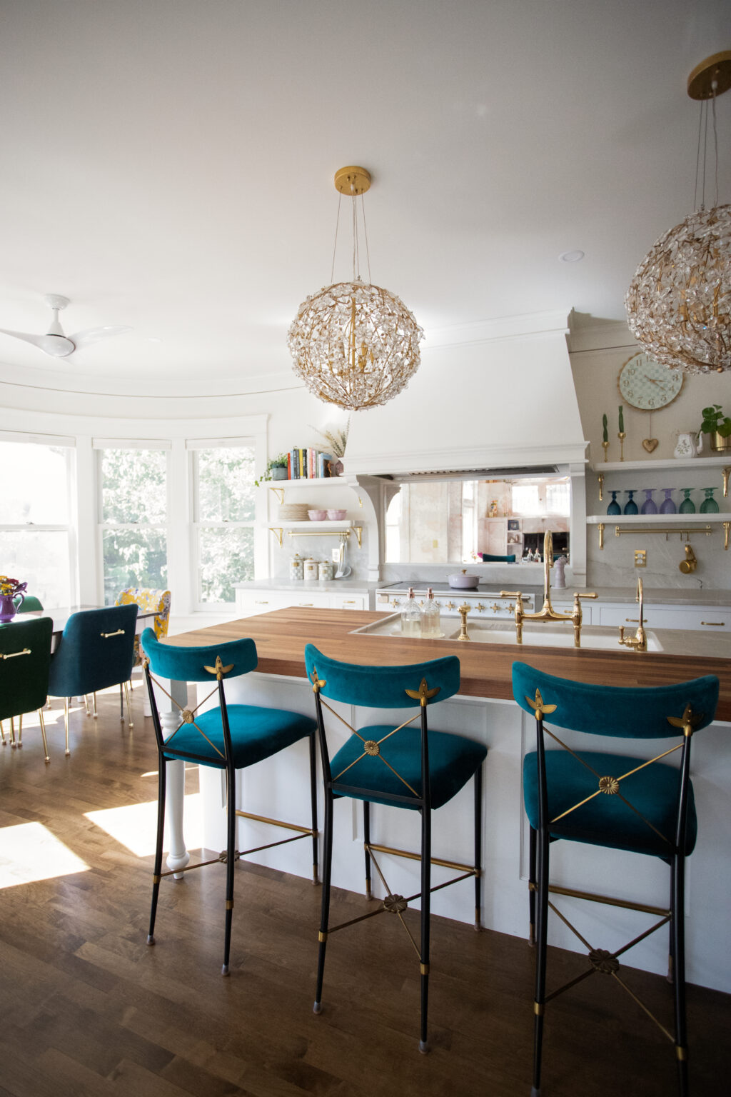 This remodel brings a bright, sweet feel to this Minneapolis home with blush pink wainscoting and ceiling wallpaper, white gem quartzite countertop, a butcher block island, and brass hardware finishes. Dreamy colorful accents in the kitchen, living room, and powder room give each space a distinct feel in a cohesive theme.