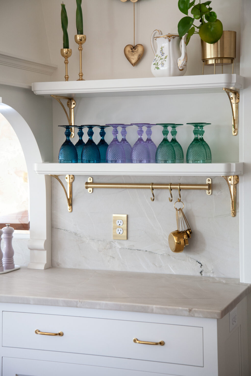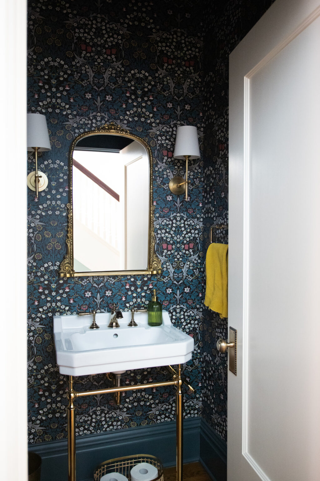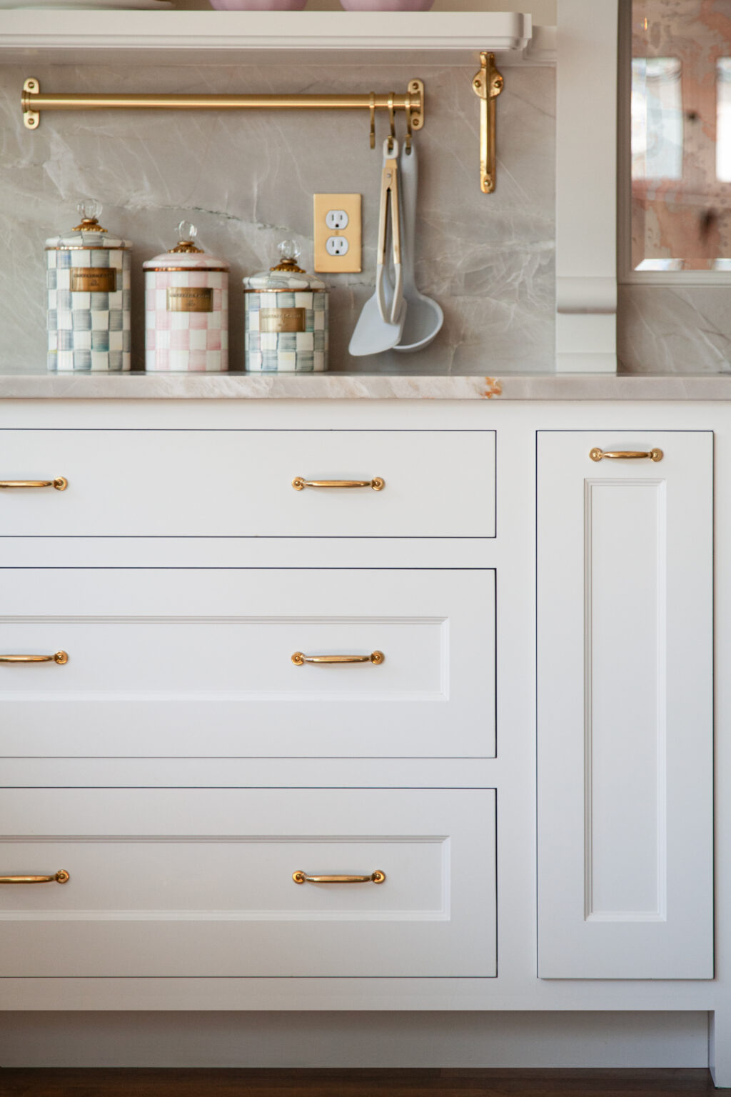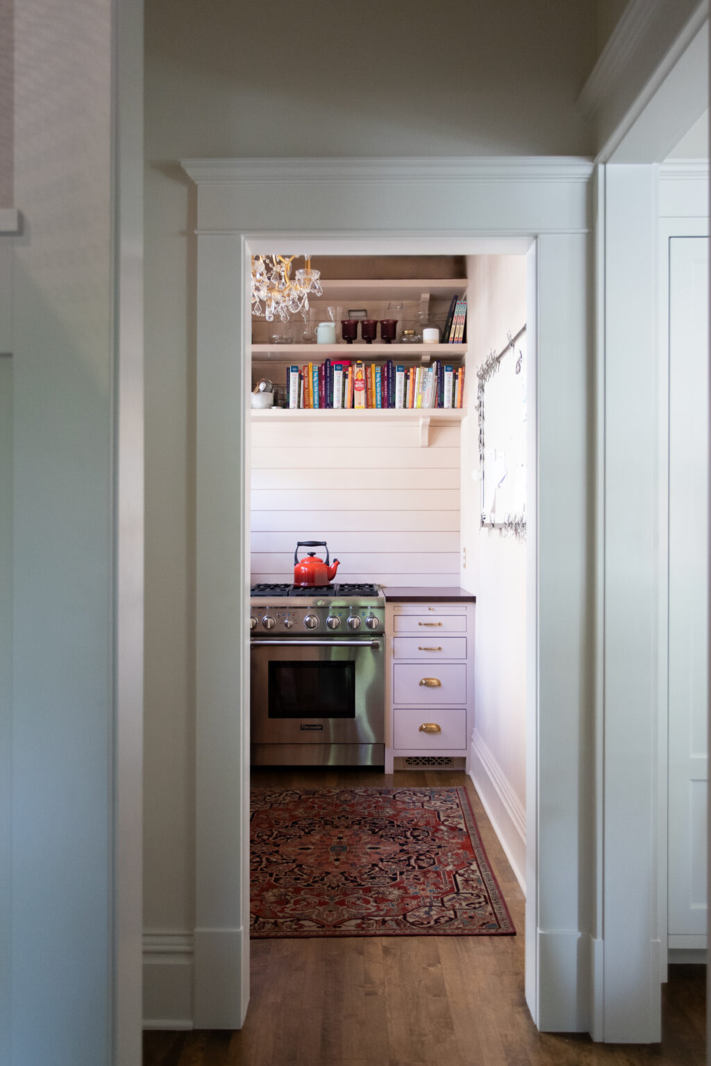 This remodel brings a bright, sweet feel to this Minneapolis home with blush pink wainscoting and ceiling wallpaper, white gem quartzite countertop, a butcher block island, and brass hardware finishes. Dreamy colorful accents in the kitchen, living room, and powder room give each space a distinct feel in a cohesive theme.