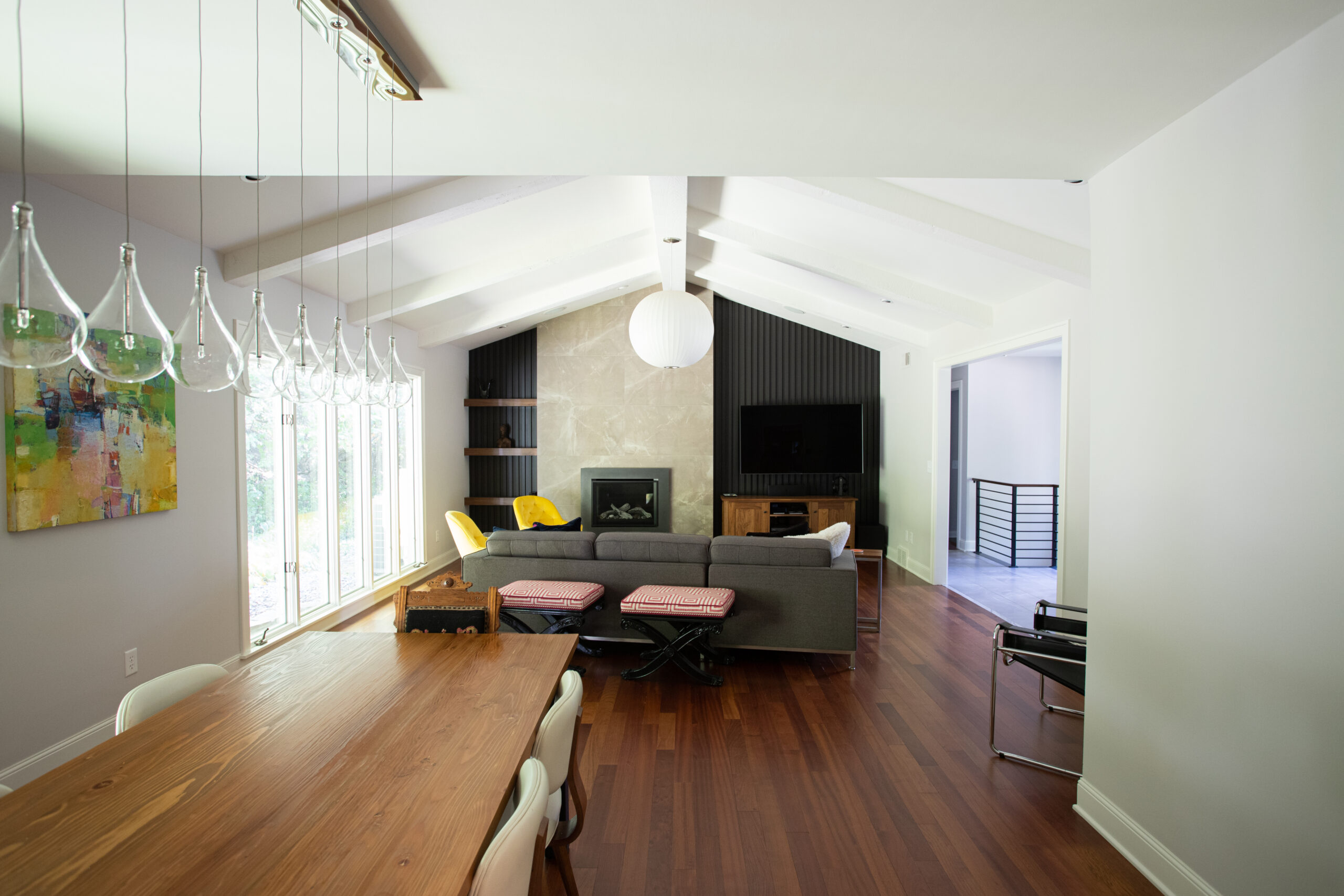 This modern Edina interior remodel features bold geometric shapes and pops of color. Porcelain tiles frame the fireplace against dark paneling, creating a striking accent wall. Walnut floating shelves complement the refinished hardwood floors, while new carpet and railings refresh the stairway, bringing cohesion and character to the space.