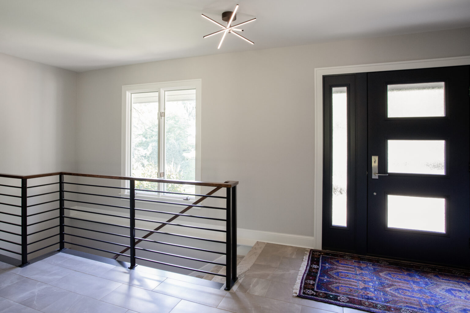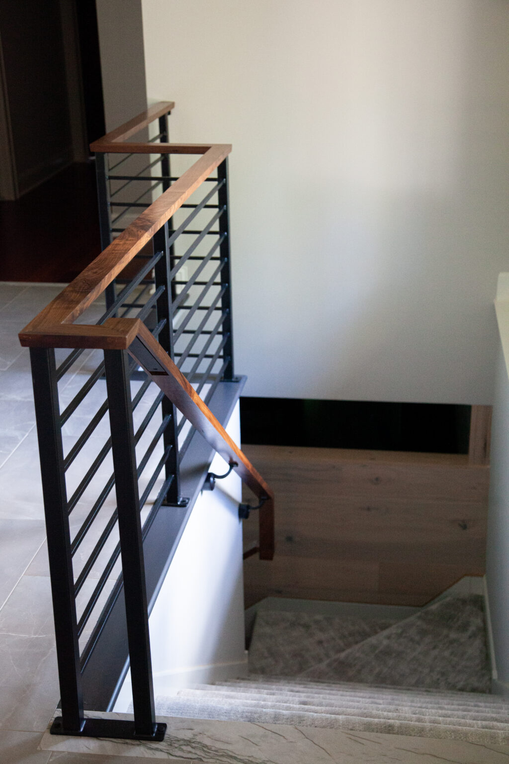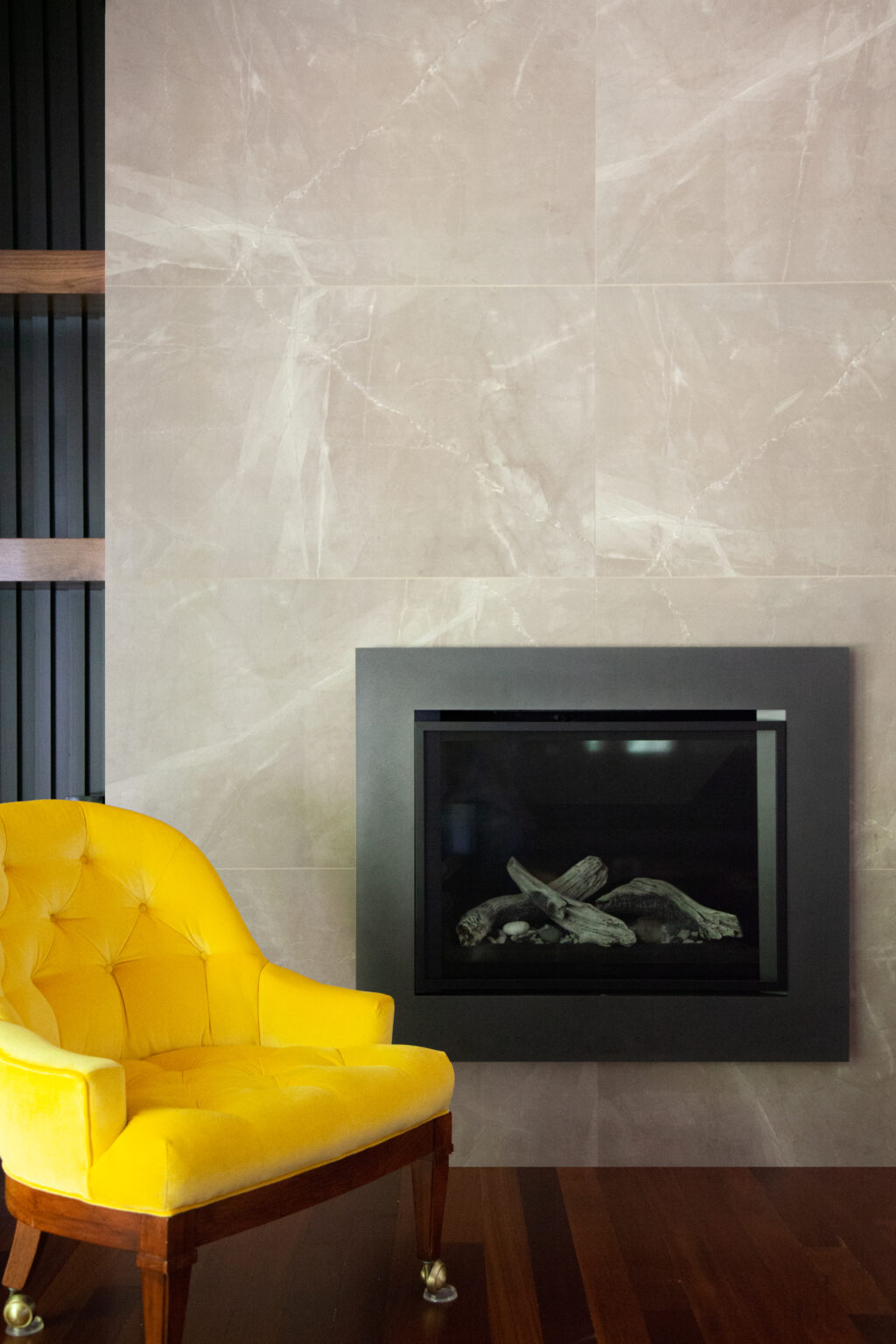 This modern Edina interior remodel features bold geometric shapes and pops of color. Porcelain tiles frame the fireplace against dark paneling, creating a striking accent wall. Walnut floating shelves complement the refinished hardwood floors, while new carpet and railings refresh the stairway, bringing cohesion and character to the space.