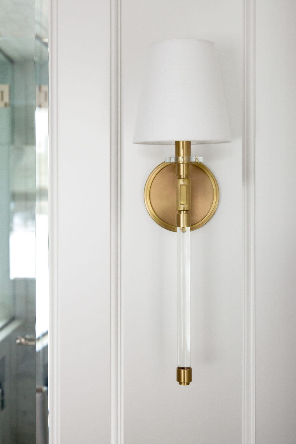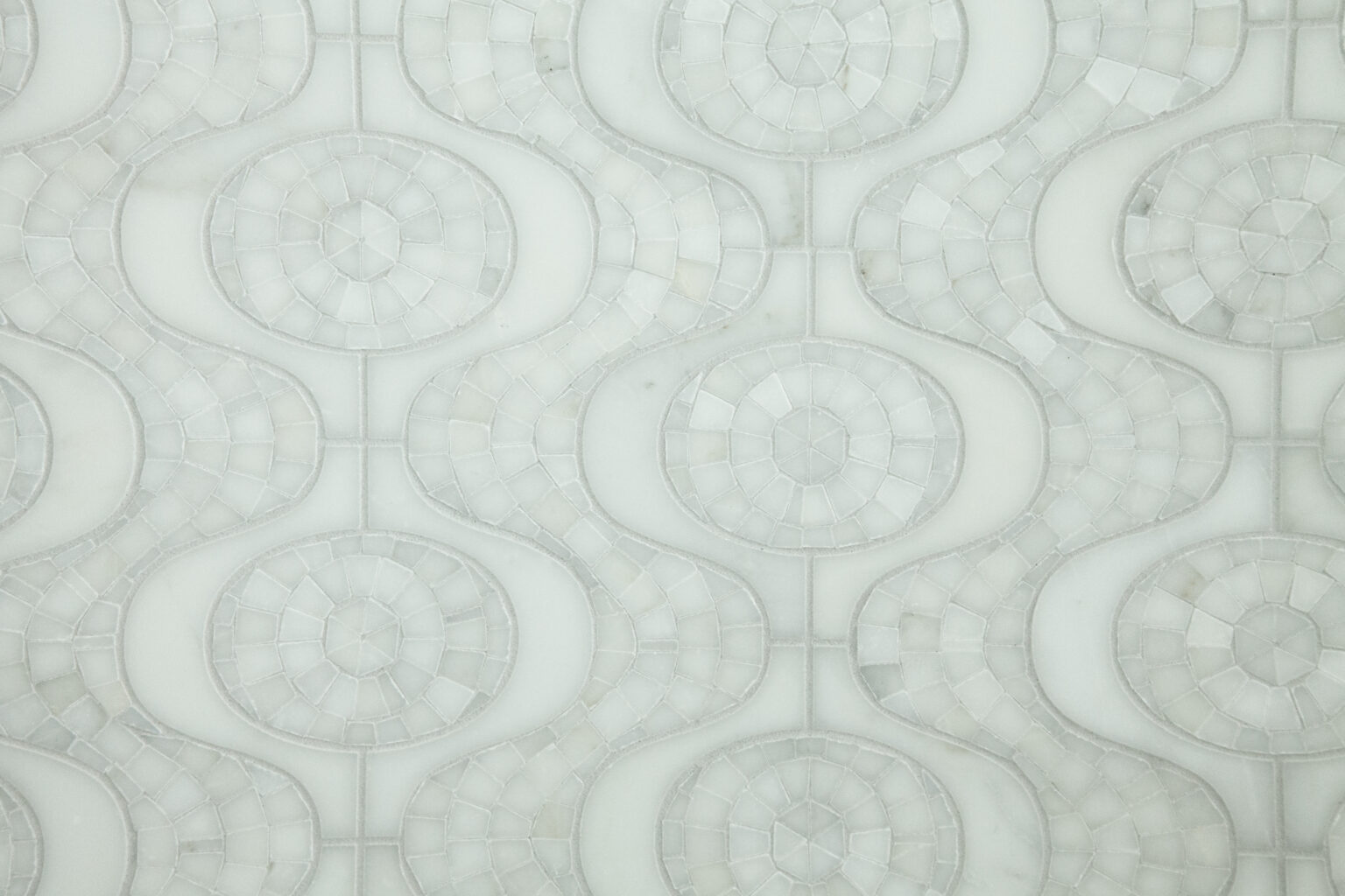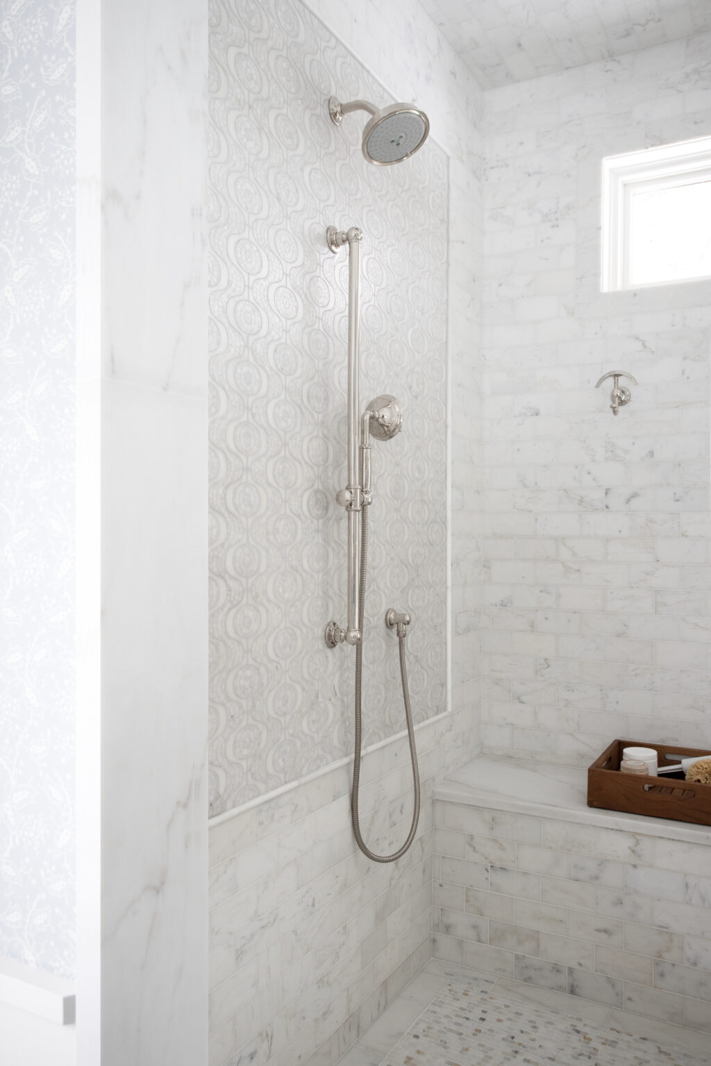 This traditional colonial-style primary bath features light, aquatic colors for a cool & clean feel. Gold and polished nickel accents blend seamlessly with subtly intricate patterns and tile details, including a breathtaking Walker Zanger Tangent Ipanema Mosaic shower accent tile, in this sophisticated primary bathroom.