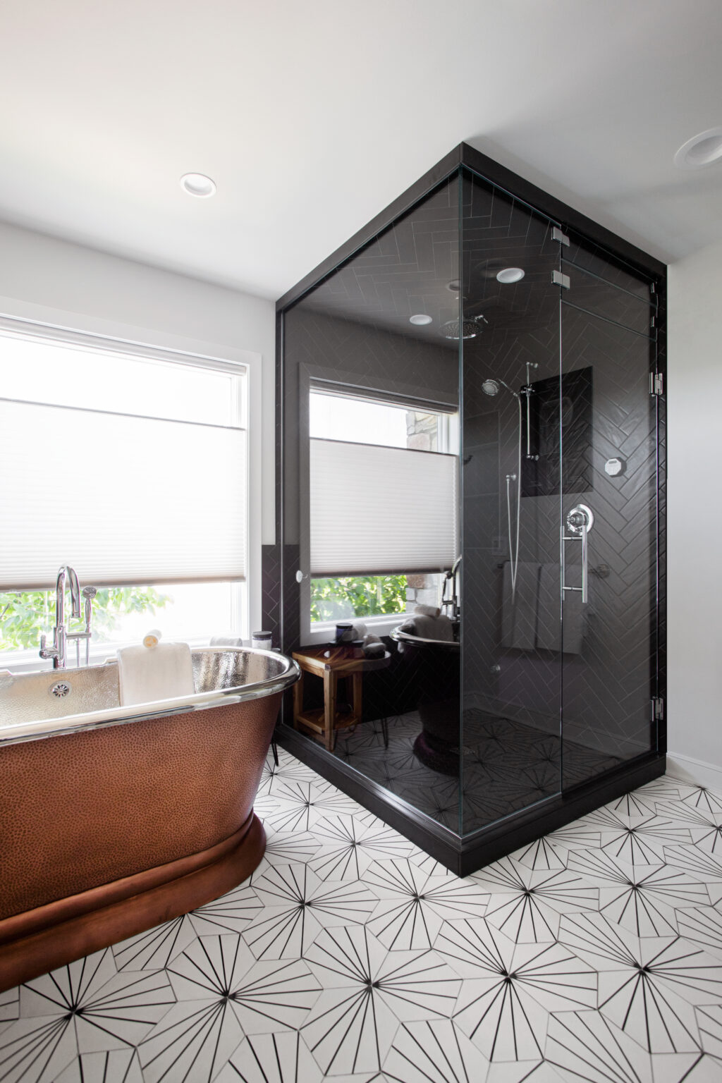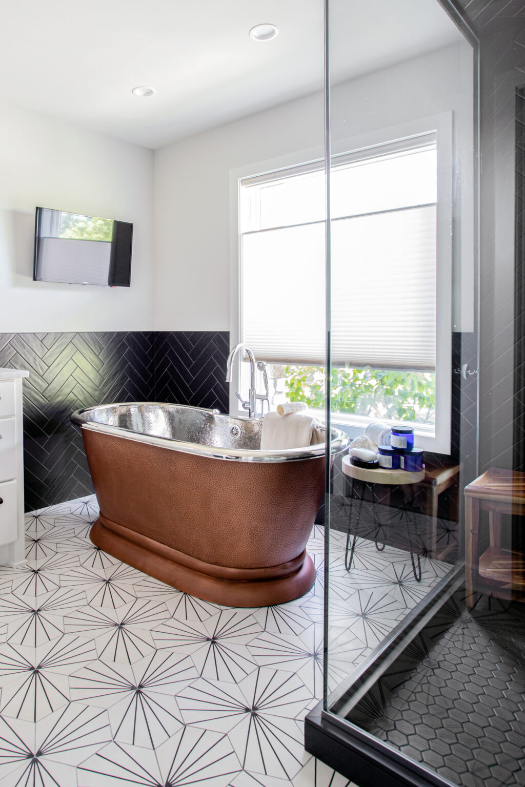 This sleek primary bathroom features black and white design elements including geometric tile, vanity and wall tile, and shower tiles, which highlight the eye-catching copper standalone bath in the center of this elegant space.