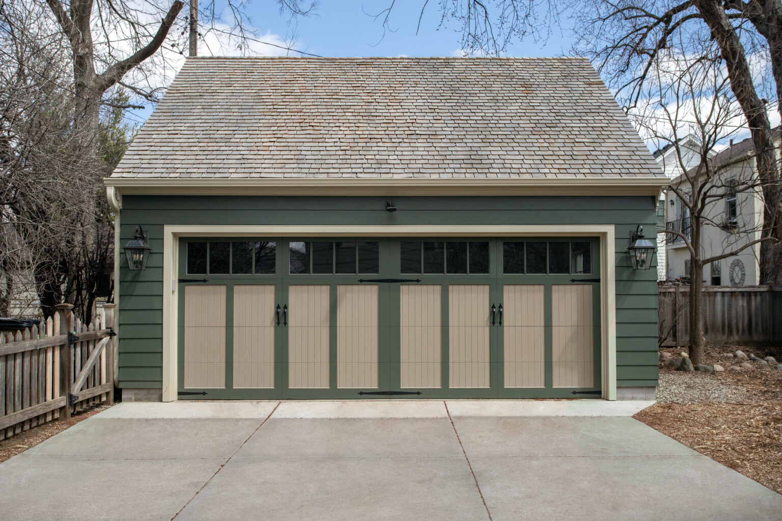 This green and beige garage rebuild in Edina features rustic cedar shakes and classic black accents. Integrating design elements from the main home makes this detached garage feel like a natural extension of its charming counterpart nearby.