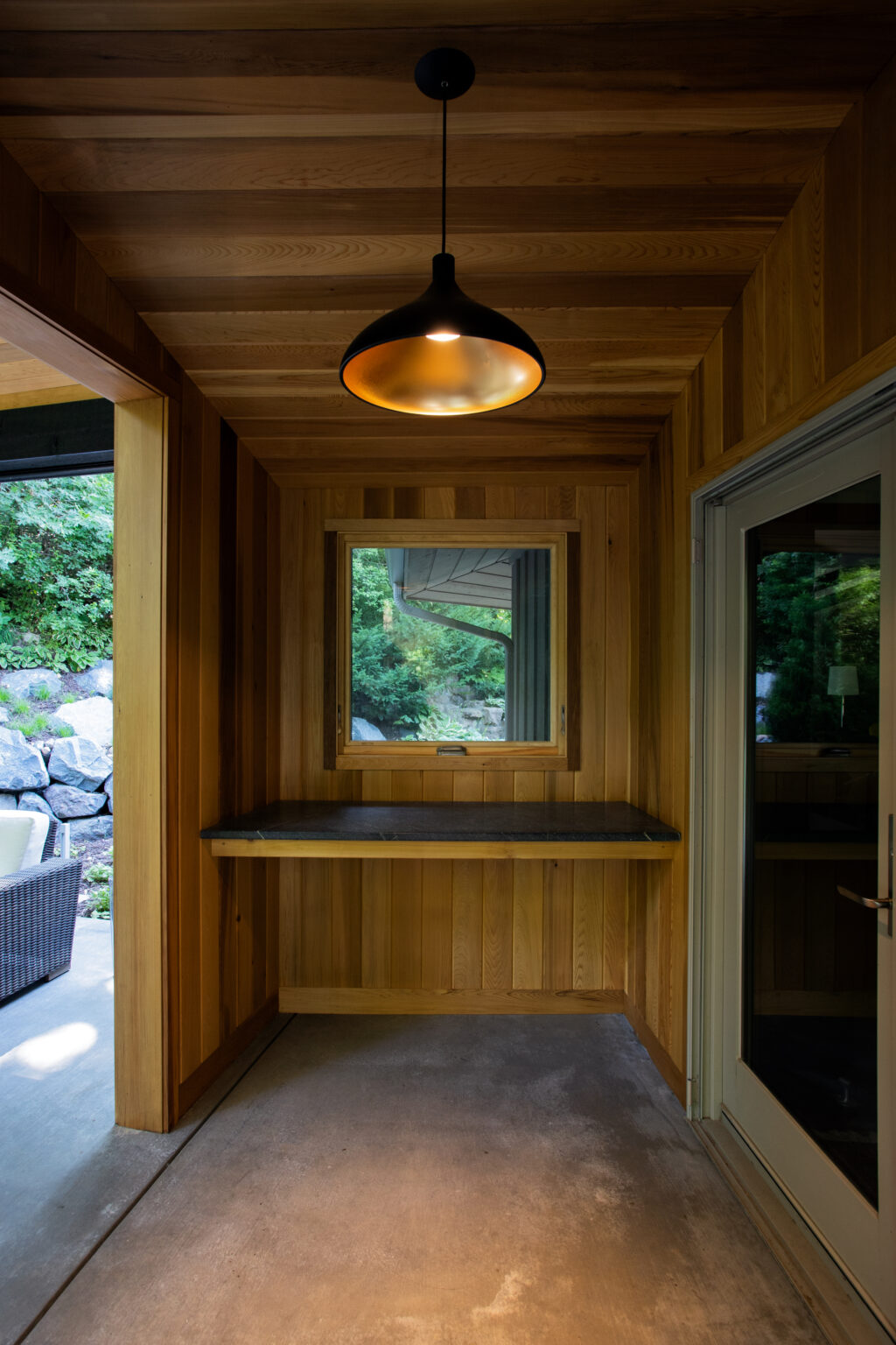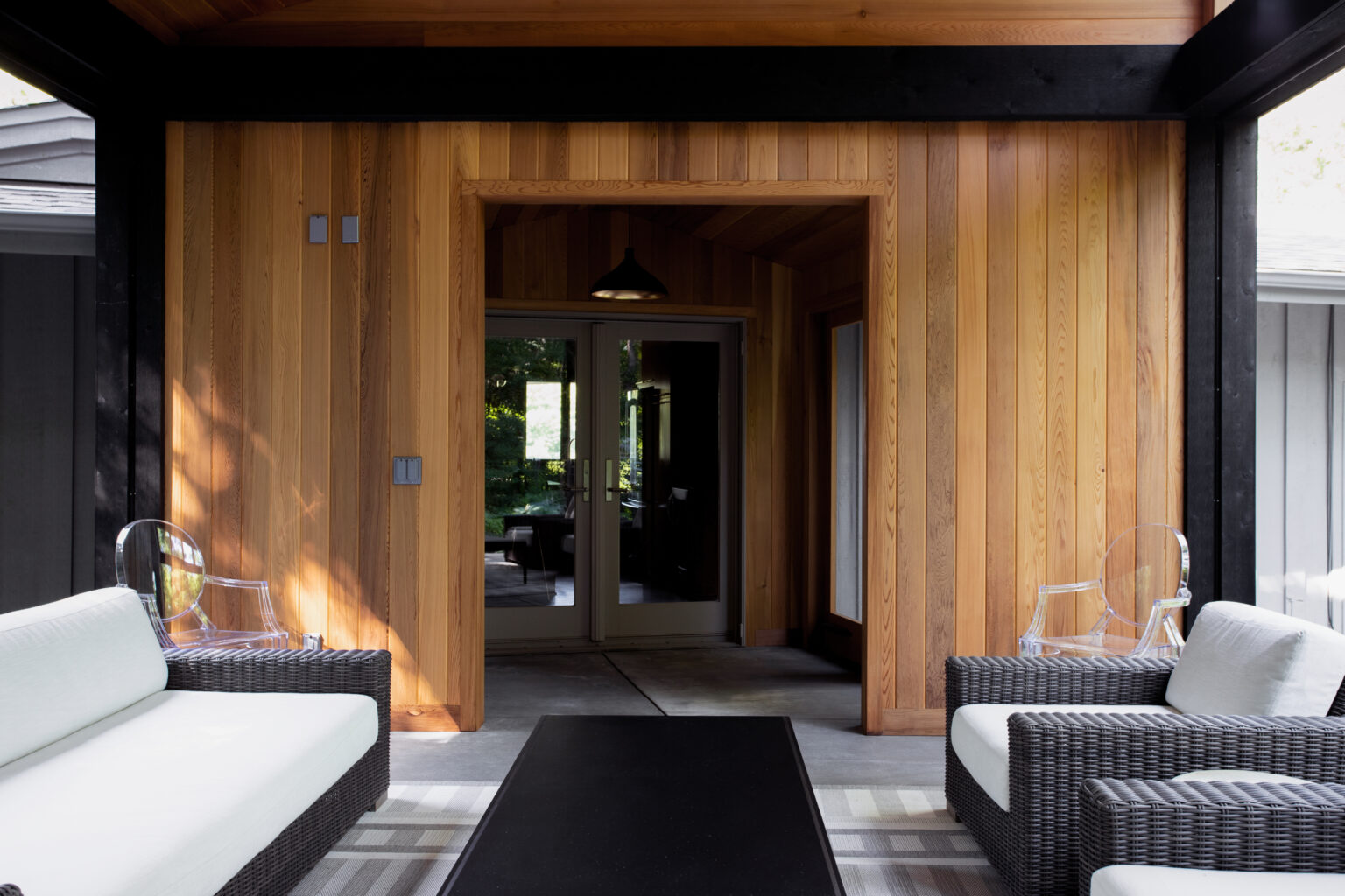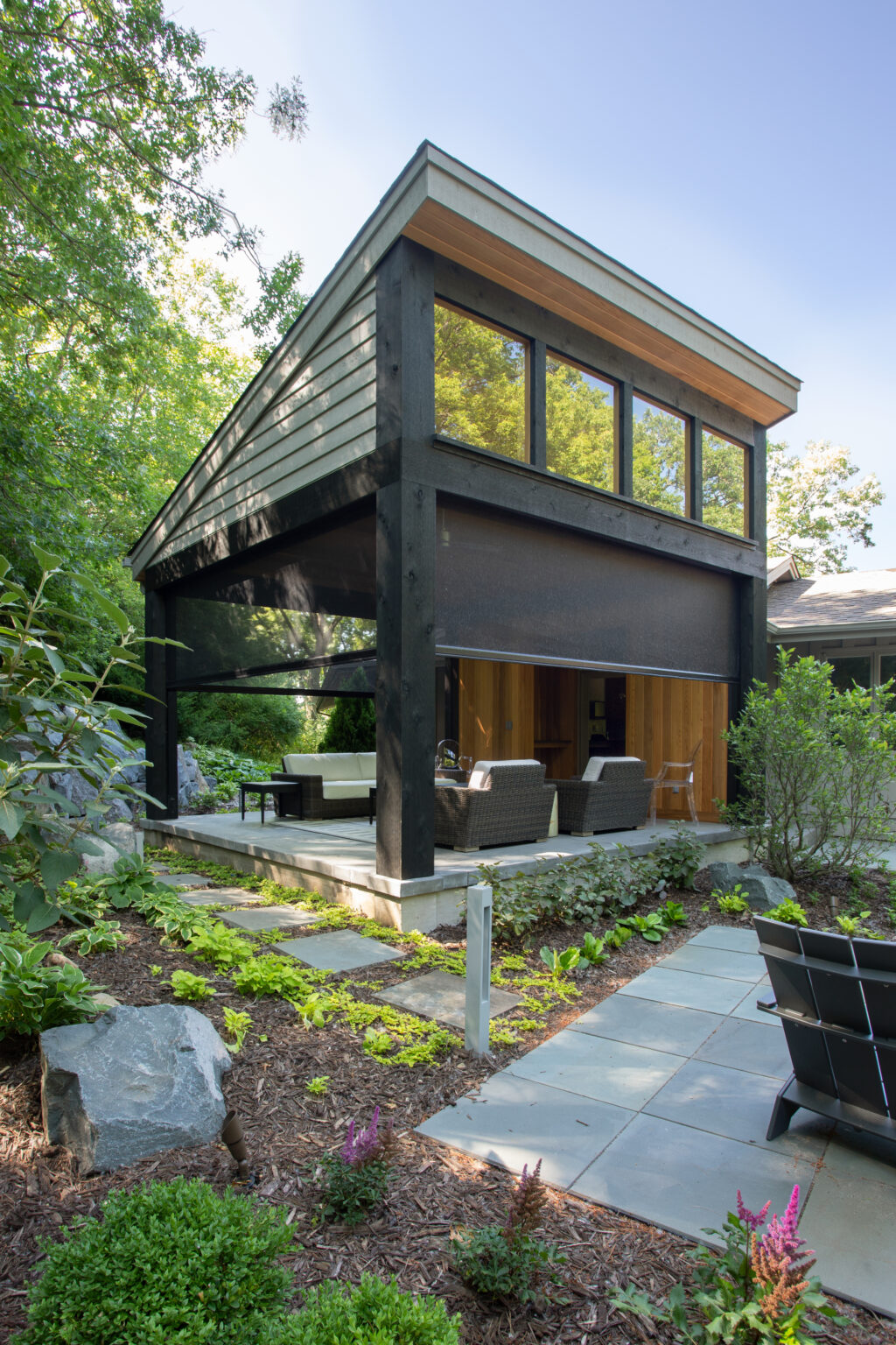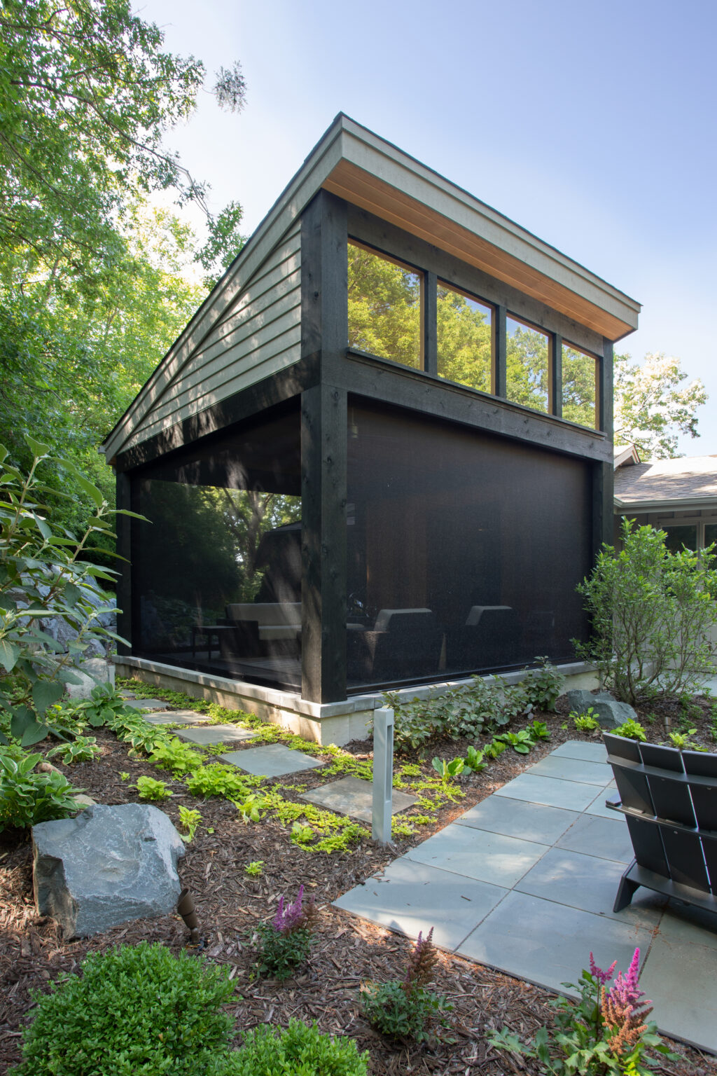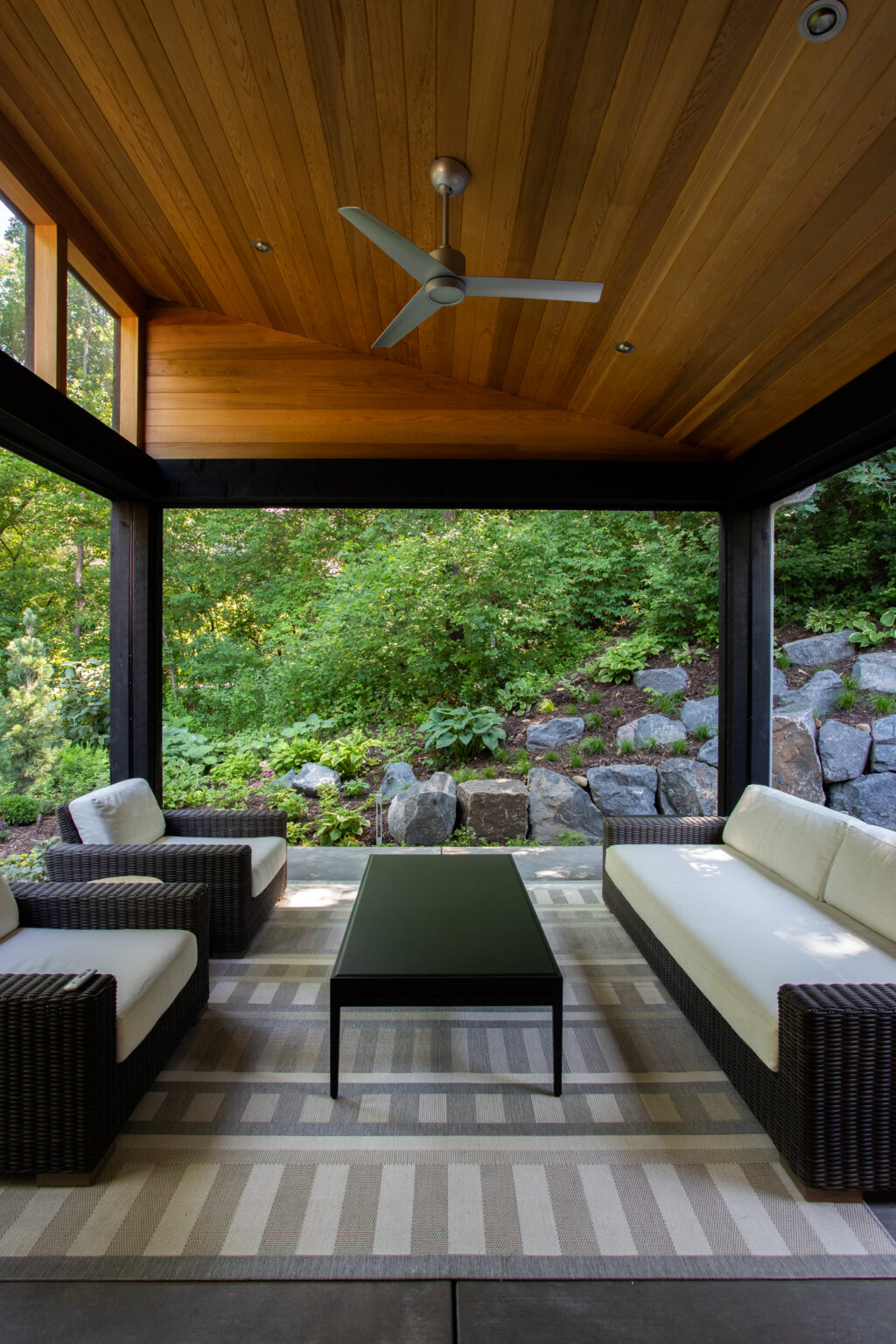 This substantial porch addition in Edina extends the home into the backyard, offering a space for dining, lounging, and quiet retreat. Built from red cedar, glass, and concrete, the pavilion-like structure blends contemporary and mid-century sensibilities with quiet sophistication. Vaulted ceilings and motorized screens create a light, airy space that opens fully to the surrounding nature.