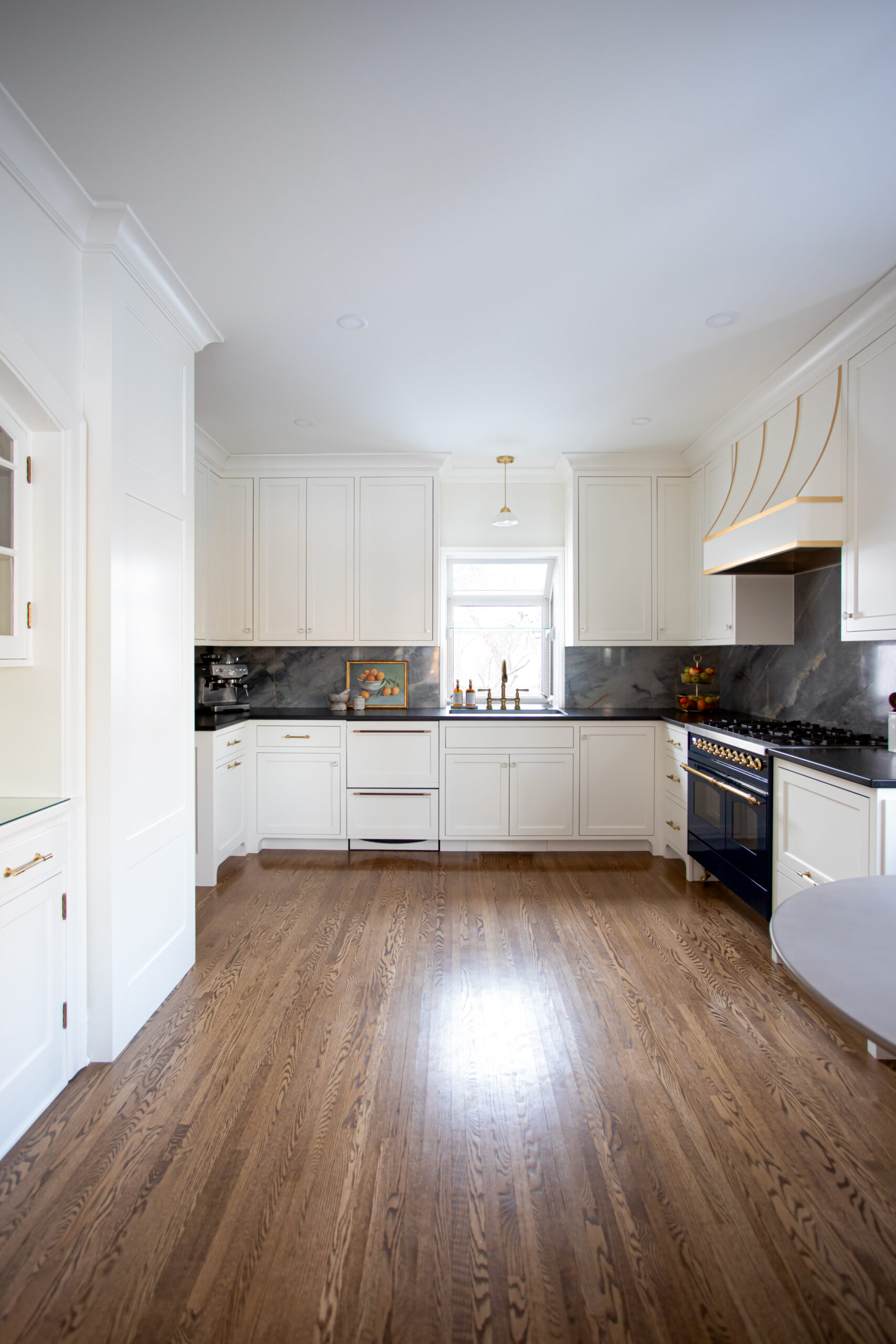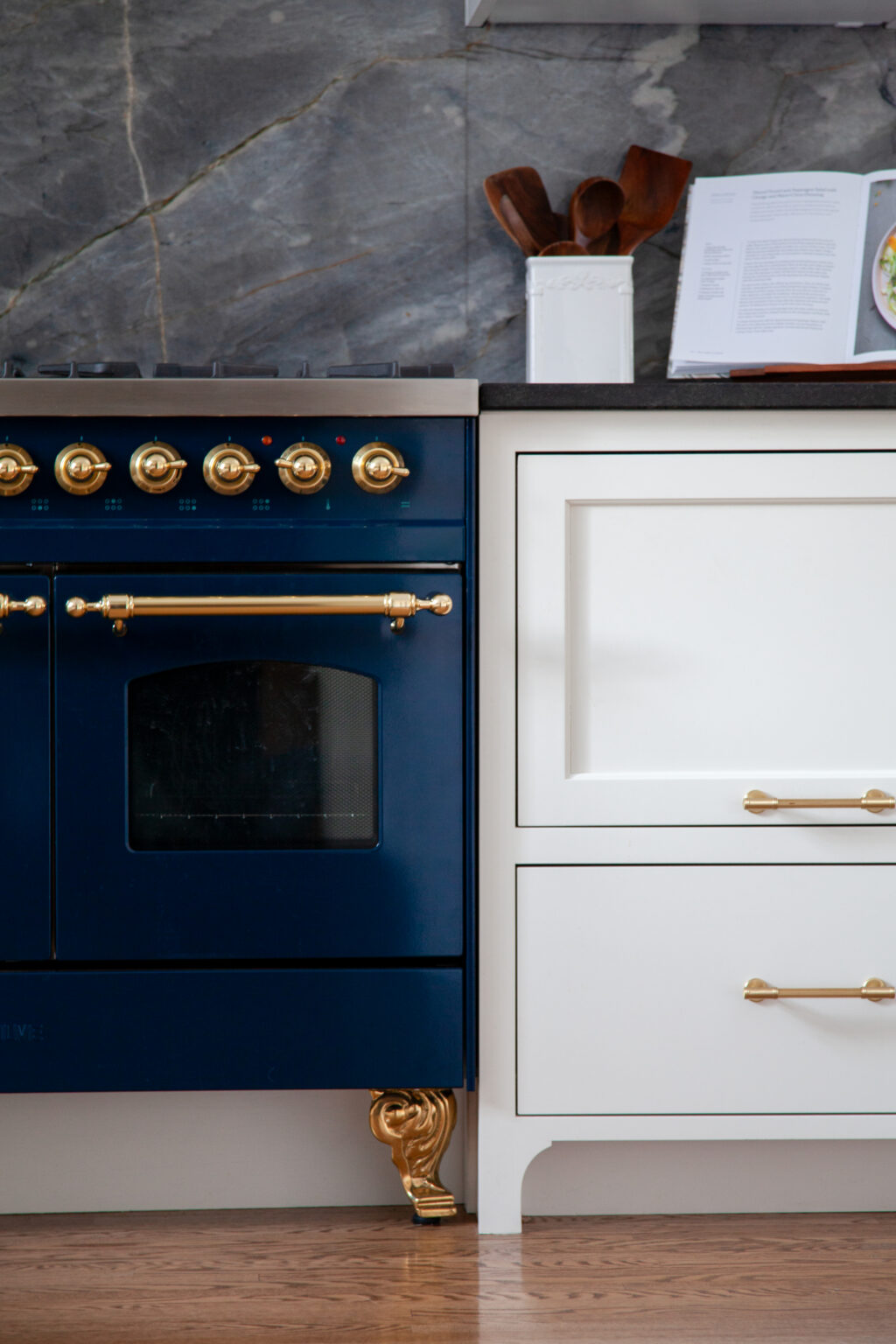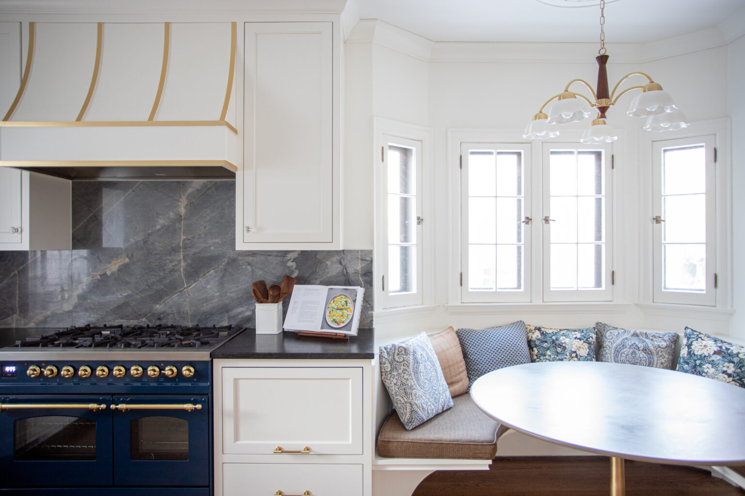 This Lake Harriet kitchen is designed with attention to detail, bringing both character and function to the heart of the home. White custom cabinetry and black granite countertops provide a refined balance to the quartzite slab backsplash and midnight blue ILVE Nostalgie oven. A built-in breakfast nook and carefully considered storage add warmth and practicality to this Minneapolis kitchen.