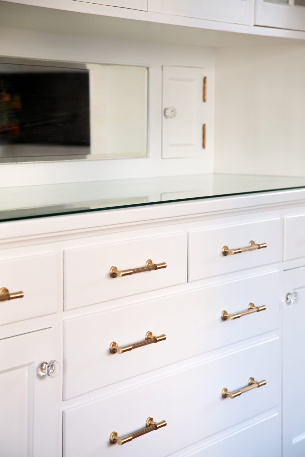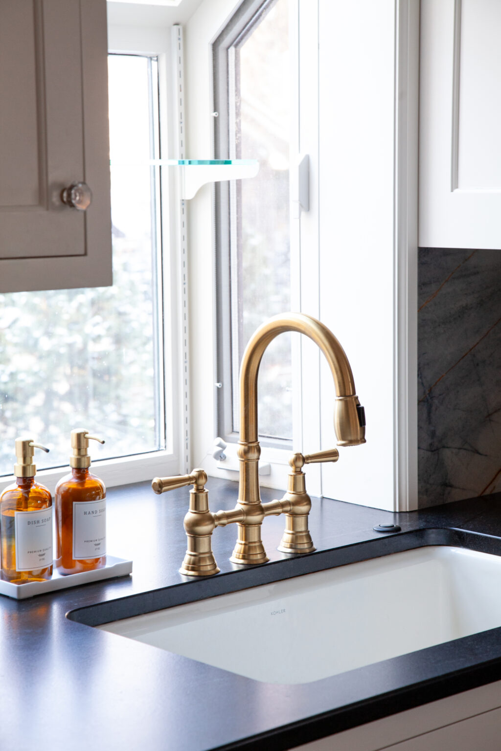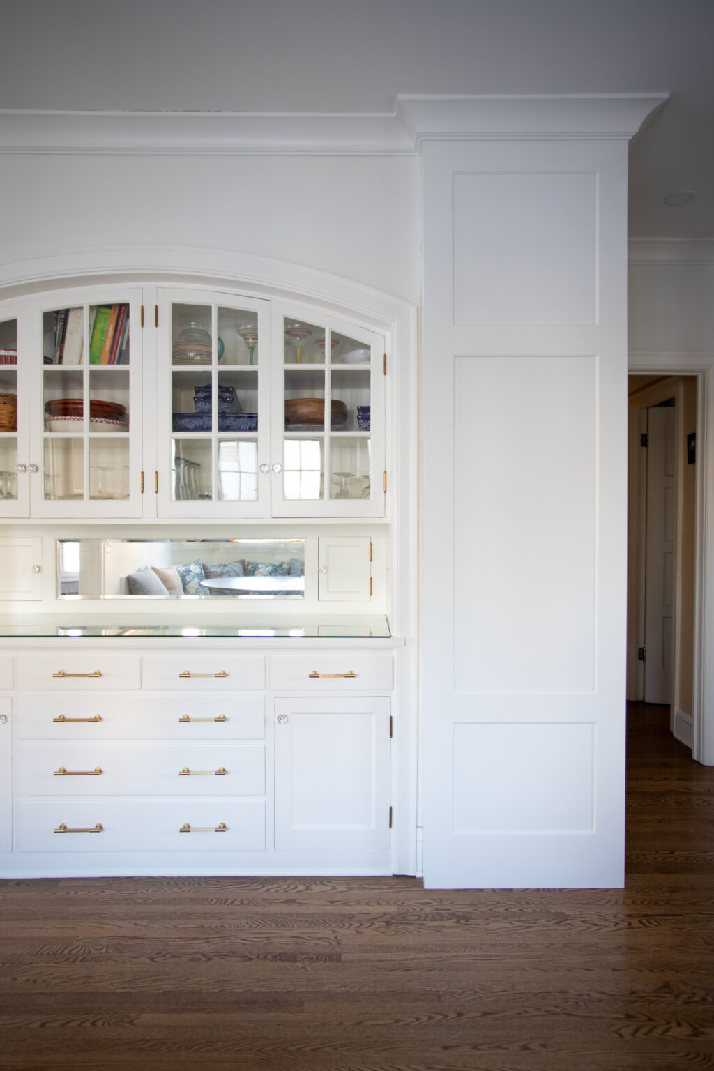 This Lake Harriet kitchen is designed with attention to detail, bringing both character and function to the heart of the home. White custom cabinetry and black granite countertops provide a refined balance to the quartzite slab backsplash and midnight blue ILVE Nostalgie oven. A built-in breakfast nook and carefully considered storage add warmth and practicality to this Minneapolis kitchen.