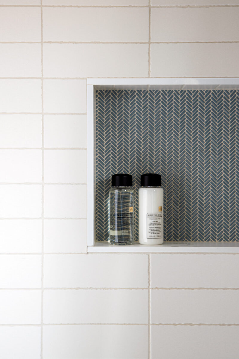This bold & patterned kids’ bathroom features a herringbone wood vanity, navy and white geometric floral floor tiles, and hibiscus green walls, creating the perfect space for children to grow into.