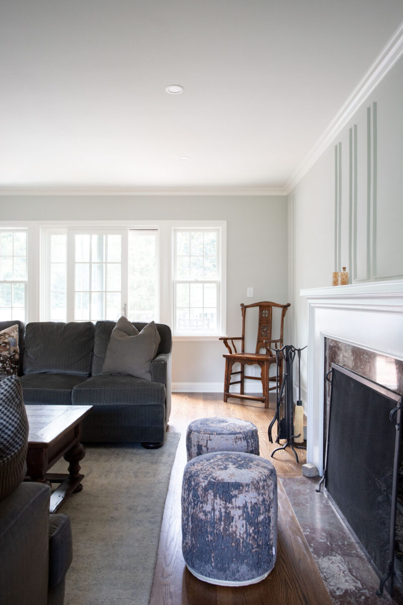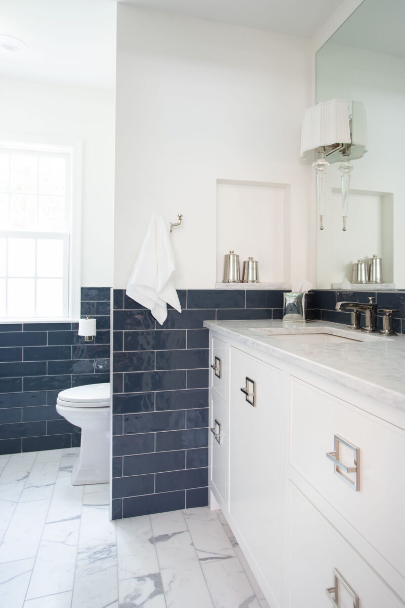 This stunning home in Edina’s Interlachen Park neighborhood uses soft, natural colors to give the home’s interior a continuous feel with the tranquility and beauty of the Interlachen Country Club. Stained red oak floors and subtle wall molding accent the main living areas, while glossy navy blue ceramic wall tile and polished chrome cabinet pulls create the relaxing feel of the primary bathroom.