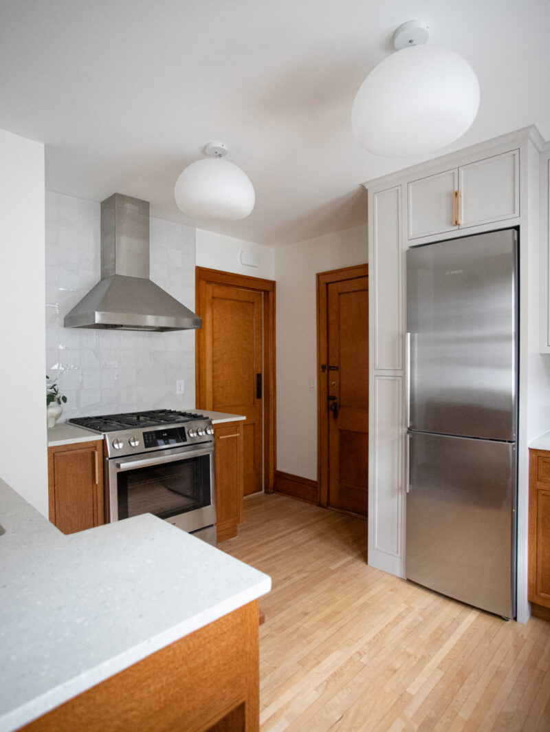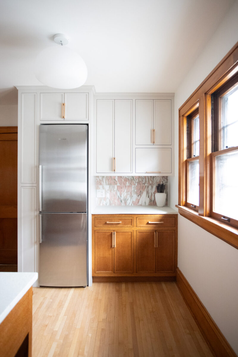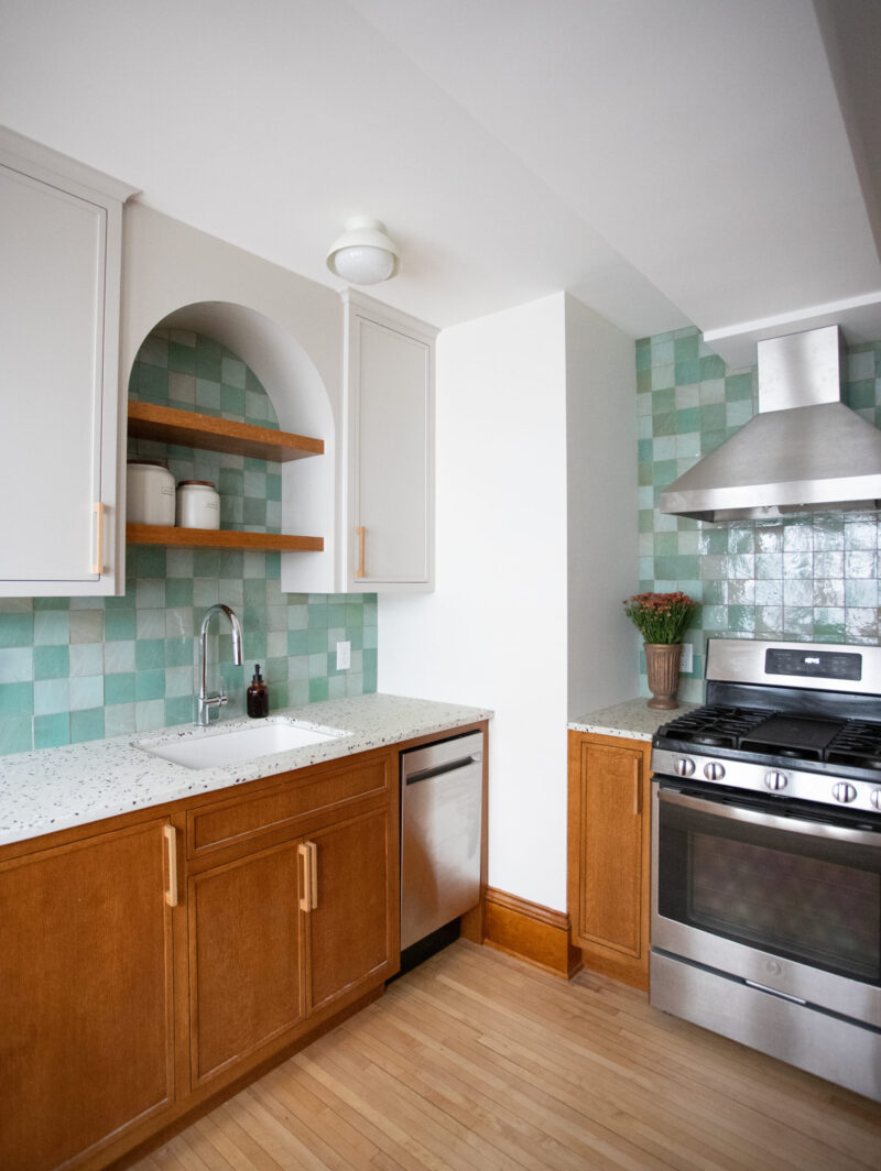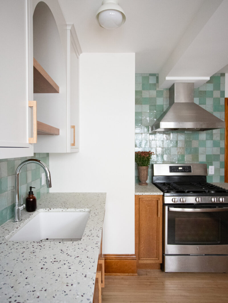 Natural wood and colorful tile accents complement simple lines and arches throughout this sophisticated yet playful remodel. Sea green ceramic tile and rose marble subway tile backsplashes, terrazzo countertops, and red oak cabinets bring this Minneapolis duplex to life.