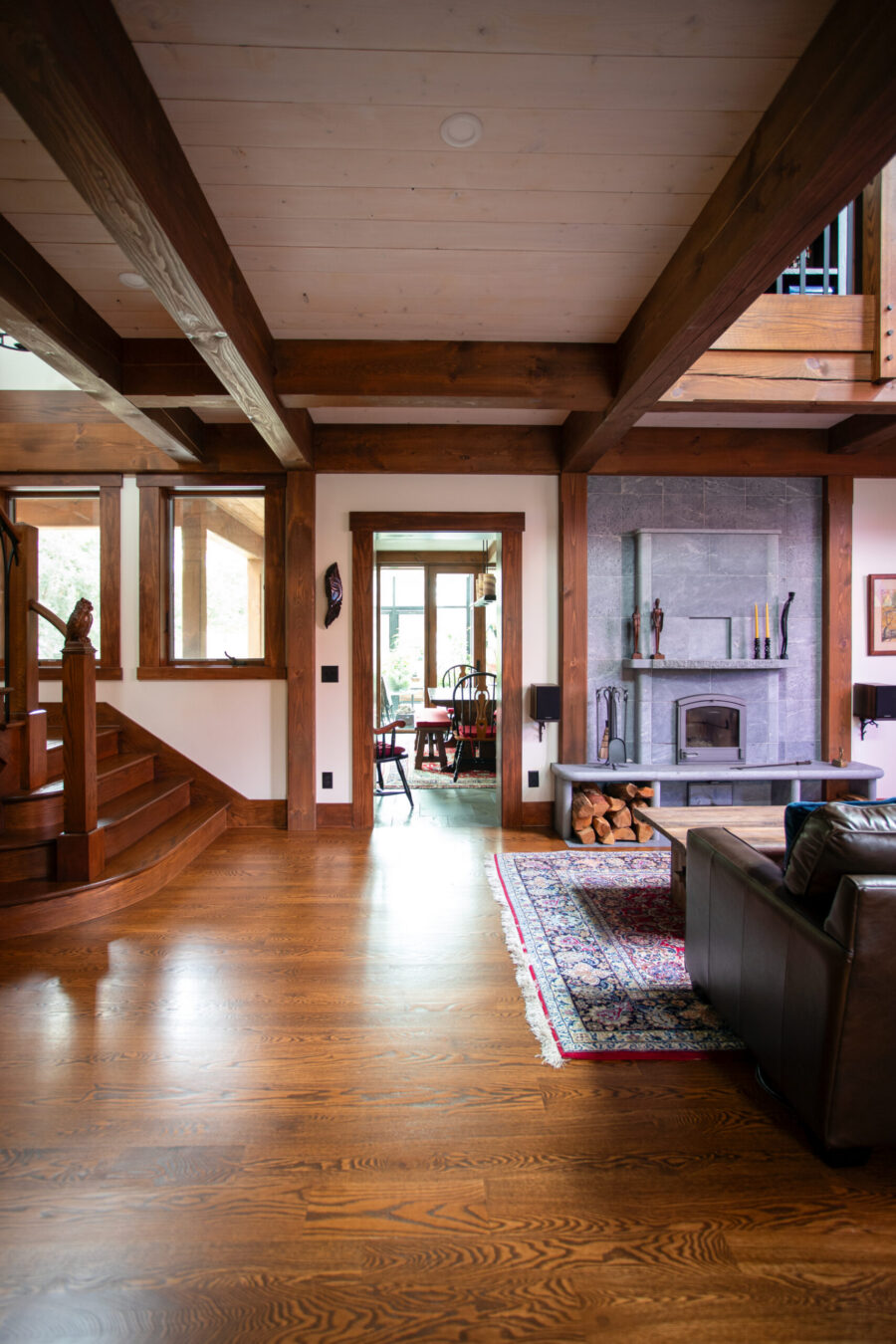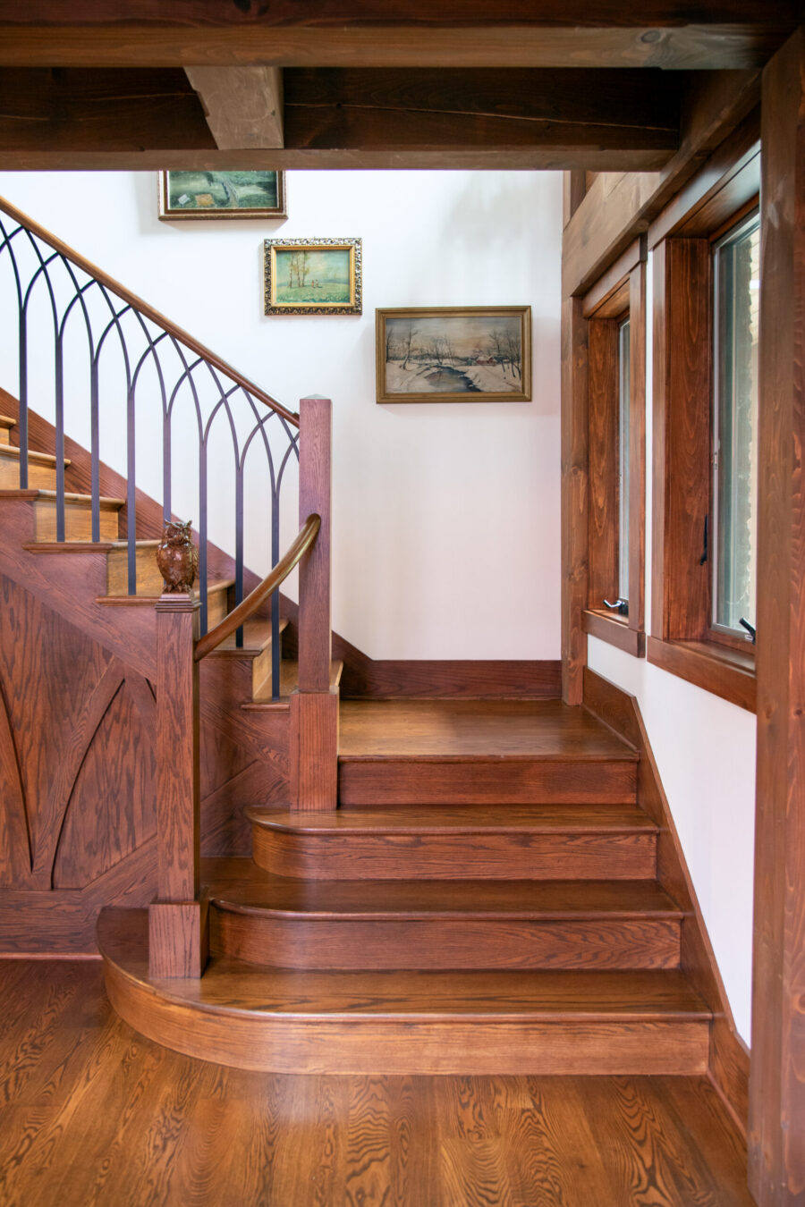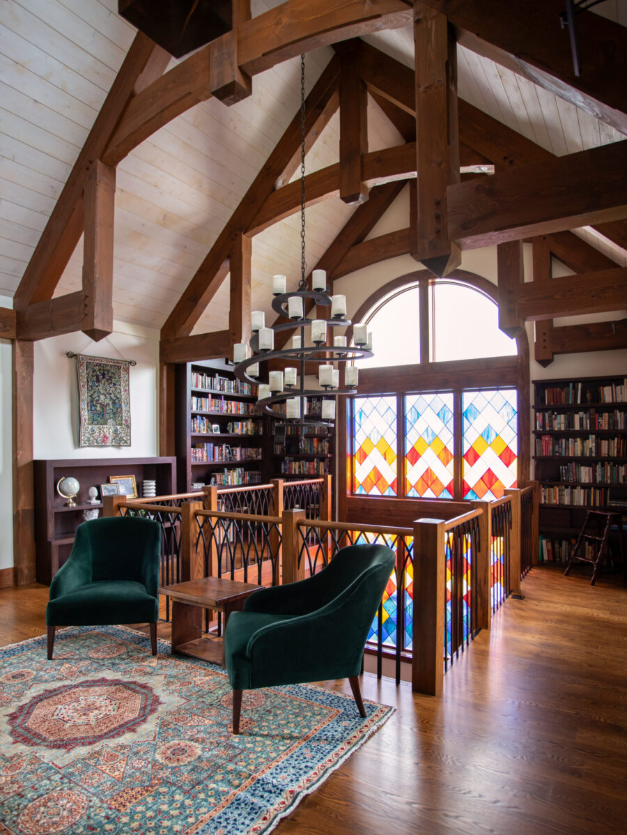 Set near Lake of the Isles in Minneapolis’s Kenwood neighborhood, this Tudor-inspired custom home blends medieval character with thoughtful craftsmanship. Exposed timber framing, stained glass, and hand-forged ironwork introduce warmth and story throughout the interior. A two-story library with nature-inspired motifs, a light-filled conservatory, and a centrally placed soapstone stove create gathering spaces that feel both timeless and imaginative. Subtle sustainable strategies, including super-insulated construction and solar orientation, support long-term comfort and efficiency.