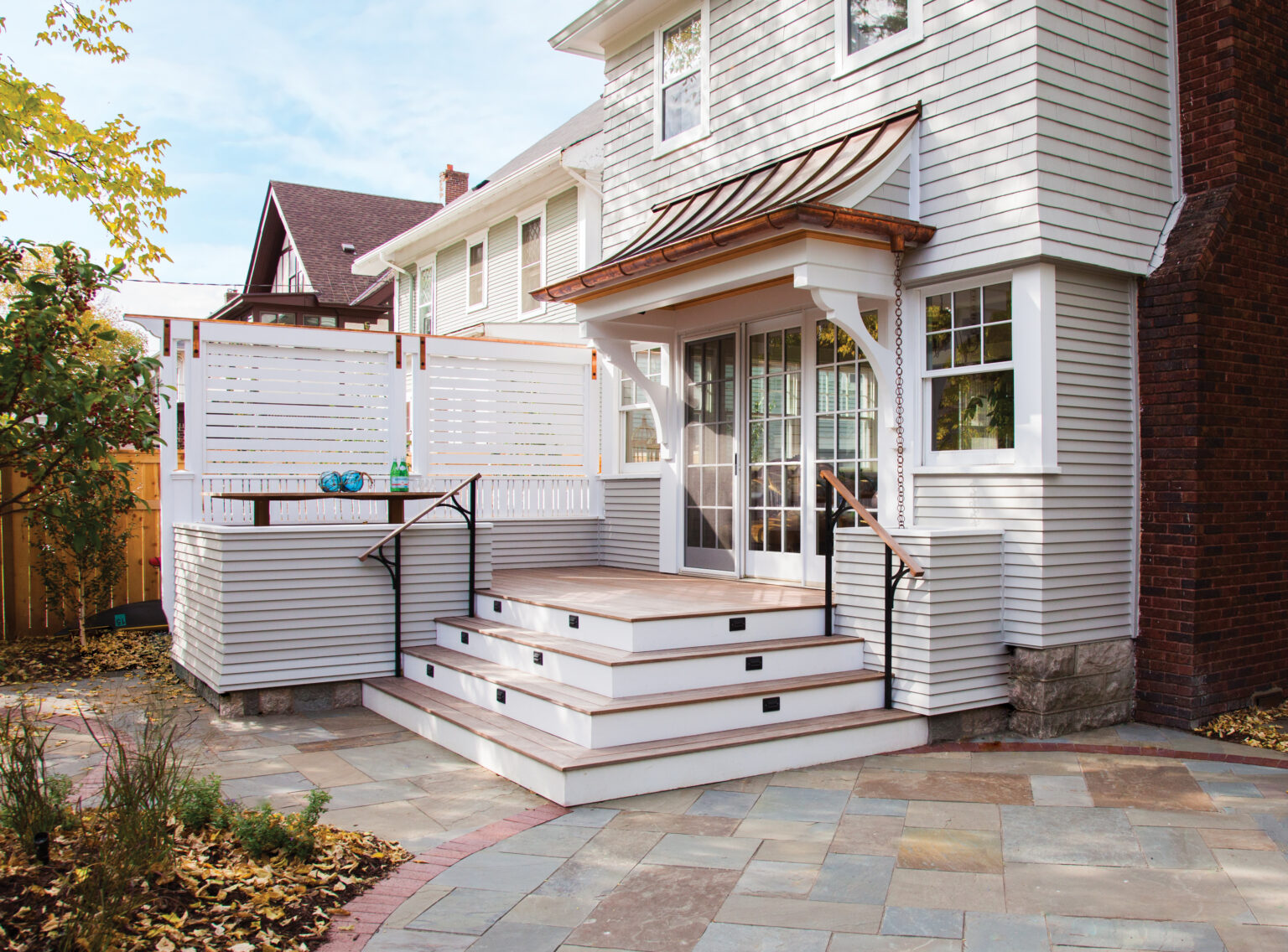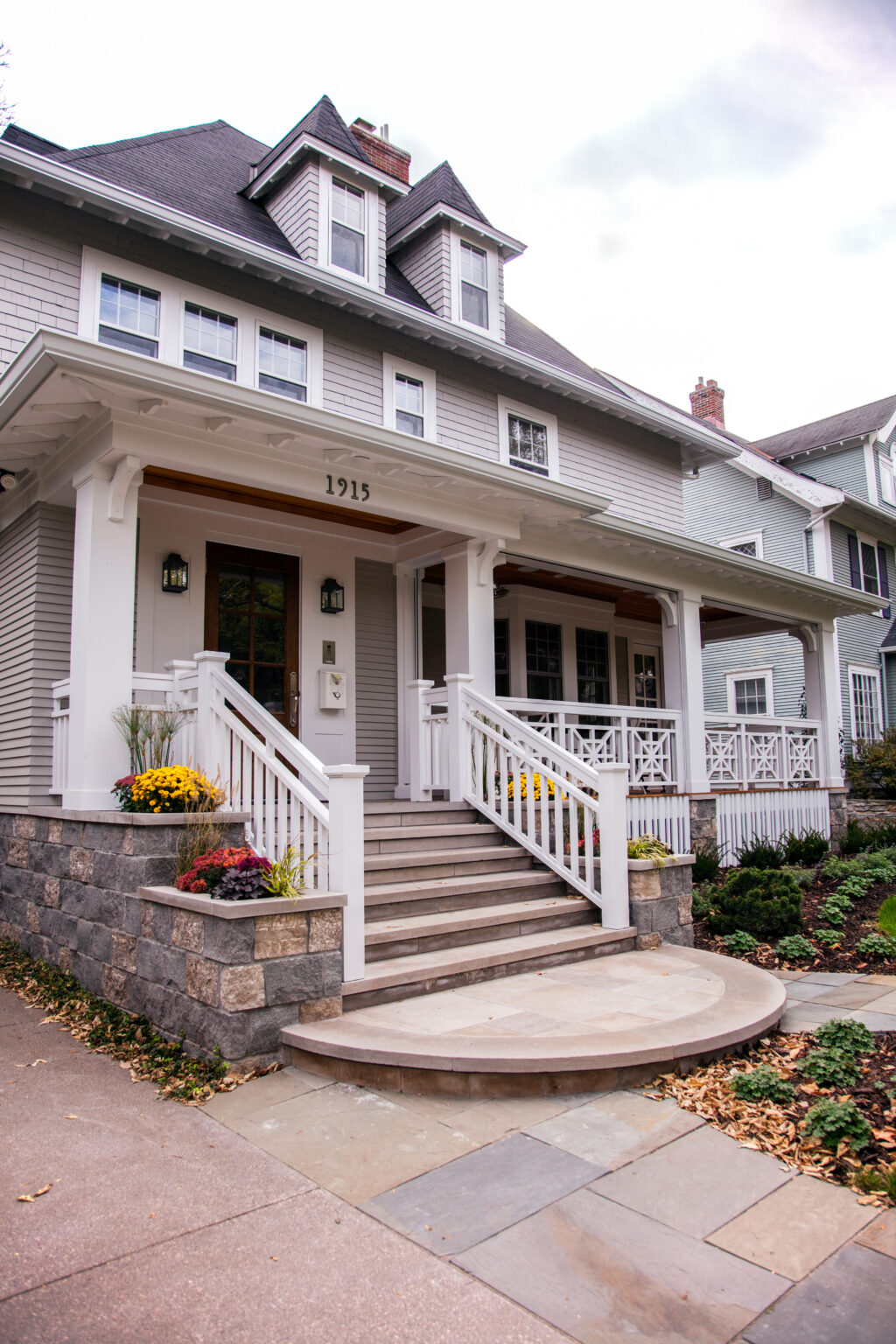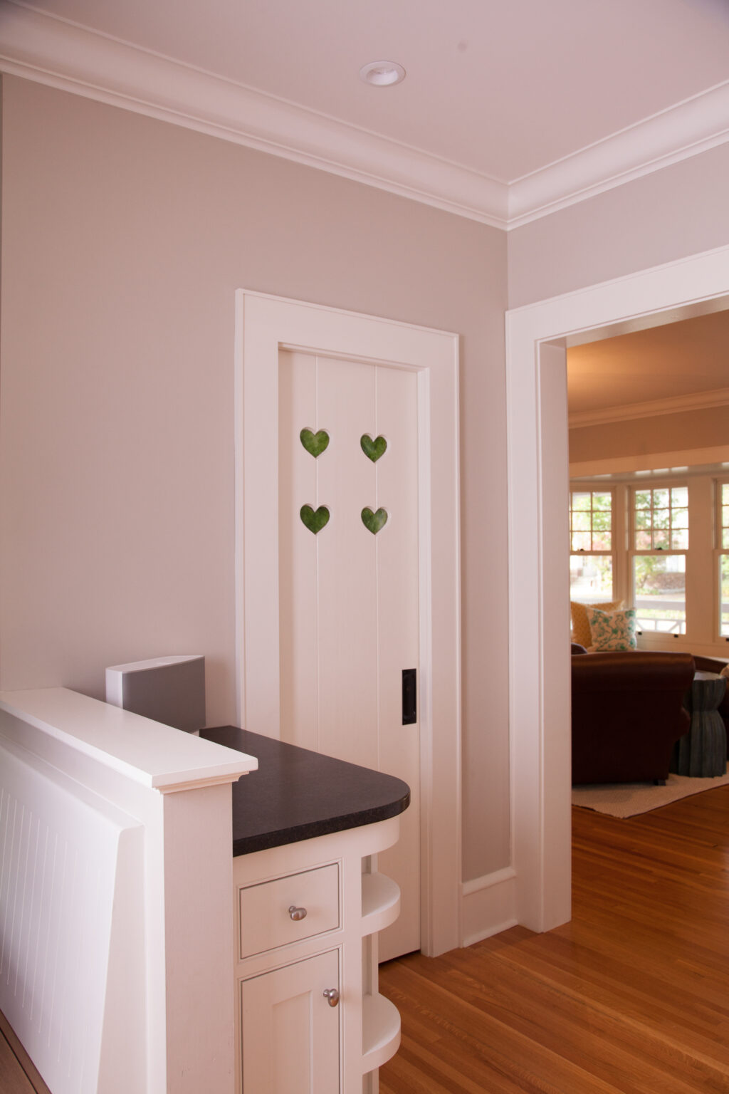 This Minneapolis remodel blends traditional charm with modern touches. Square-web railings and heart-shaped cutouts in select doors and cabinets add cottage-inspired warmth, while natural stone and wood contrast with bright white elements to create a timeless space. Project goals included repairing siding, improving curb appeal, creating a functional entry, and strengthening the connection to the outdoors, all while honoring the home’s early 1900s Craftsman style.