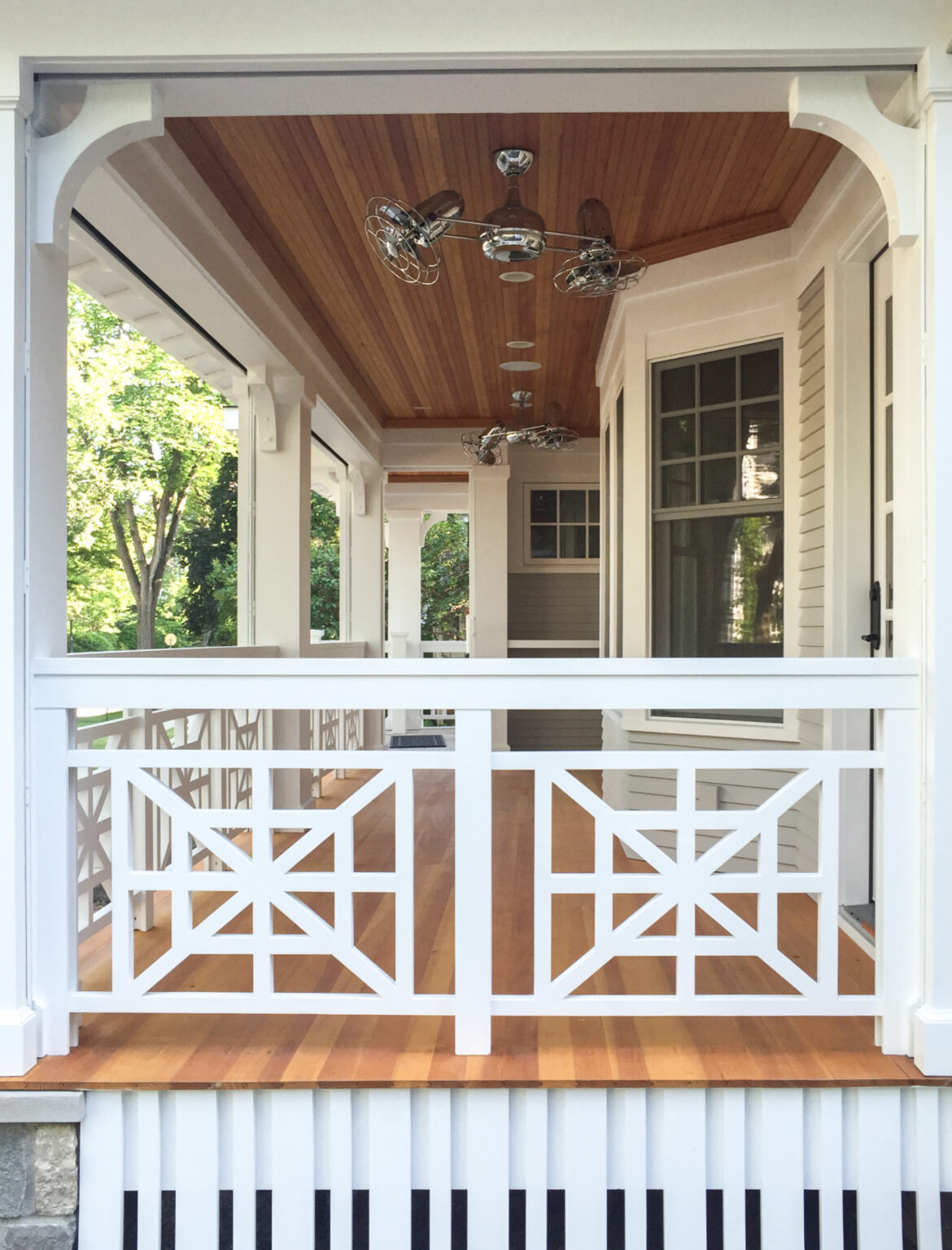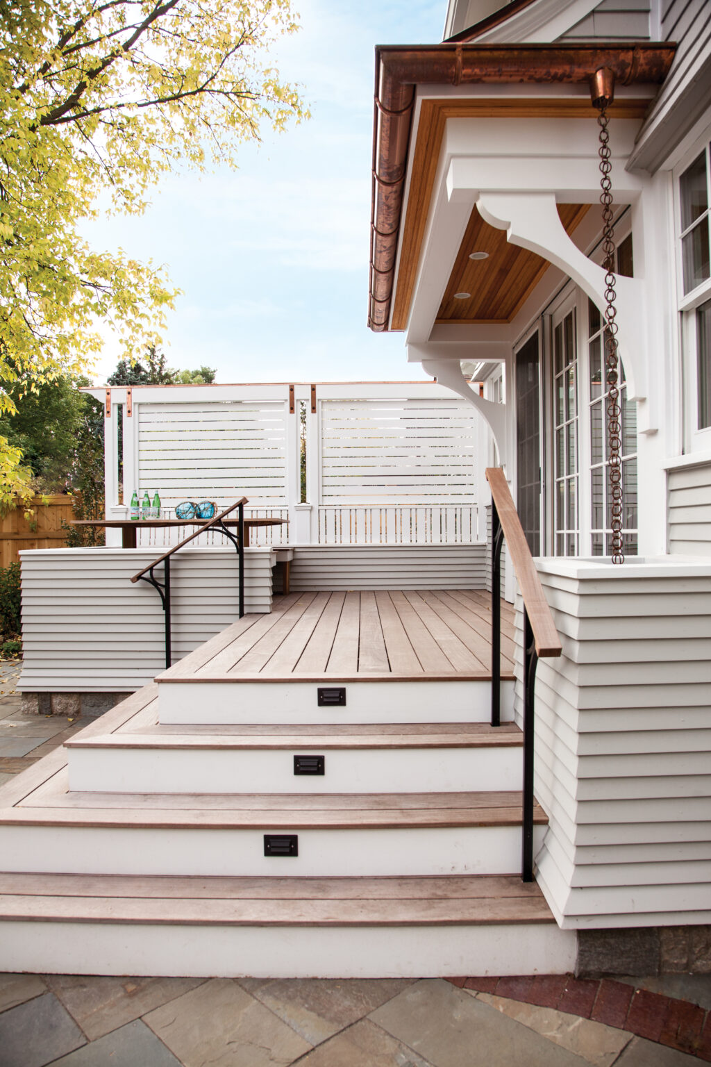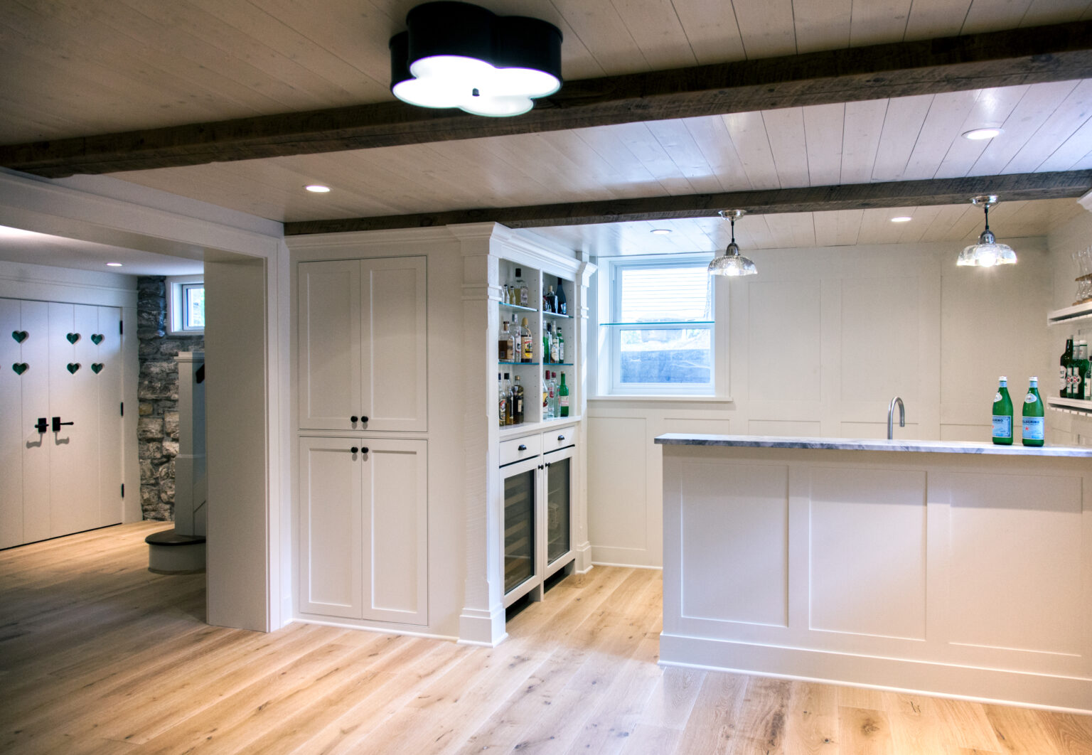 This Minneapolis remodel blends traditional charm with modern touches. Square-web railings and heart-shaped cutouts in select doors and cabinets add cottage-inspired warmth, while natural stone and wood contrast with bright white elements to create a timeless space. Project goals included repairing siding, improving curb appeal, creating a functional entry, and strengthening the connection to the outdoors, all while honoring the home’s early 1900s Craftsman style.