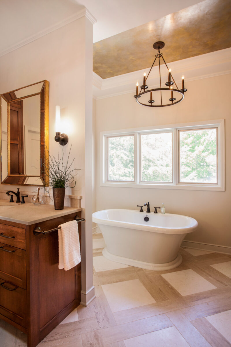 Custom cabinets, marble countertops, and travertine tile flooring give this primary suite a sophisticated, earthy feel. Cove ceilings accented with metal gold venetian plaster and chandelier light fixtures add a luxurious touch to this Long Lake primary bath.
