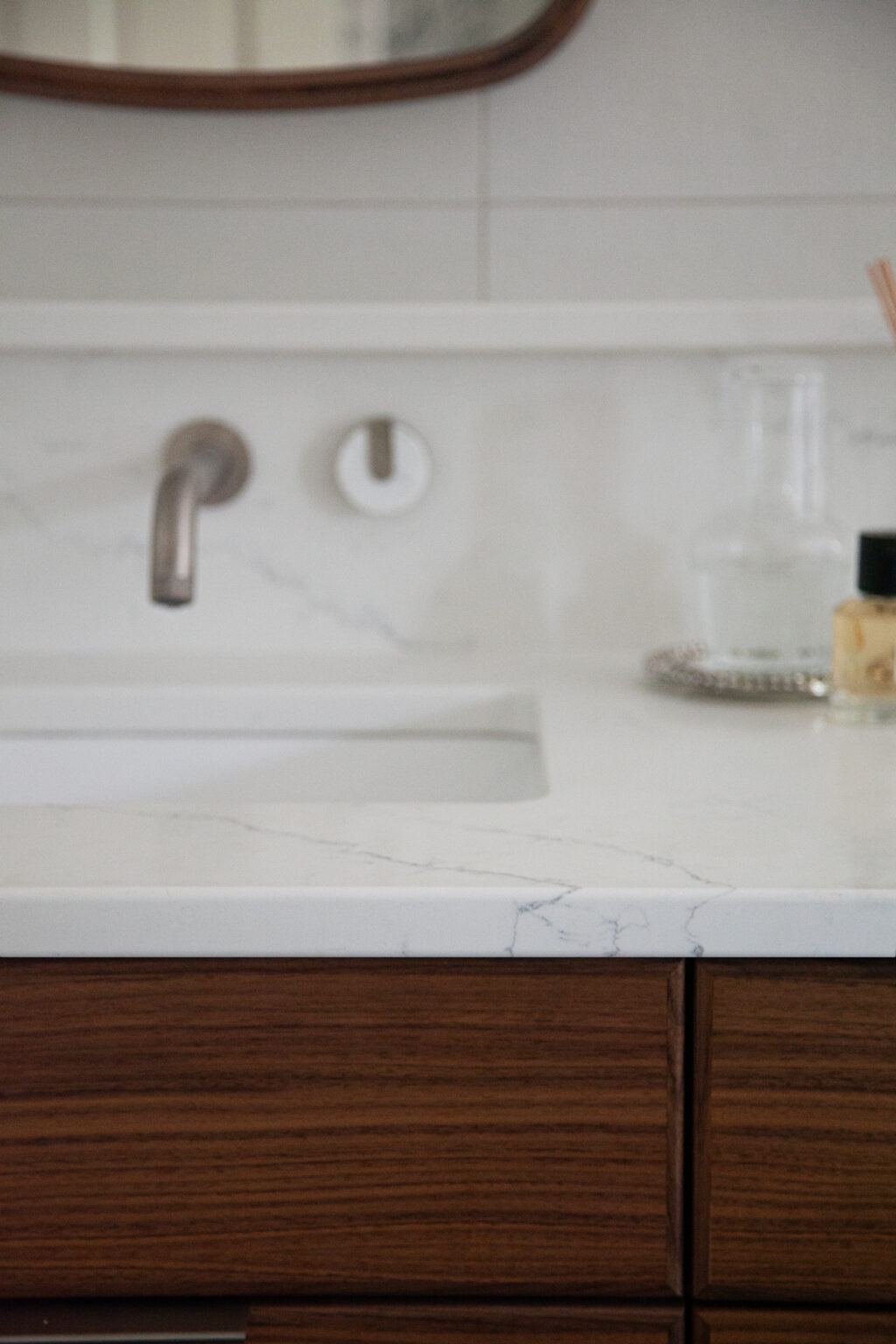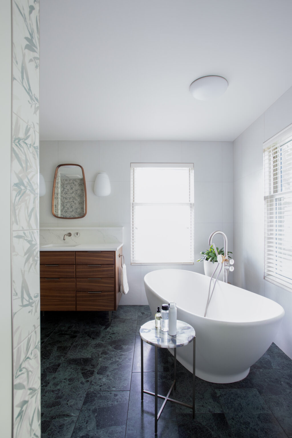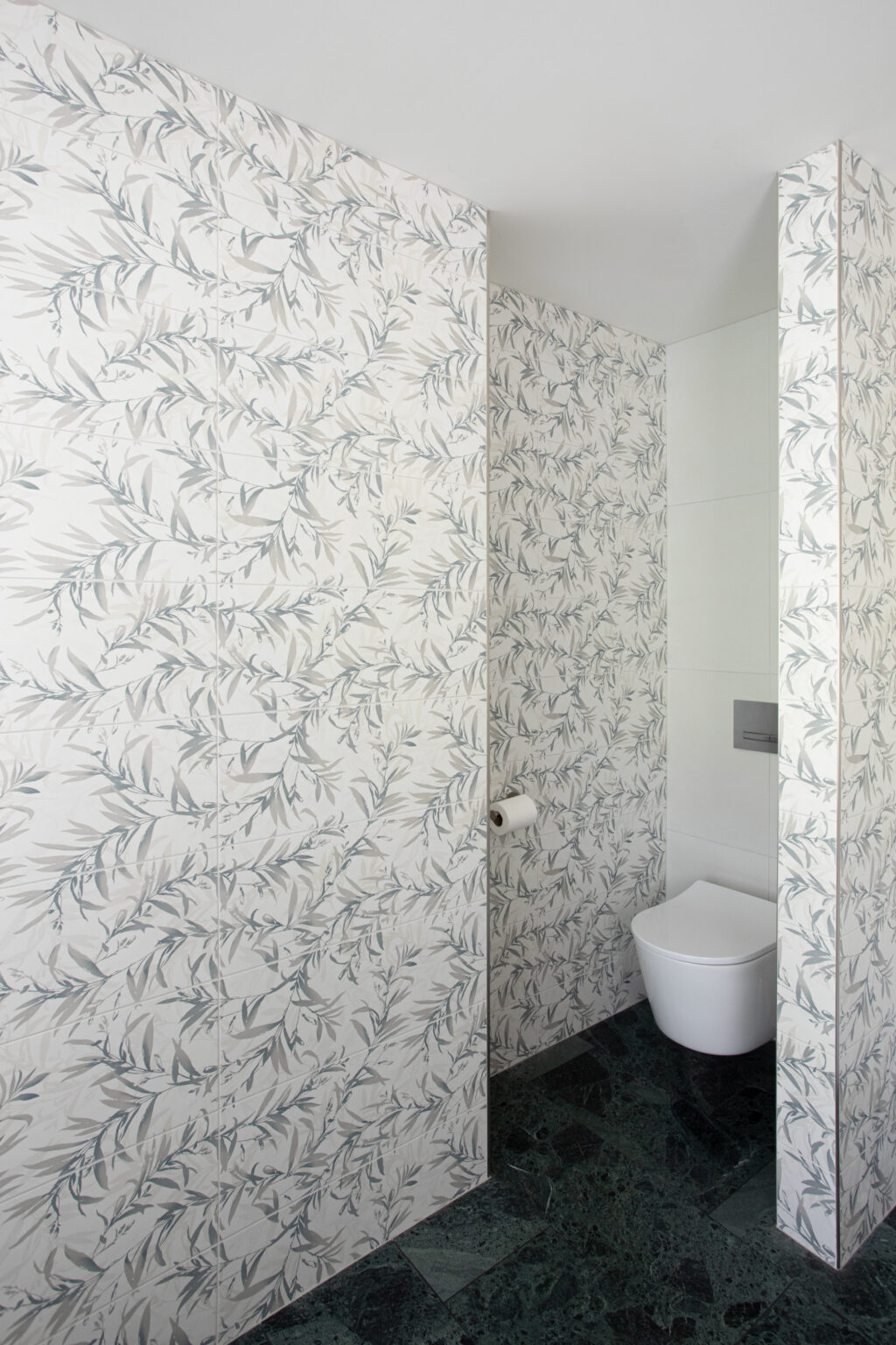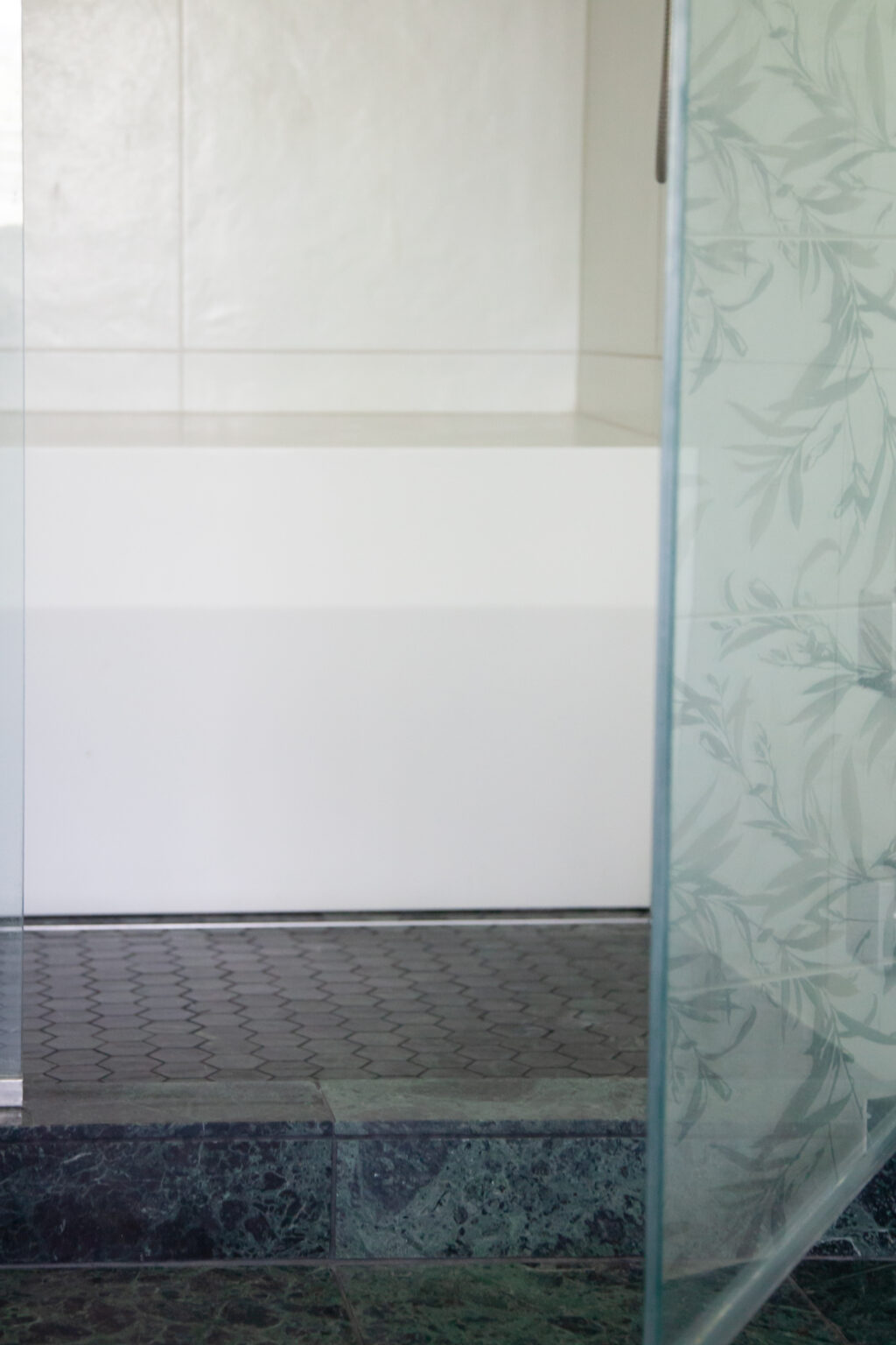 This European-inspired primary suite remodel brings the outdoors in with deep green Verde Alpi Serpentine floor tiles and softer foliage accent tile flecked with gold. Quartz countertops and walnut cabinets balance the rich colors and patterns with a refined, sophisticated vanity.