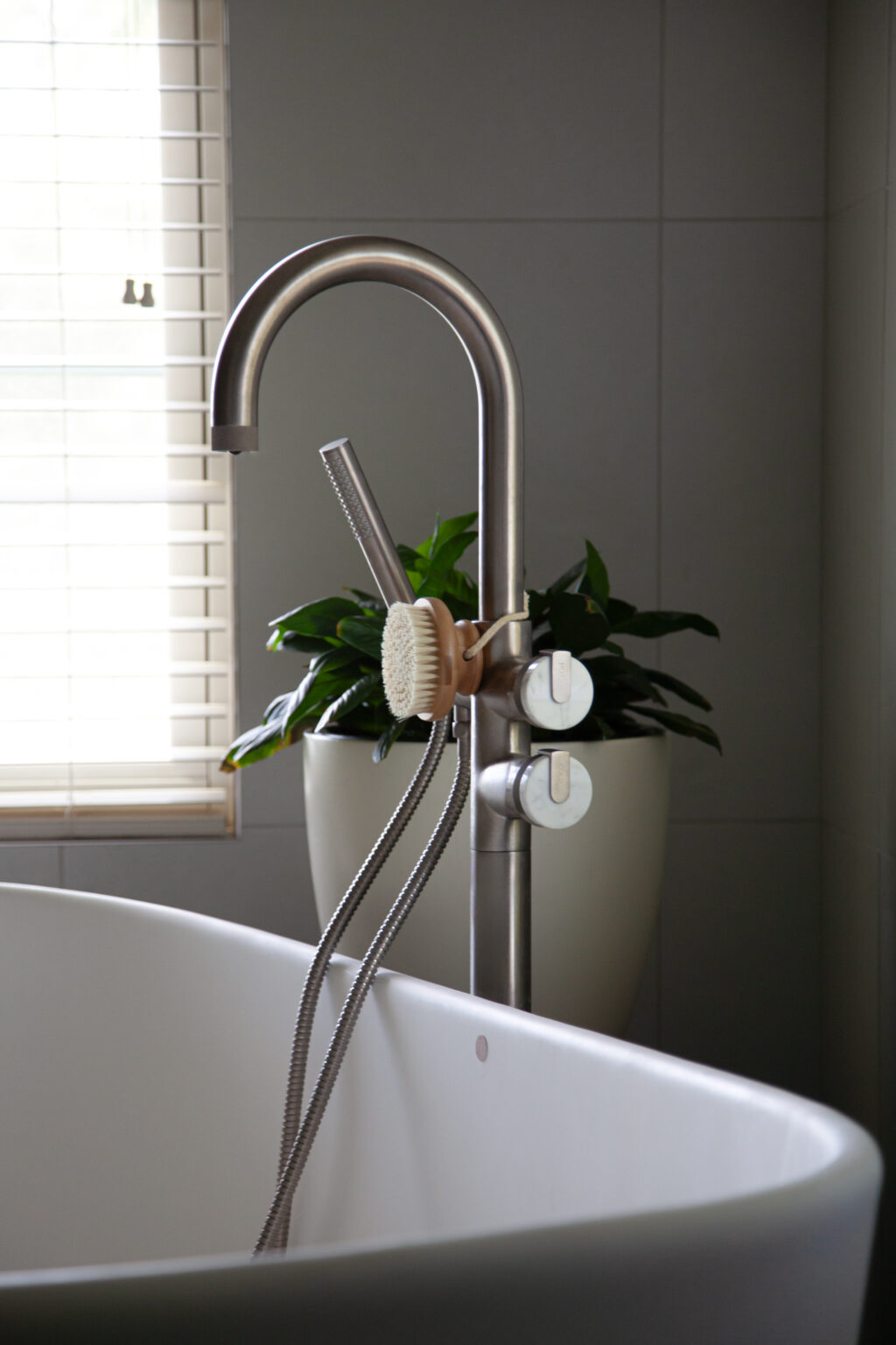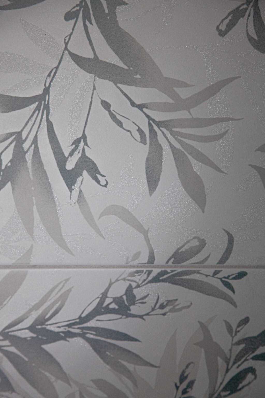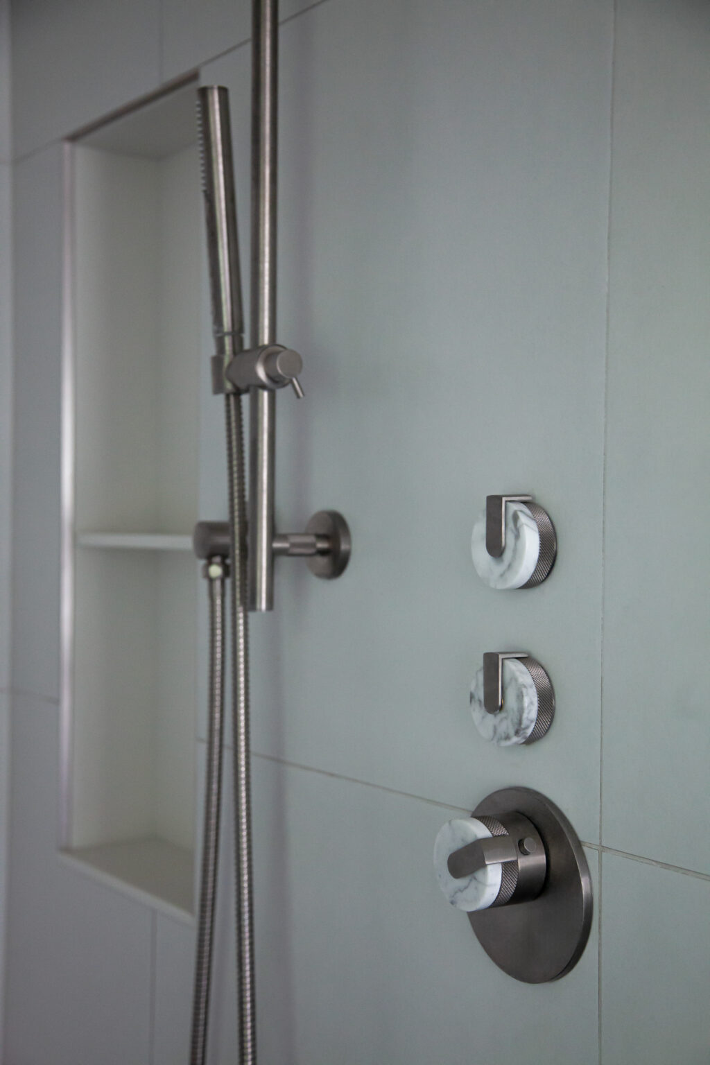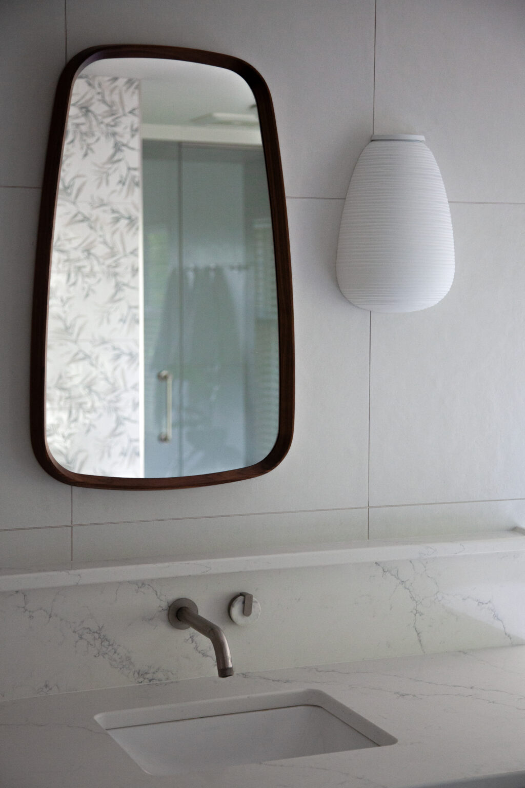 This European-inspired primary suite remodel brings the outdoors in with deep green Verde Alpi Serpentine floor tiles and softer foliage accent tile flecked with gold. Quartz countertops and walnut cabinets balance the rich colors and patterns with a refined, sophisticated vanity.
