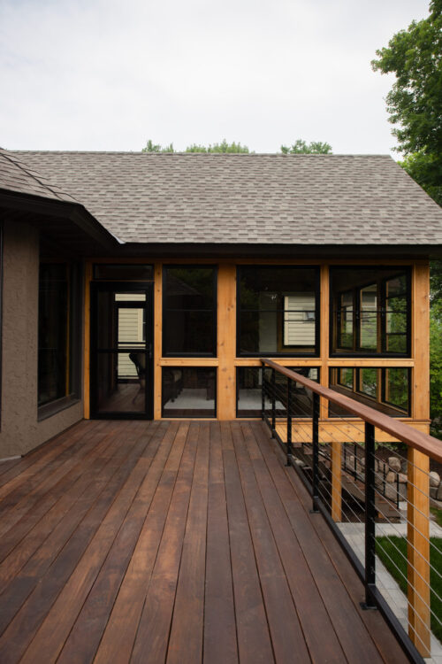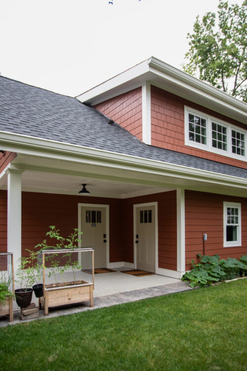 Designed to bring the outdoors in, this remodel replaces a failing porch and roof with a durable, better-performing hip roof. Oversized windows fill the home with light, while painted blue cement floors offer beauty and resilience for an active family. A relocated back door creates space for a simple, functional mudroom with shelves, hooks, and a bench.