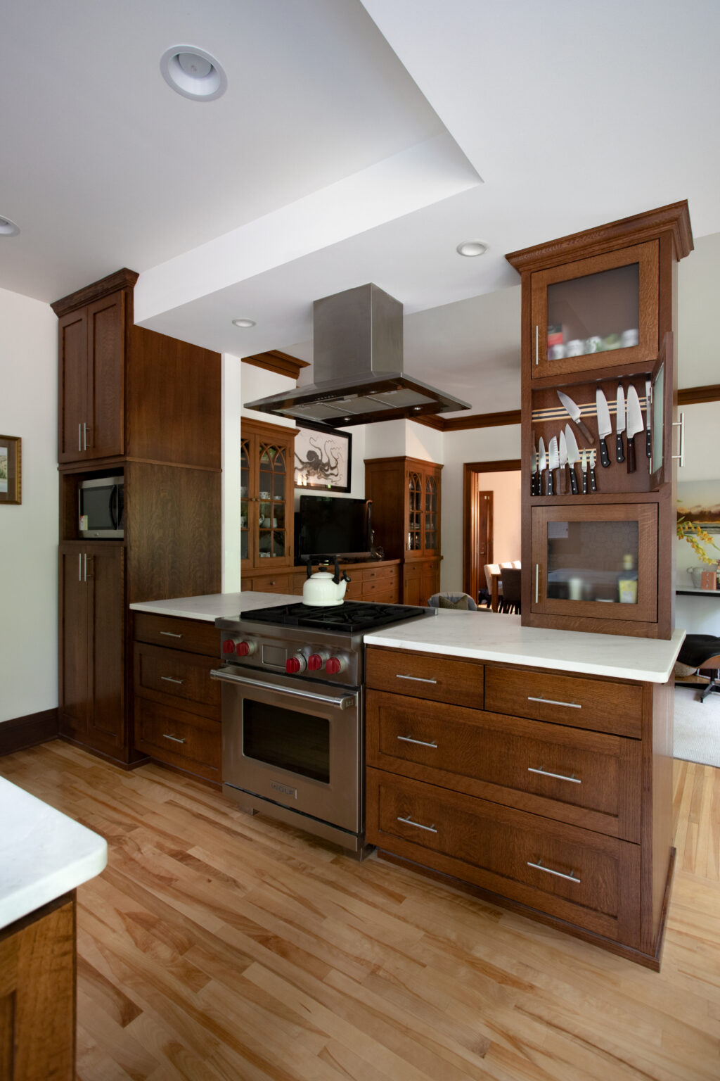 This Lynnhurst kitchen remodel features a custom oak island post wrap, a delightful new backsplash, and fresh countertops. New plumbing and light fixtures in the kitchen and dining room create a cohesive and upgraded space for cooking and dining.