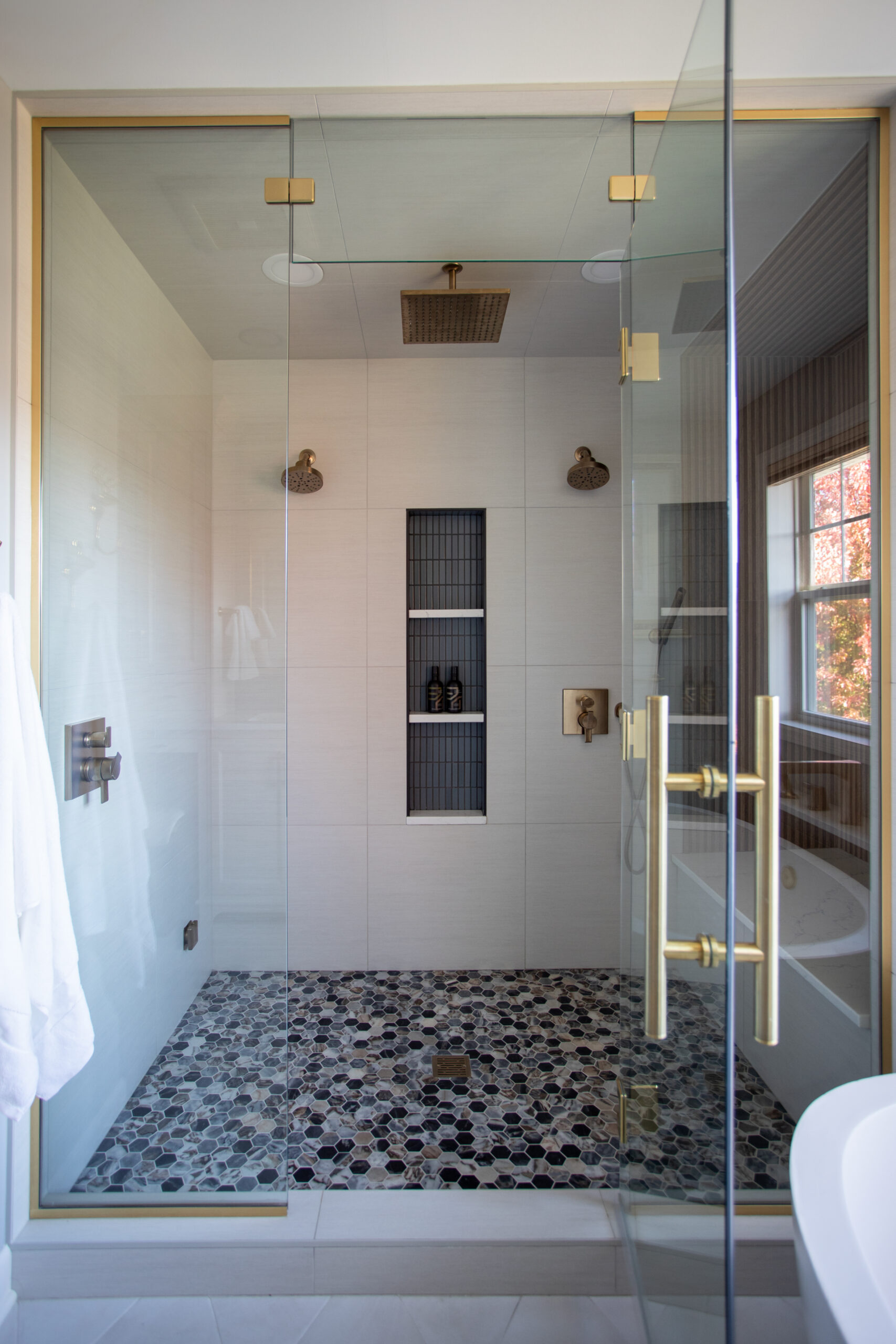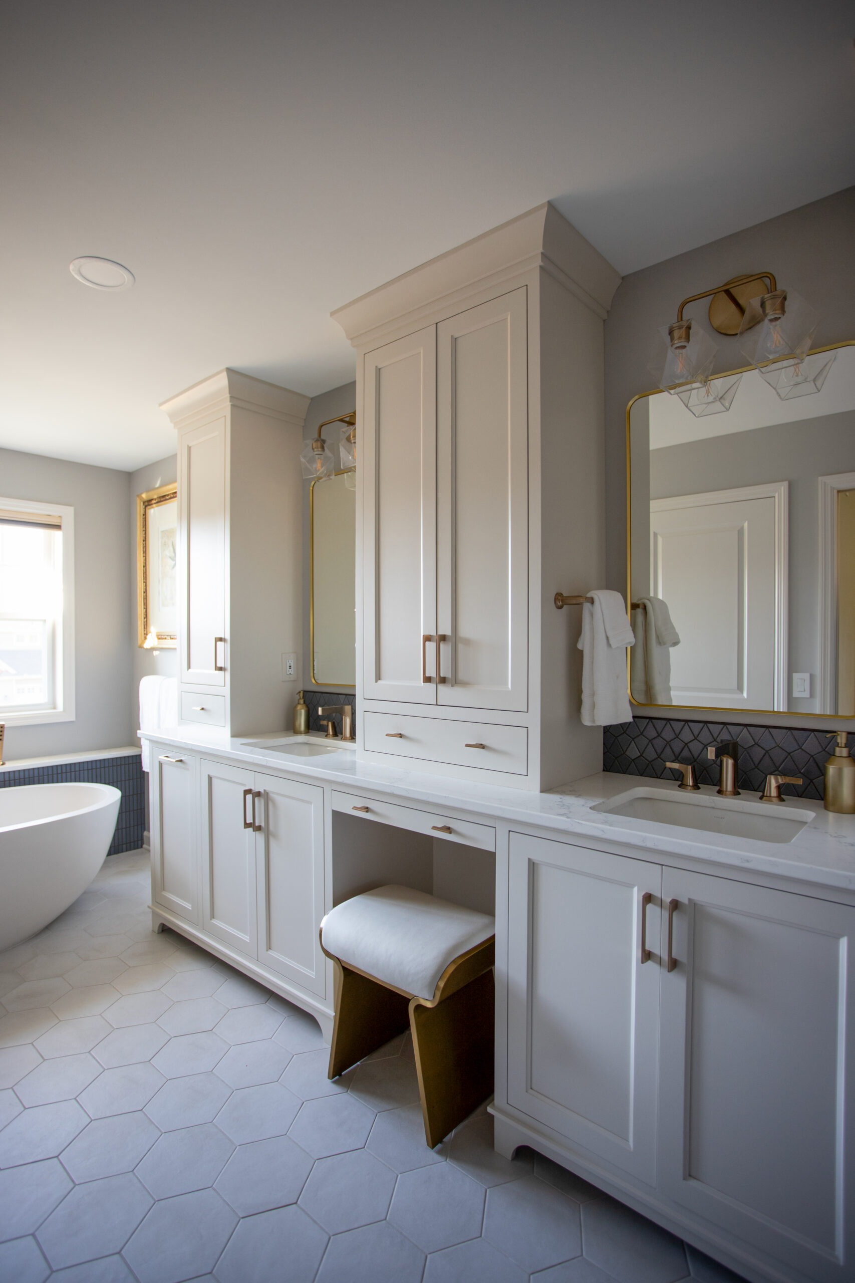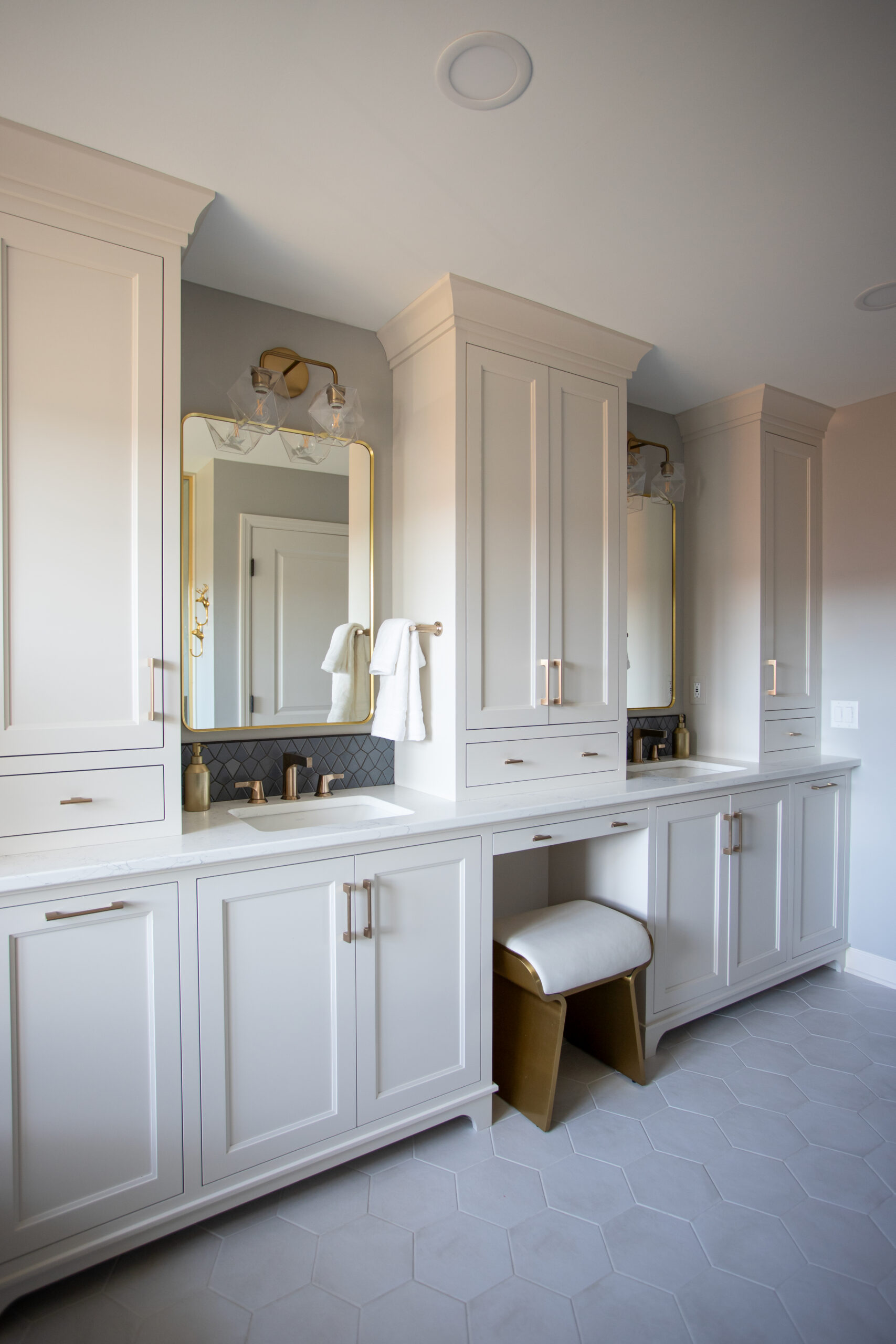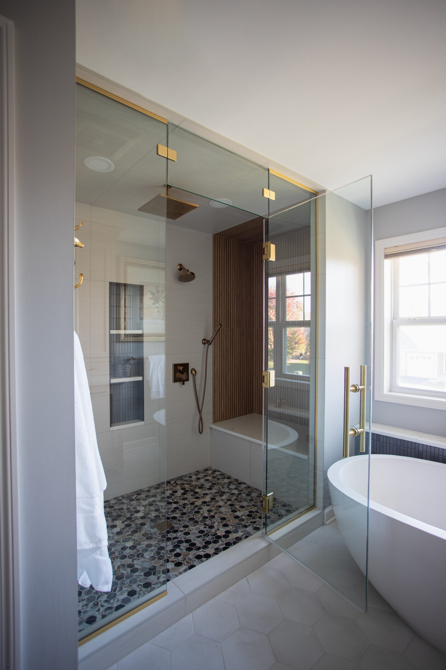 This Maple Grove primary suite remodel is defined by warmth and thoughtful detail. Custom cabinetry and brass fixtures shape a vanity with generous storage. The shower is lined in grooved wood-look tile, bringing soft movement, while a mosaic floor adds texture beneath. Together, the materials create an elegant, contemporary space well suited to a primary suite retreat.