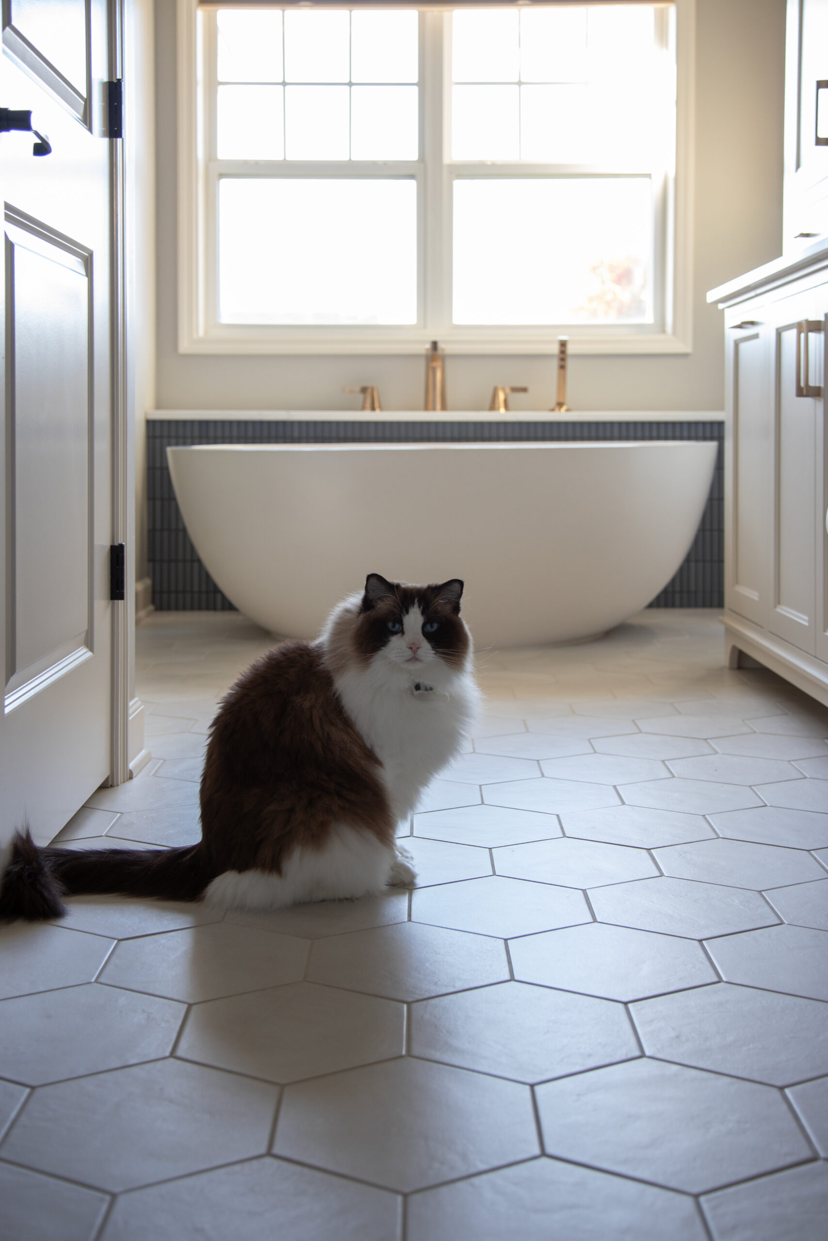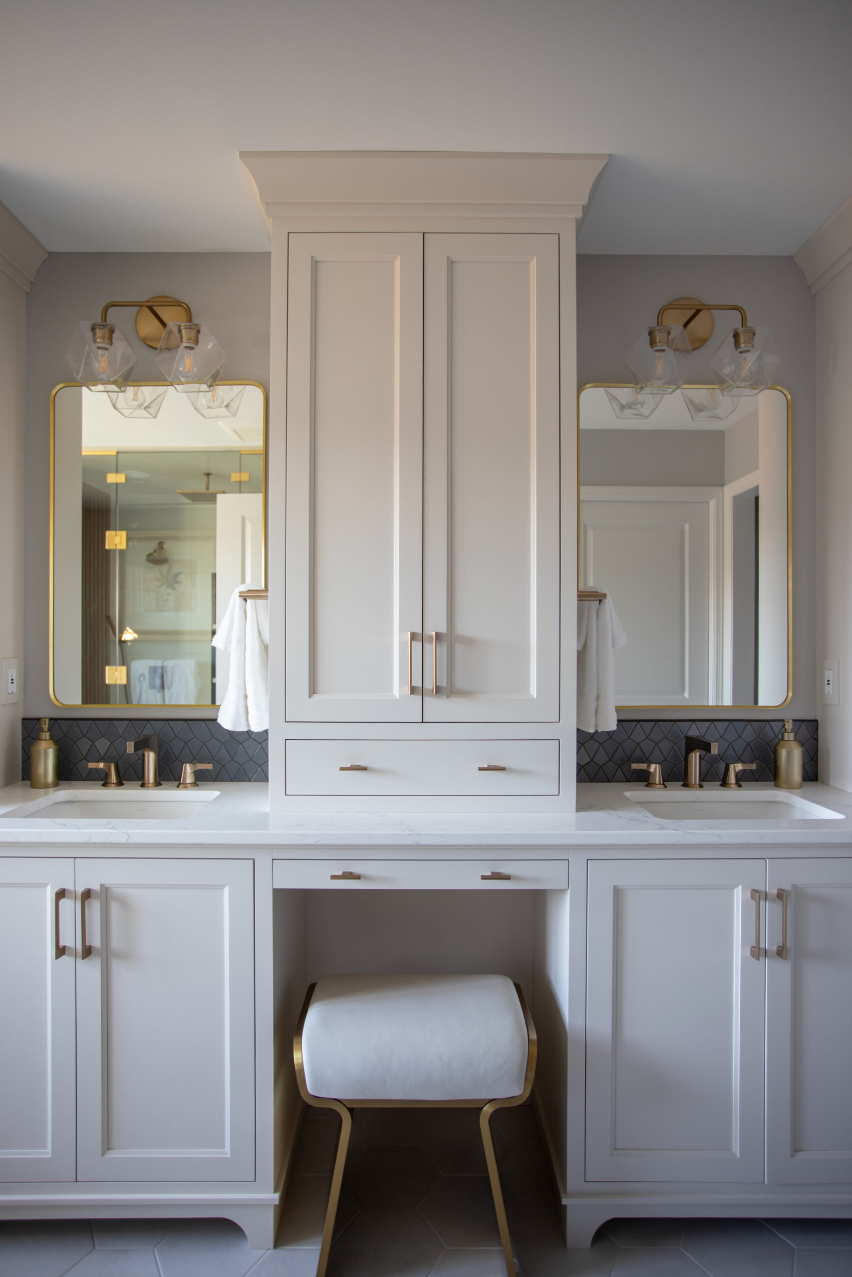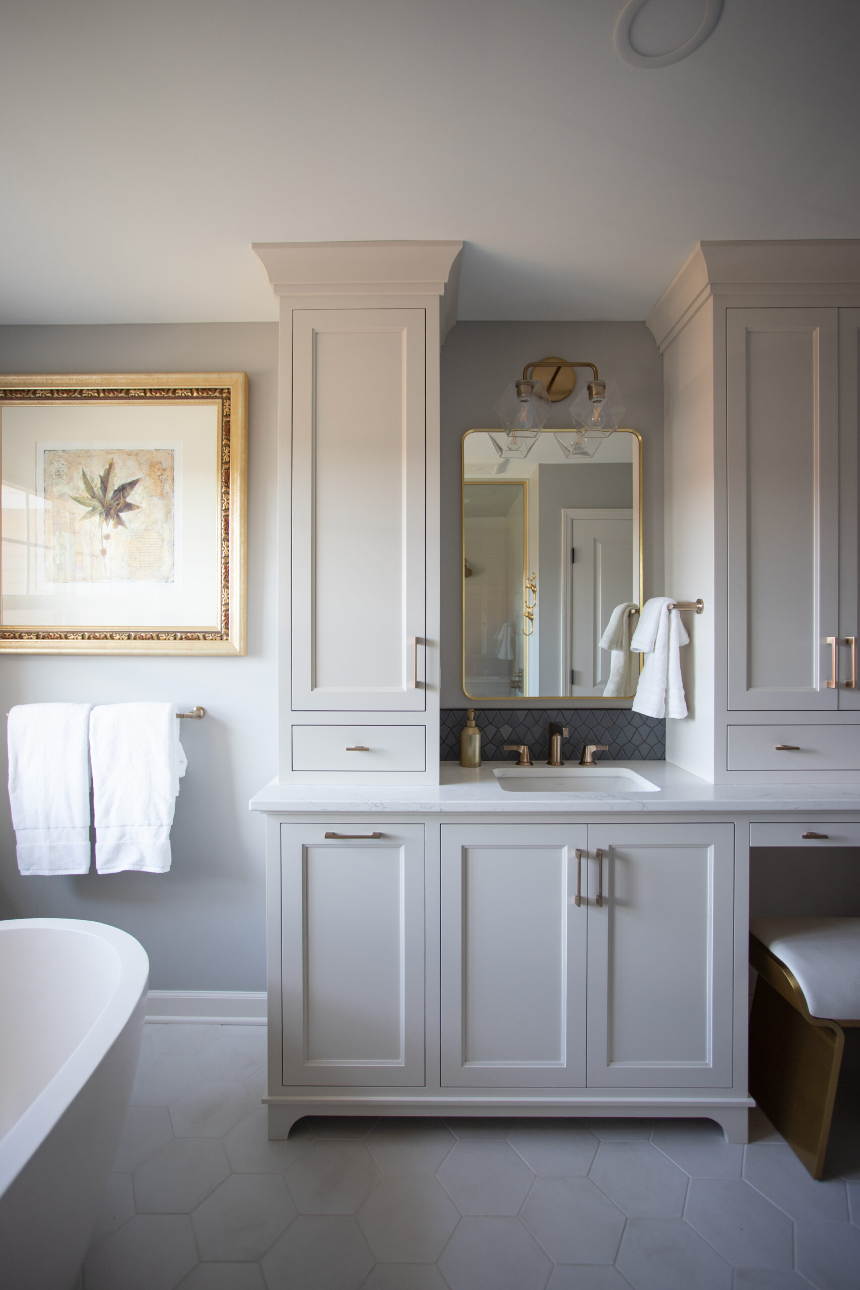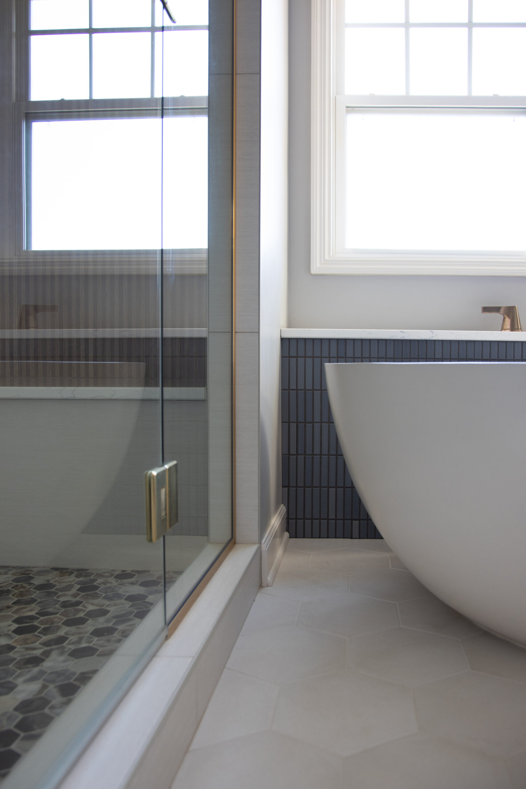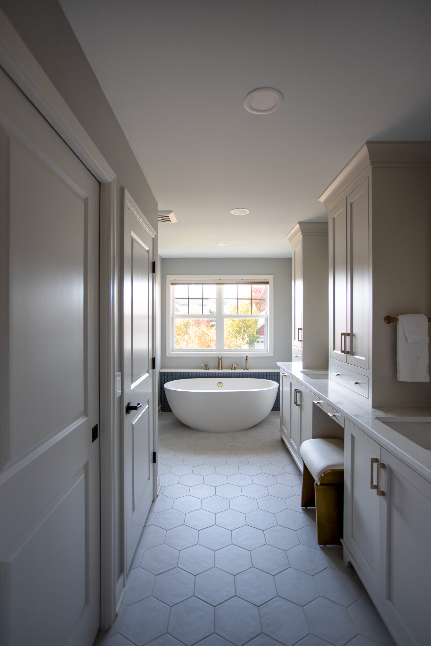 This Maple Grove primary suite remodel is defined by warmth and thoughtful detail. Custom cabinetry and brass fixtures shape a vanity with generous storage. The shower is lined in grooved wood-look tile, bringing soft movement, while a mosaic floor adds texture beneath. Together, the materials create an elegant, contemporary space well suited to a primary suite retreat.