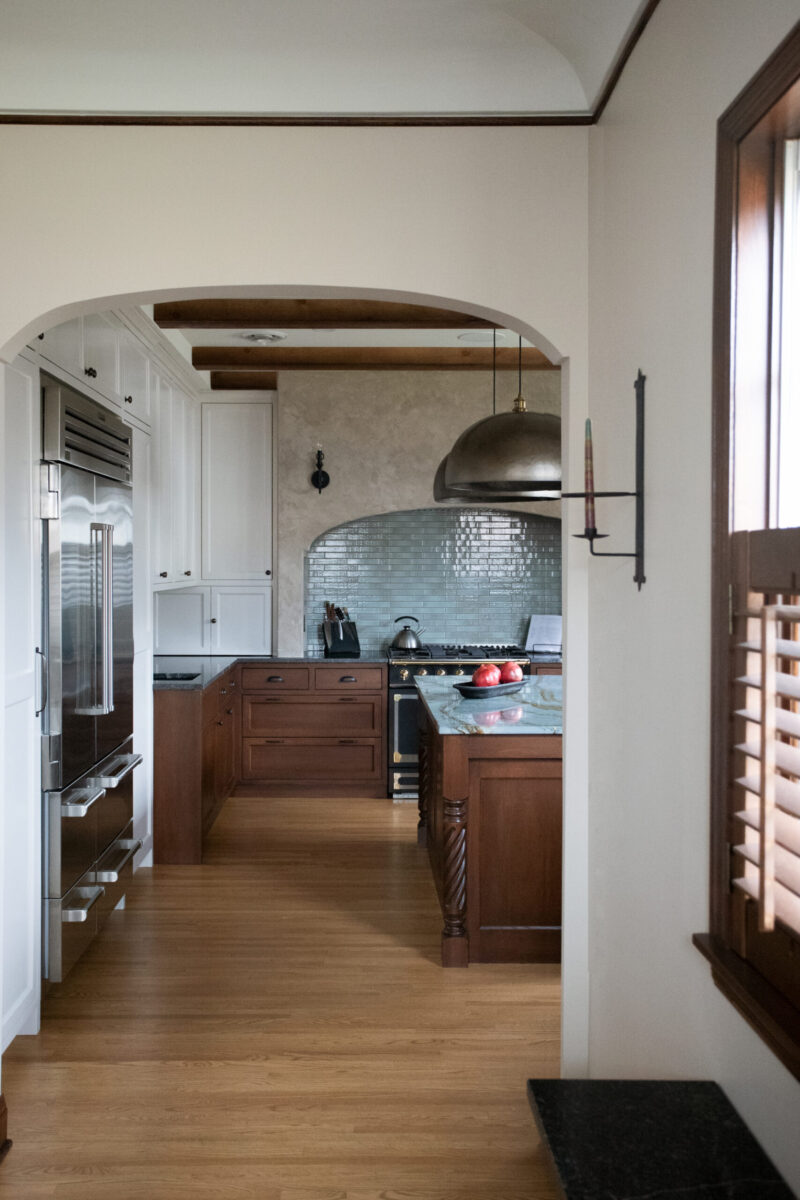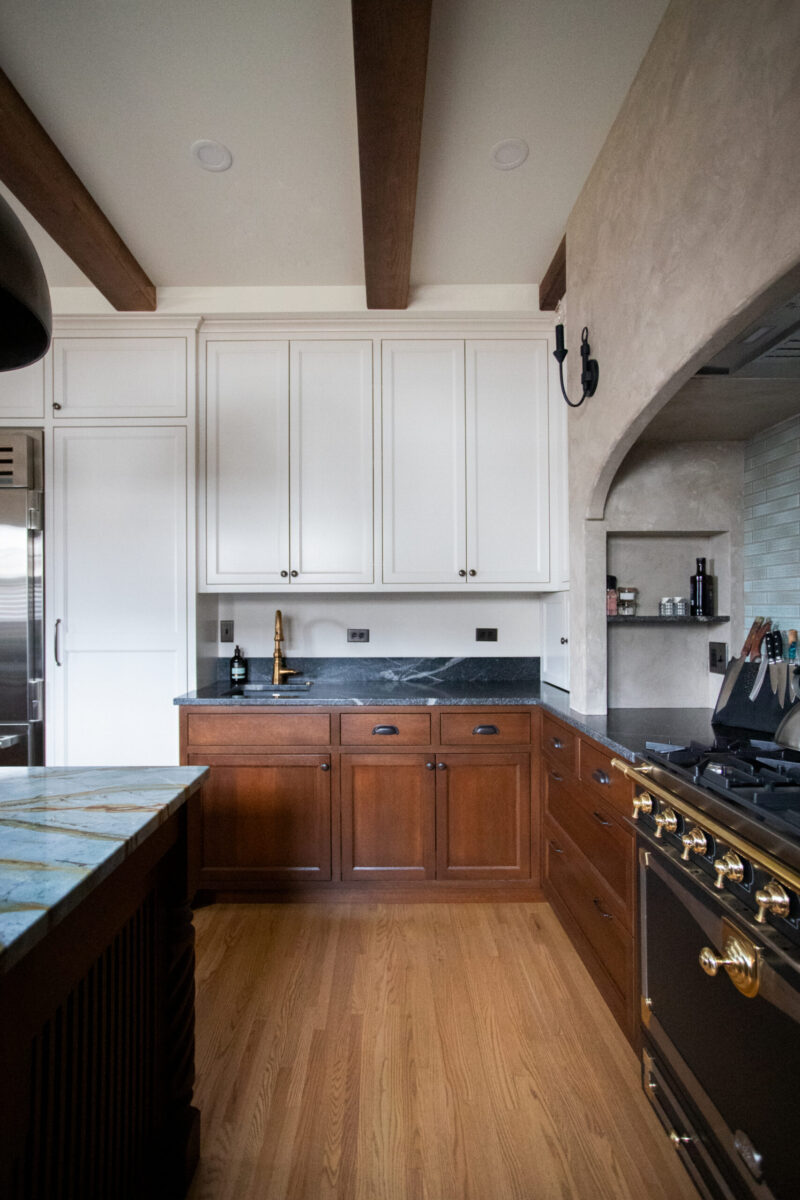 This Mediterranean-style kitchen contrasts light upper cabinets and soft waterfall blue backsplash with the darker wood of the lower cabinets and striking charcoal grey granite countertops. Black and gold hardware accents and hammered brass dome pendants give this kitchen an elegant, dramatic feel as the focal point of this Minneapolis home.