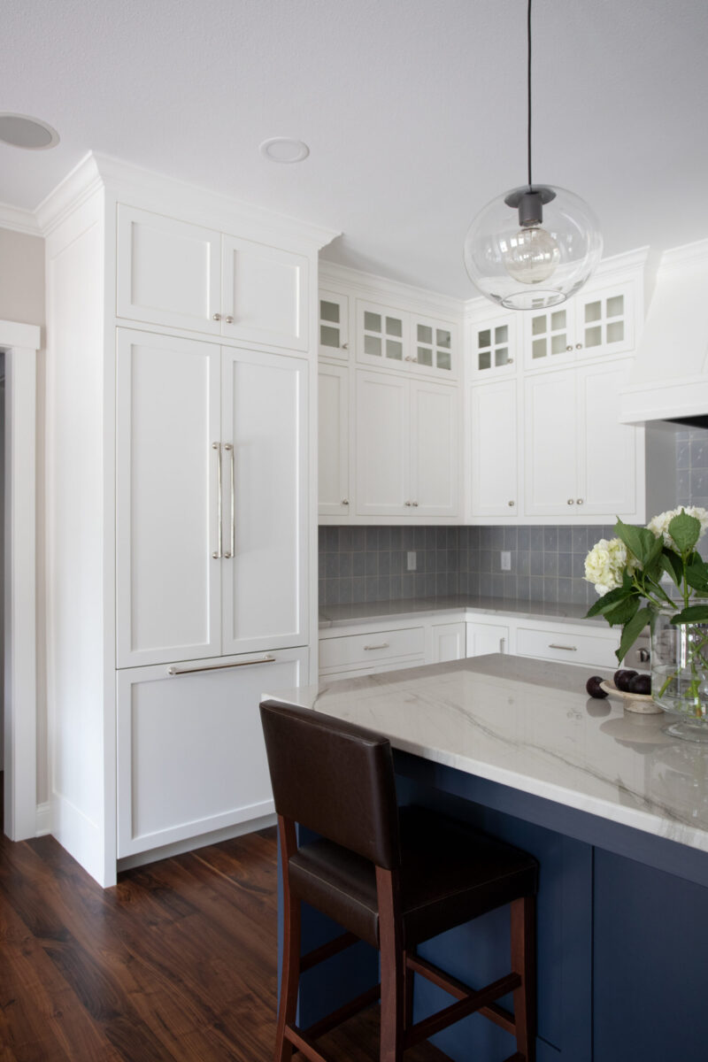 This elegant kitchen remodel in Edina’s Cedar-Isles-Dean neighborhood combines light, airy custom white transom cabinets and clear hanging pendants with deep walnut flooring and a striking navy blue island for a balanced, sophisticated feel.