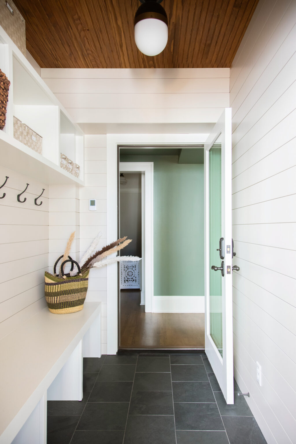 Featuring white shiplap walls and natural wood ceilings throughout the addition, custom built in storage, and a stunning Green Bowenite marble fireplace, this Minneapolis mudroom and porch addition is as functional as it is beautiful.