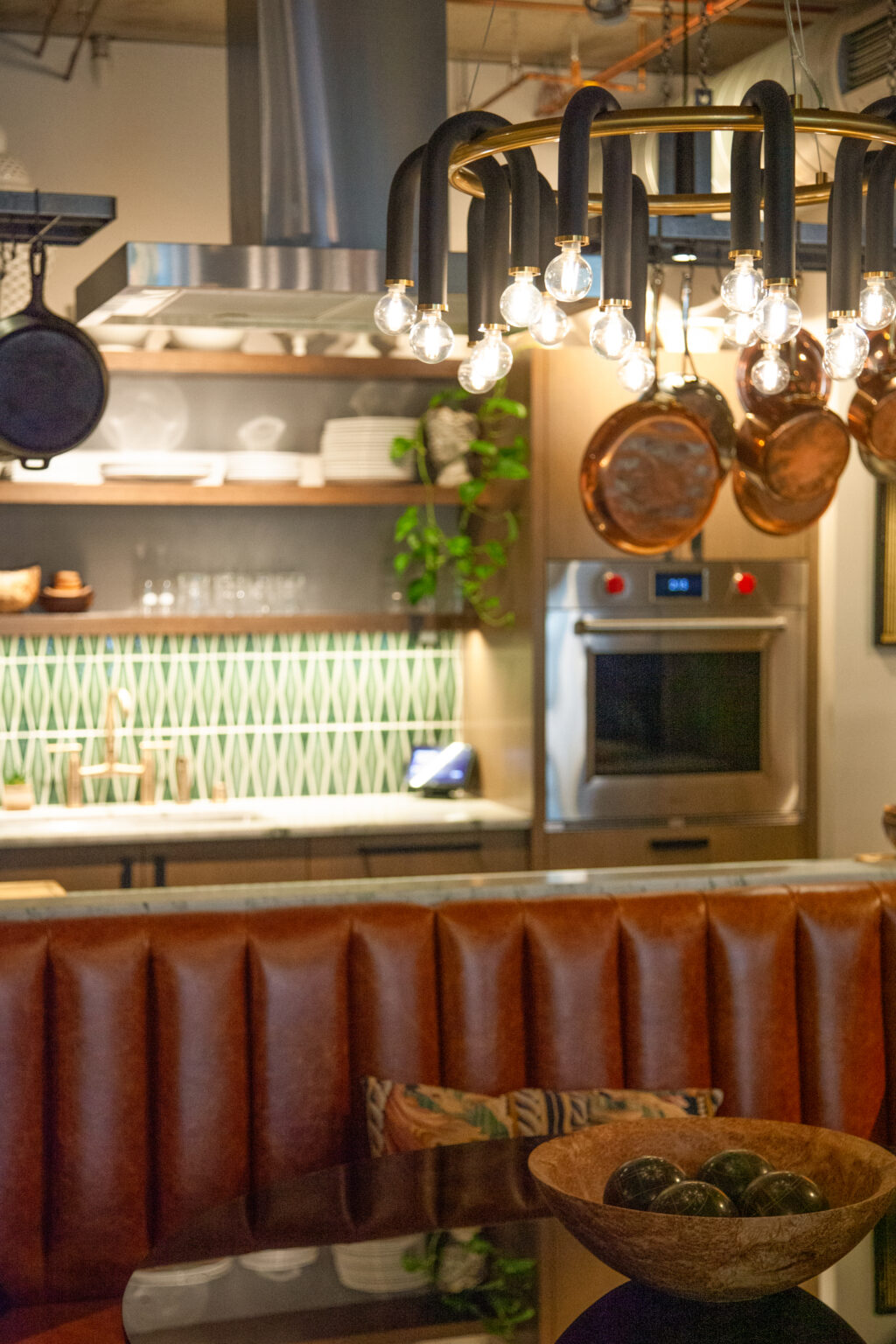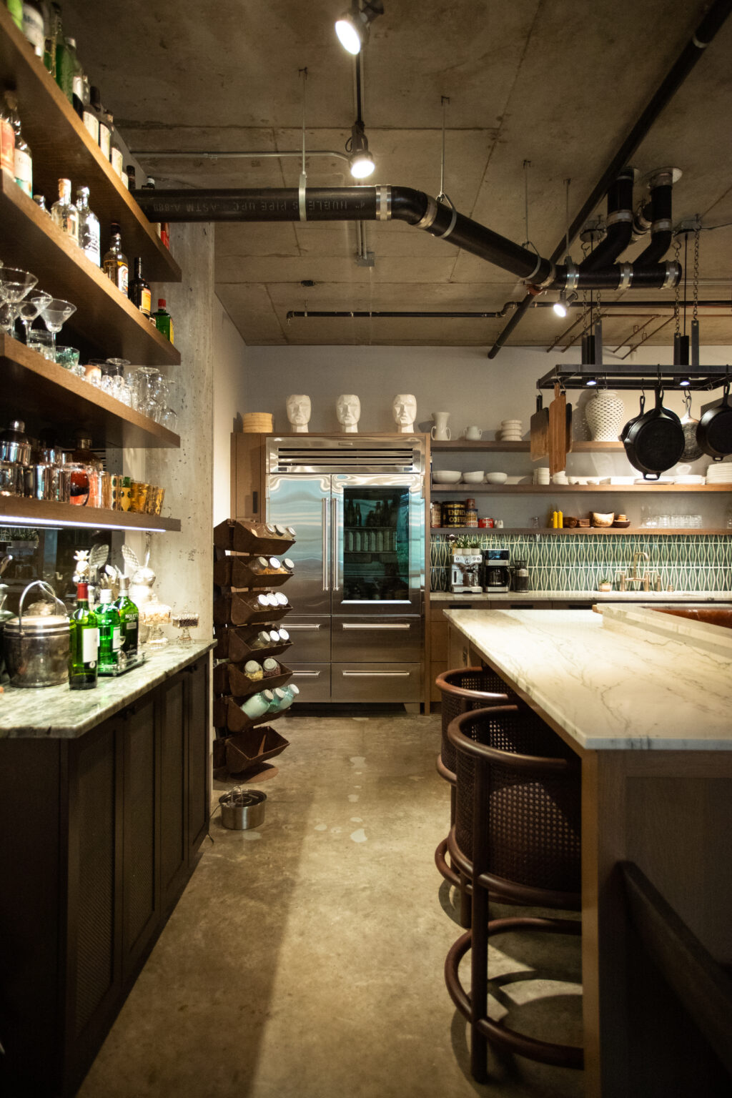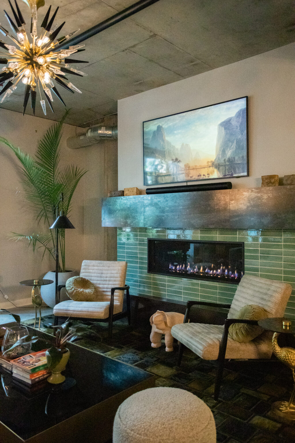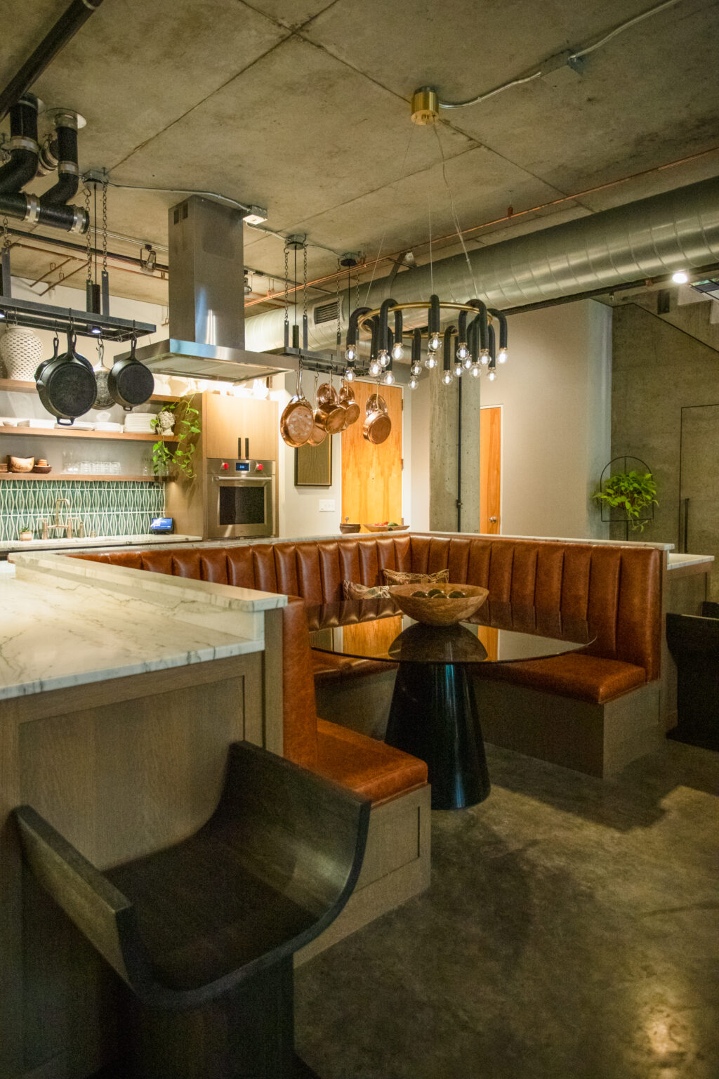 This industrial-artistic remodel transforms a once-generic condo into a vibrant, social space. An emerald green mosaic backsplash, lemurian blue granite countertops, and exposed concrete ceilings bring modern edge and warmth. A custom U-shaped kitchen banquette and gas fireplace create inviting focal points, blending function, texture, and personality for effortless entertaining.
