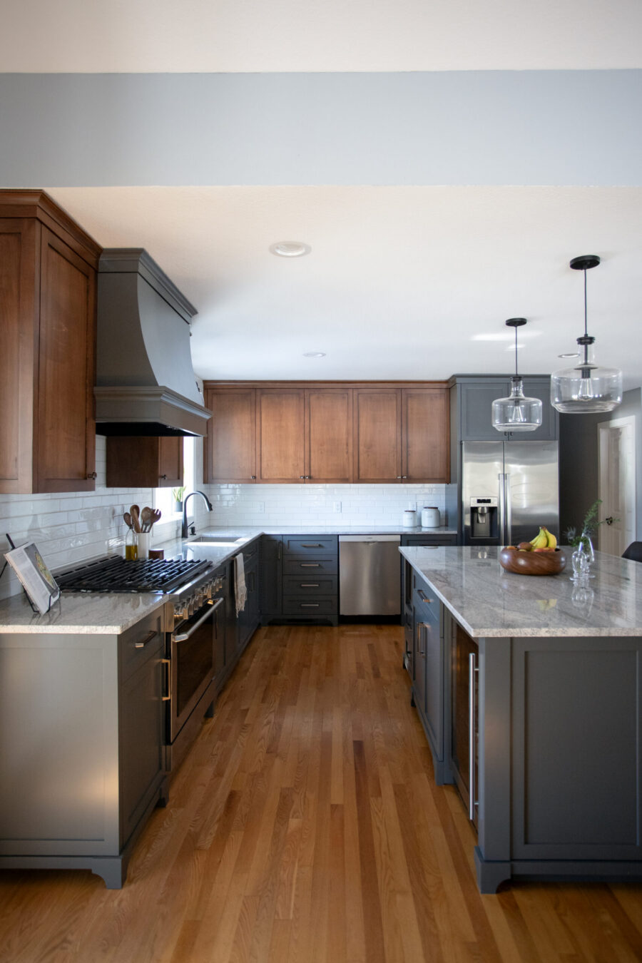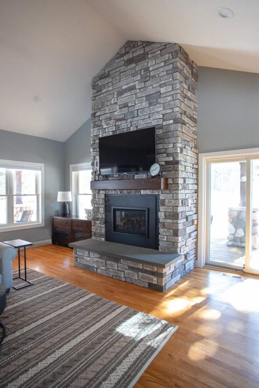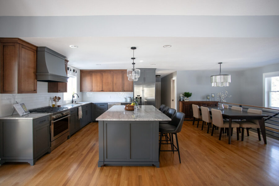 A classic kitchen designed for both gathering and everyday use. An oversized island anchors the space, finished in a soft blue that contrasts with warm maple cabinetry. Granite countertops and a stone fireplace add weight and texture, while thoughtful storage and an open layout to the surrounding rooms create a natural flow for entertaining and family life.