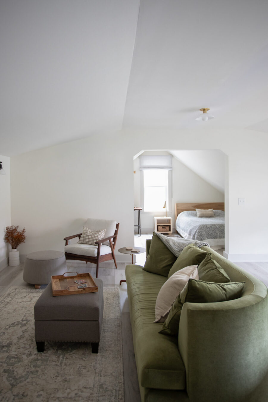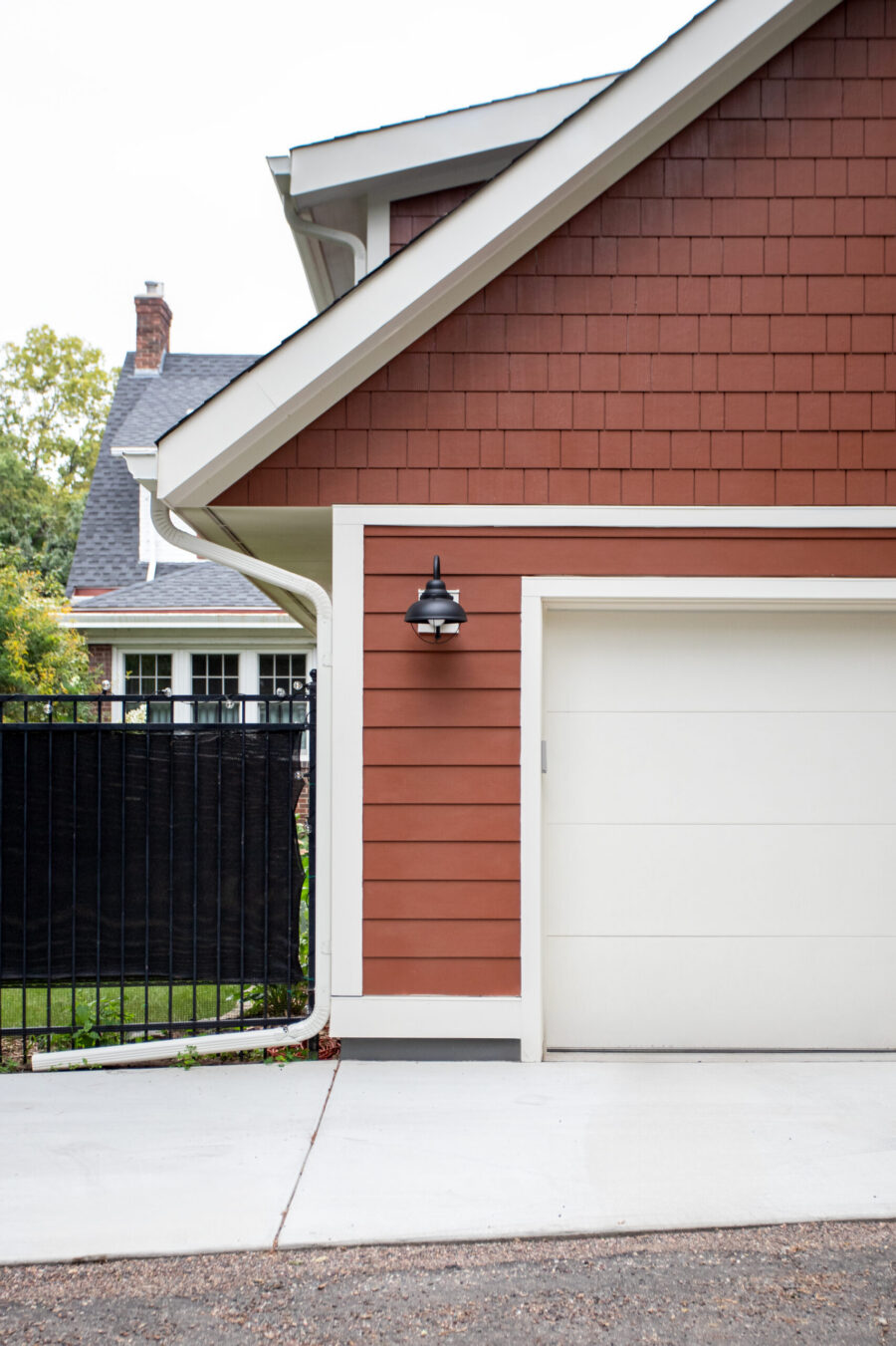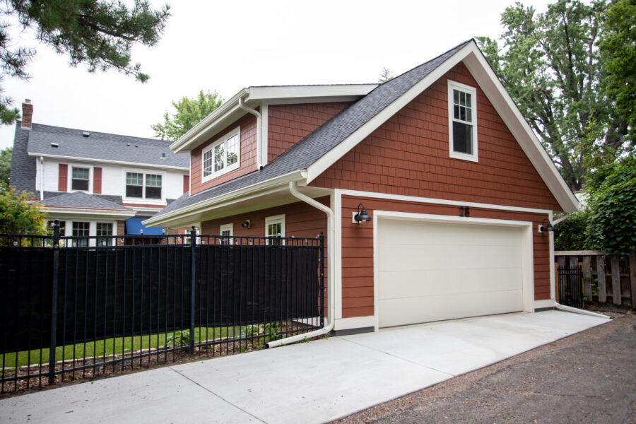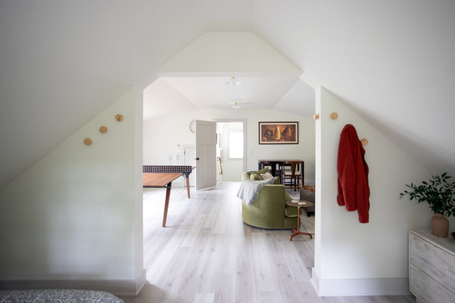 An inefficient tandem garage behind a Merriam Park home was torn down and rebuilt as a two-car garage with a finished ADU above. TreHus designed the new garage with cedar shake siding and black sconce lighting — a crafted exterior that fits naturally into the historic St. Paul neighborhood. Upstairs, the vaulted roofline shapes a bonus room for games, gatherings, and overflow sleeping for kids, with light oak floors and dormer windows that flood the space with natural light.
