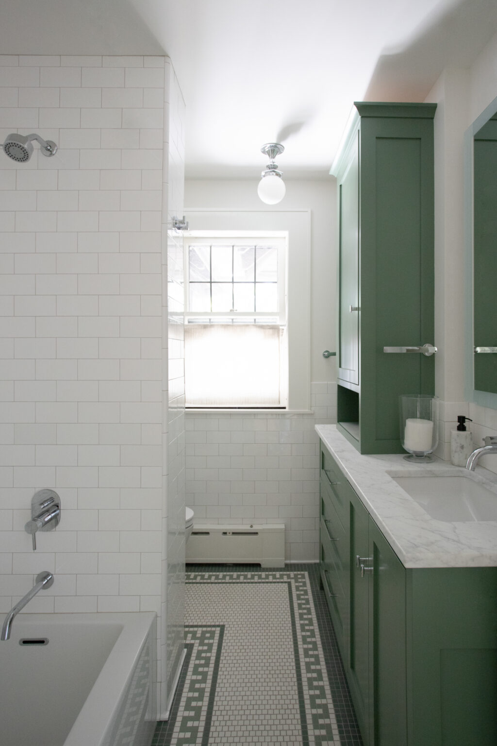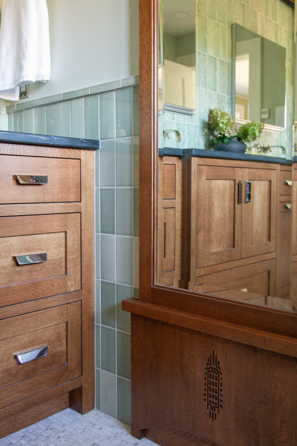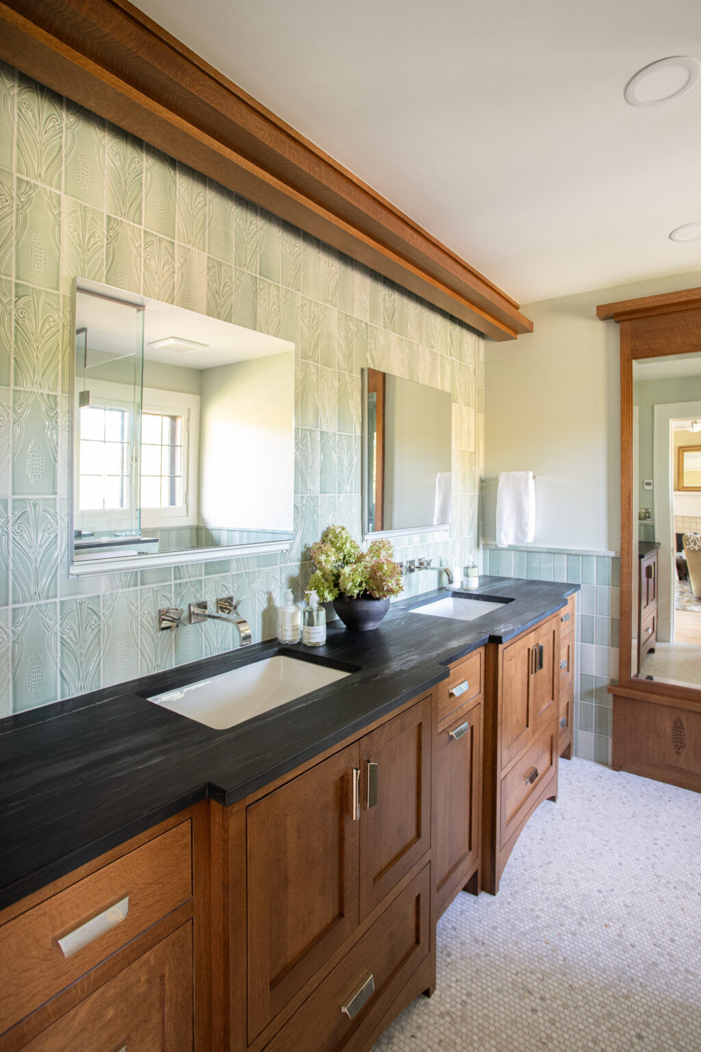 This St. Paul remodel reimagines the primary suite and second-floor bathroom while honoring the home’s original 1910 character. The primary suite was expanded with adjacent rooms, featuring crisp white wainscoting, dark accents, and Craftsman details throughout. The primary bathroom includes soapstone countertops and handmade sea-gloss tile, while the second-floor bathroom was reconfigured with historically accurate tiles and added storage.