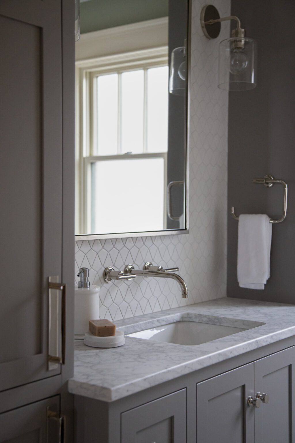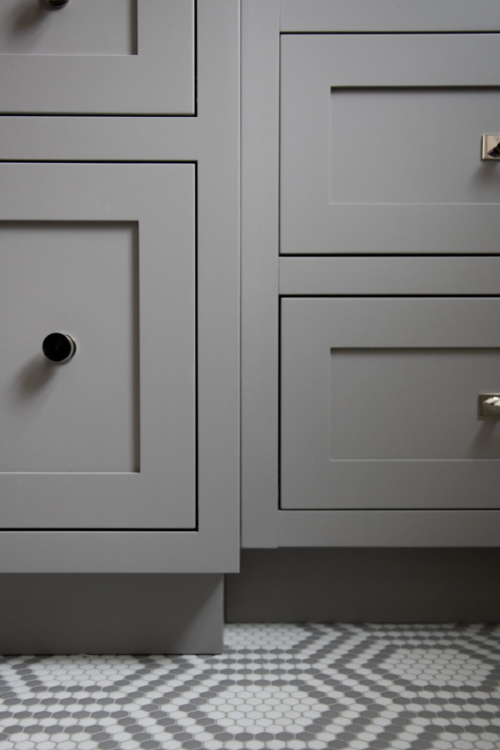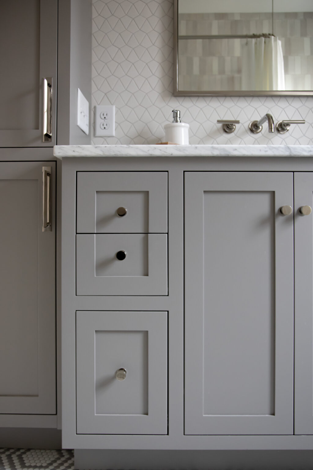 This bathroom remodel brings a modern twist to a traditional bathroom with unique tiling, sleek hardware, and muted colors throughout the space. Three distinct varieties of grey and white tiles fill this space with texture and visual interest.