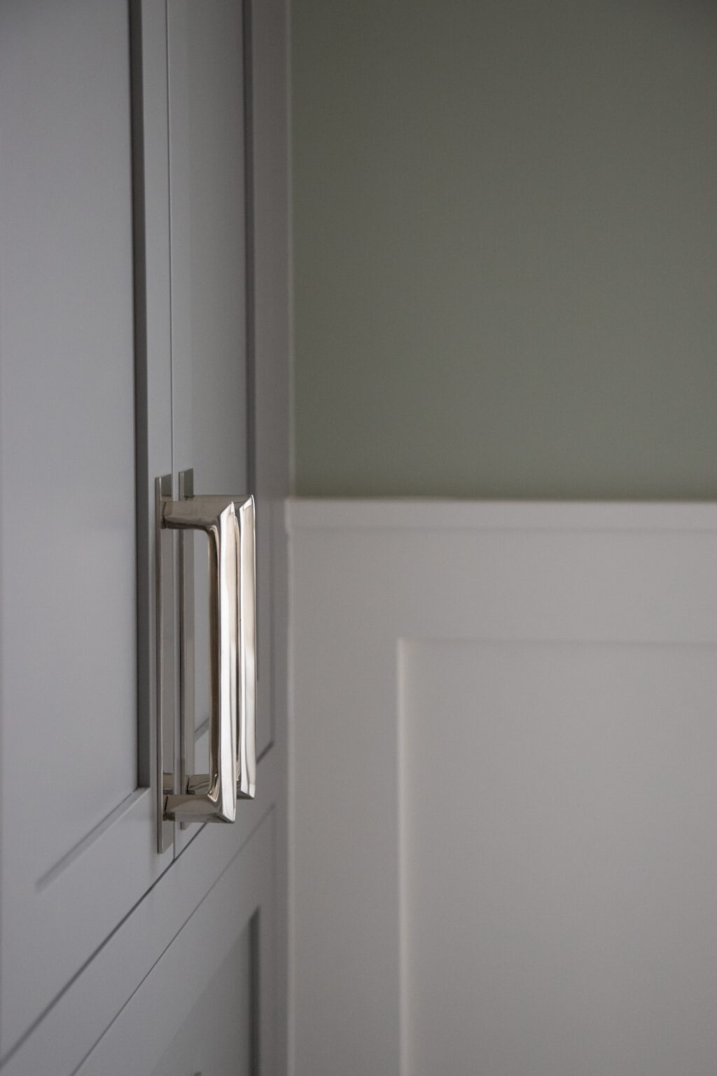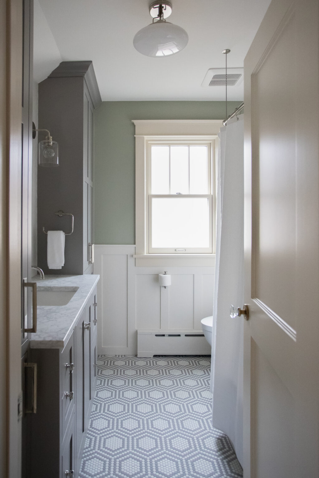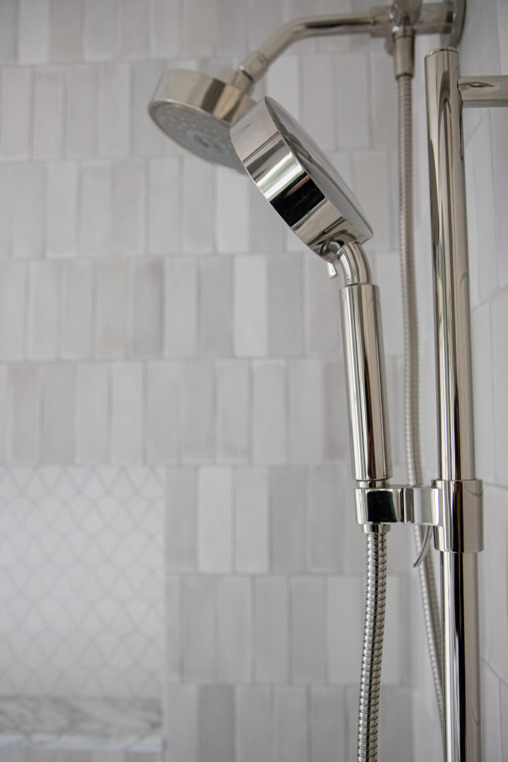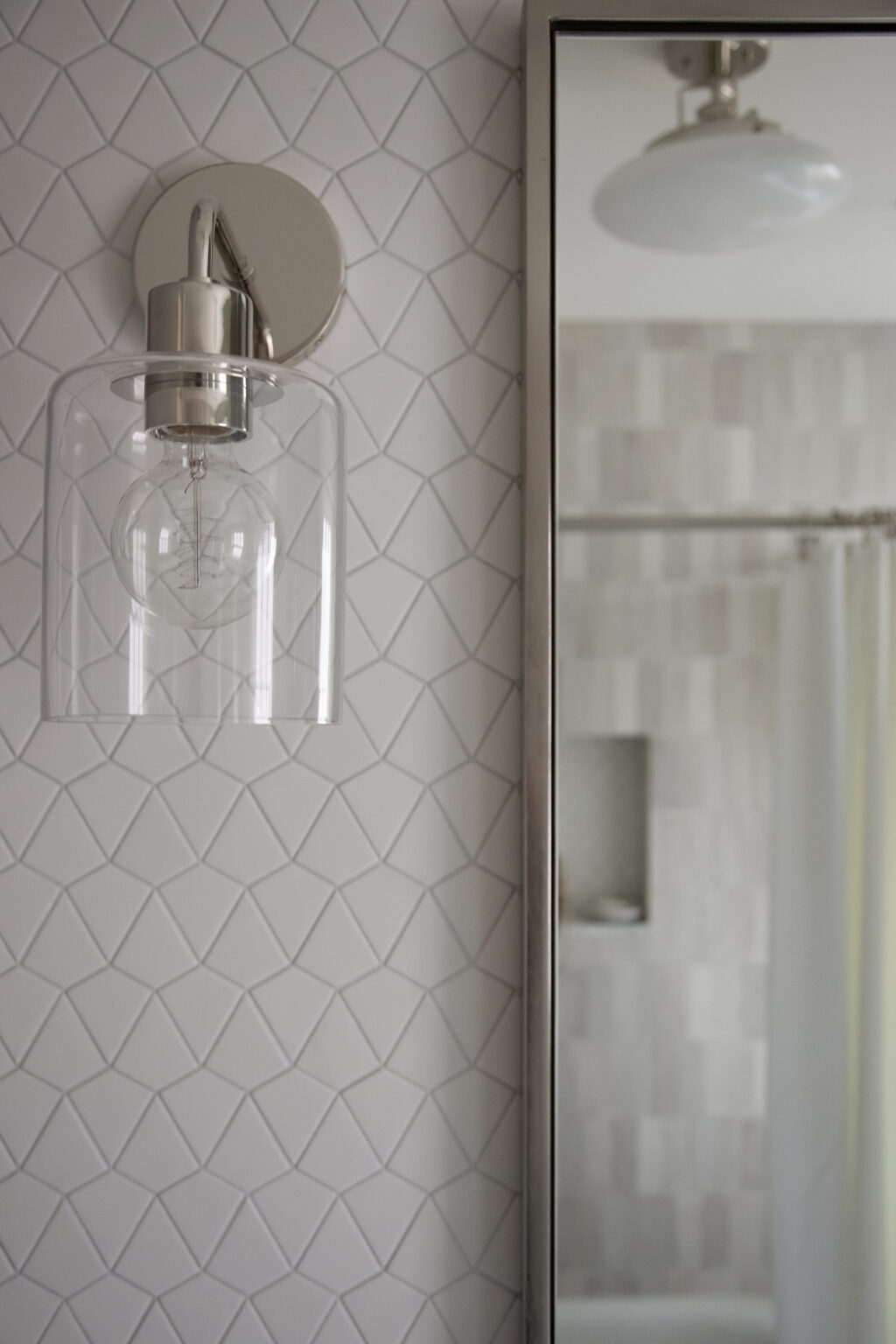 This bathroom remodel brings a modern twist to a traditional bathroom with unique tiling, sleek hardware, and muted colors throughout the space. Three distinct varieties of grey and white tiles fill this space with texture and visual interest.