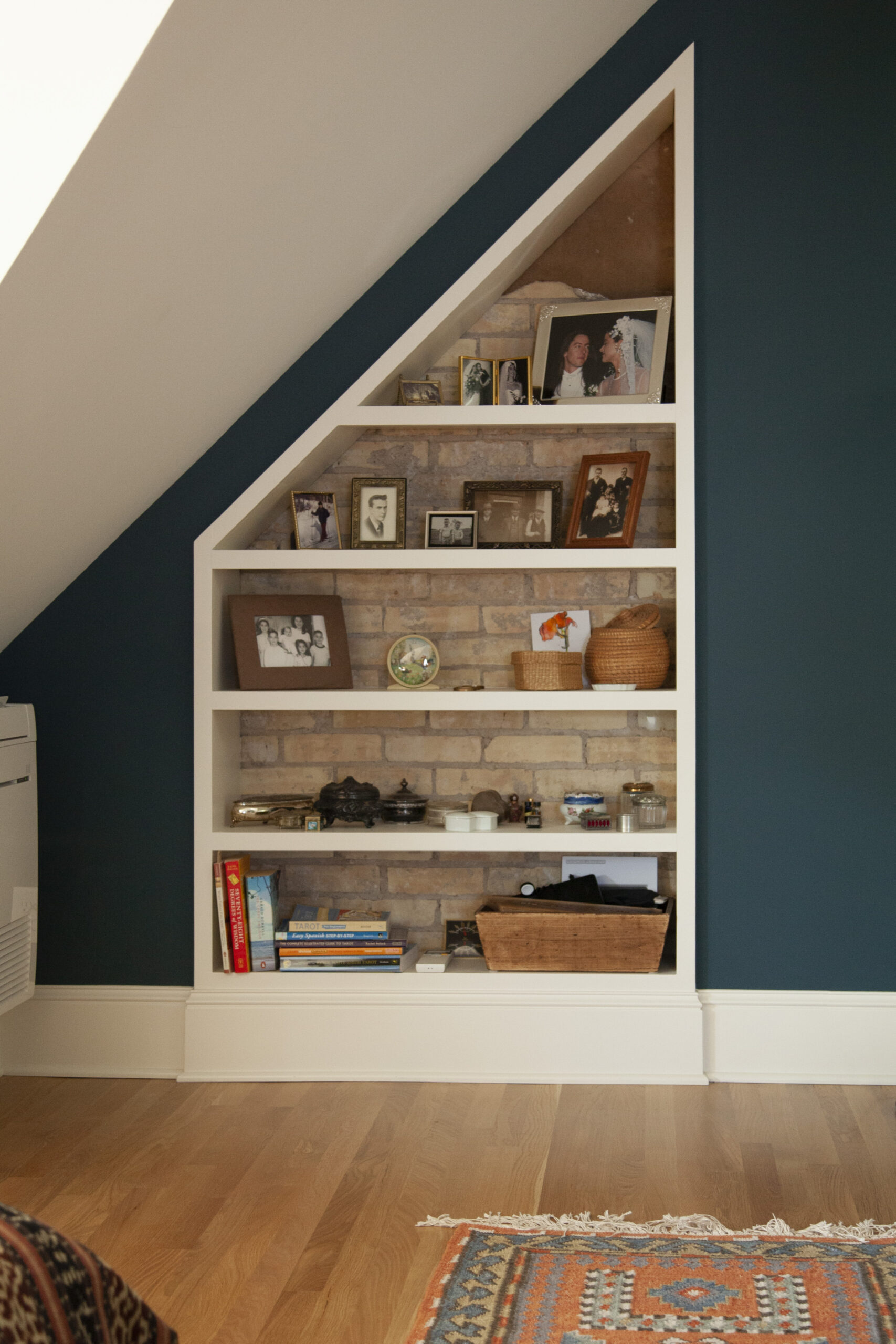 This serene primary suite embraces the unique A-Frame structure of this attic, integrating angled functional storage, shower walls, and a vanity mirror and backsplash to create an intentionally geometric look. Blue accents throughout the space and stunning carrara marble tiling create a clean, modern feel. An updated staircase offers a cohesive flow from the lower levels of the home into this newly renovated retreat.