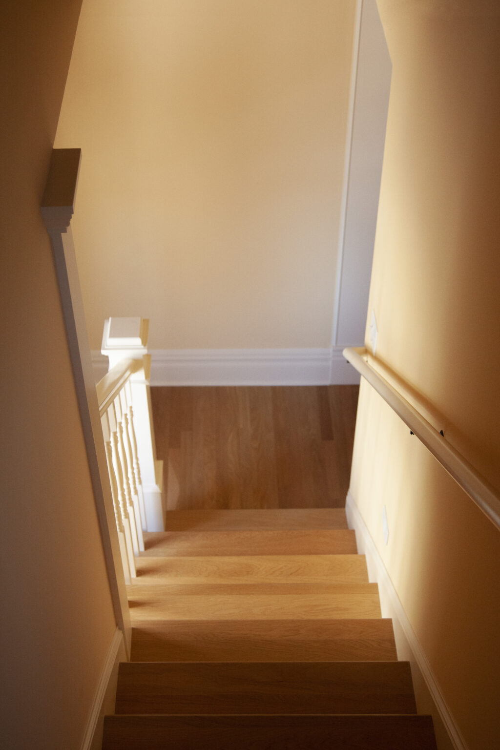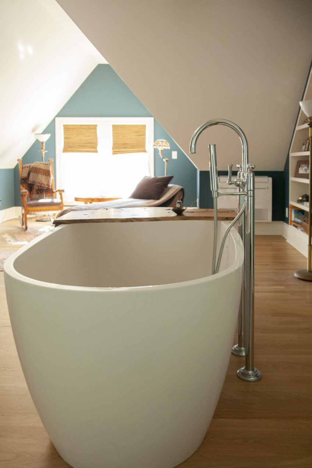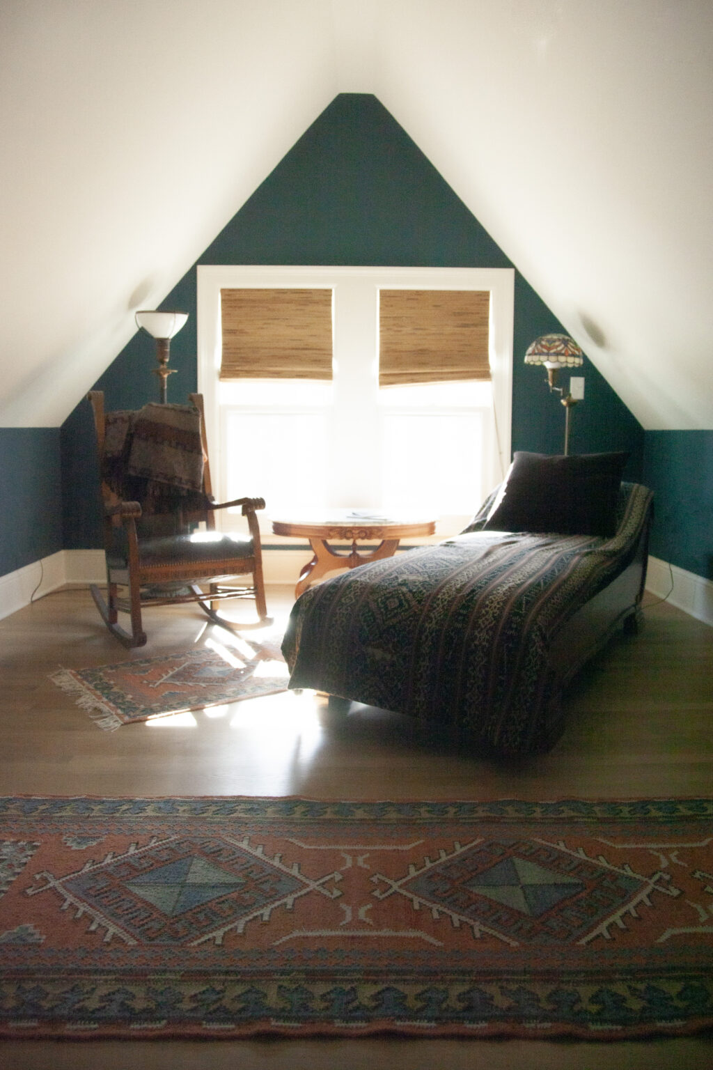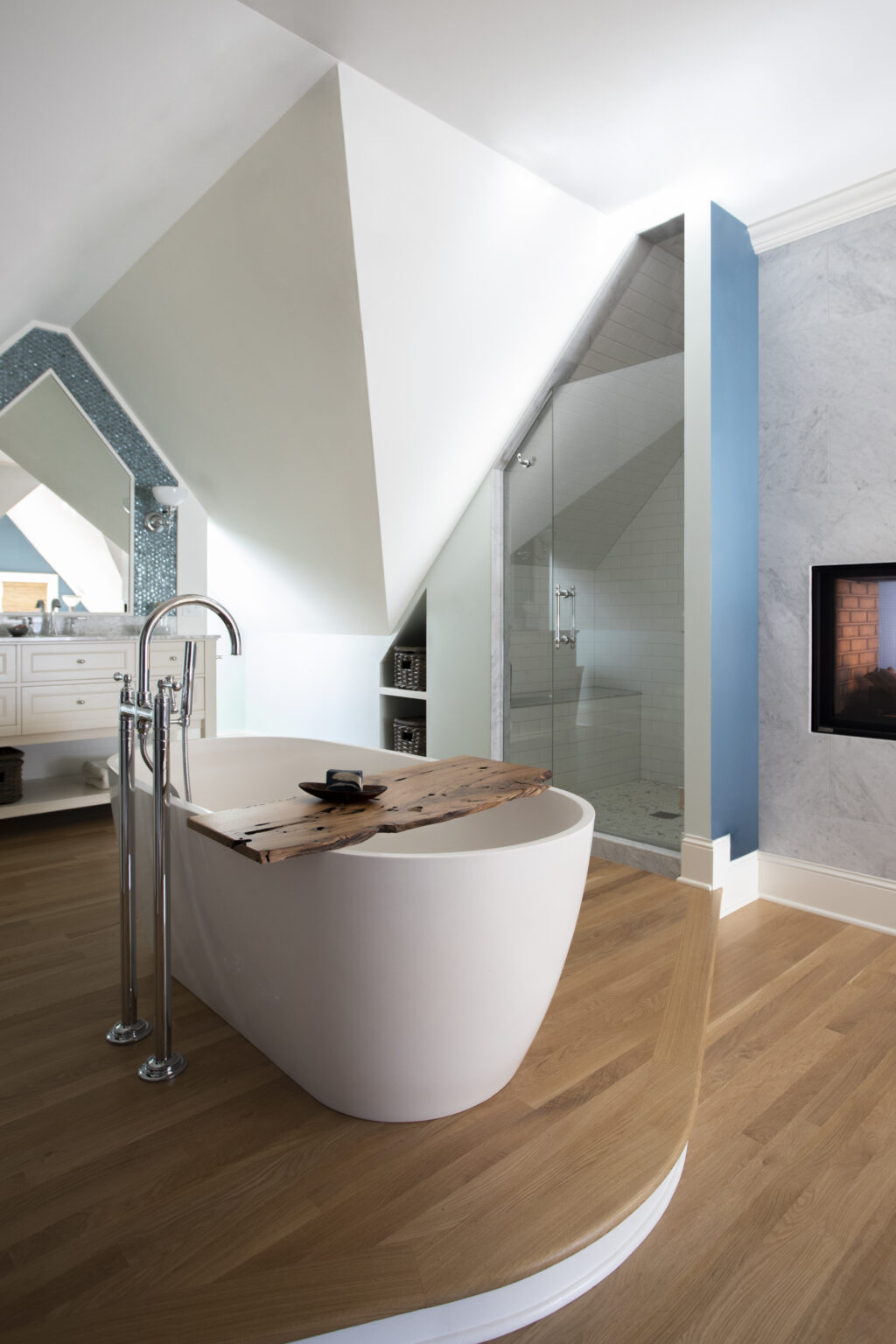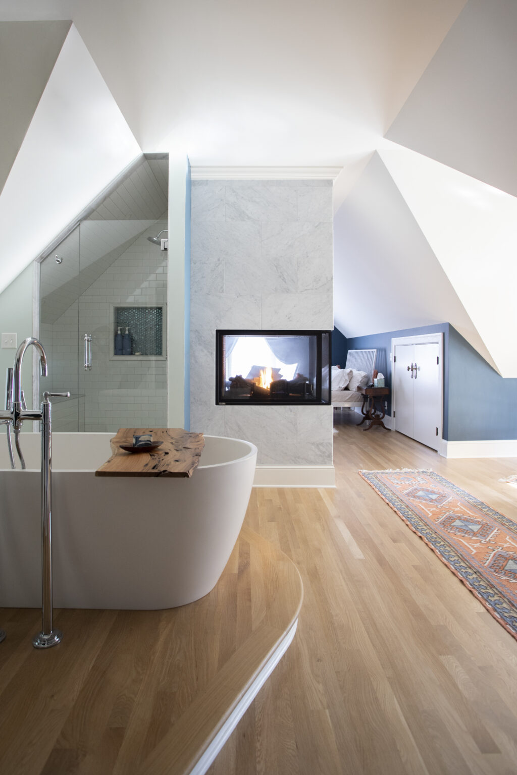 This serene primary suite embraces the unique A-Frame structure of this attic, integrating angled functional storage, shower walls, and a vanity mirror and backsplash to create an intentionally geometric look. Blue accents throughout the space and stunning carrara marble tiling create a clean, modern feel. An updated staircase offers a cohesive flow from the lower levels of the home into this newly renovated retreat.